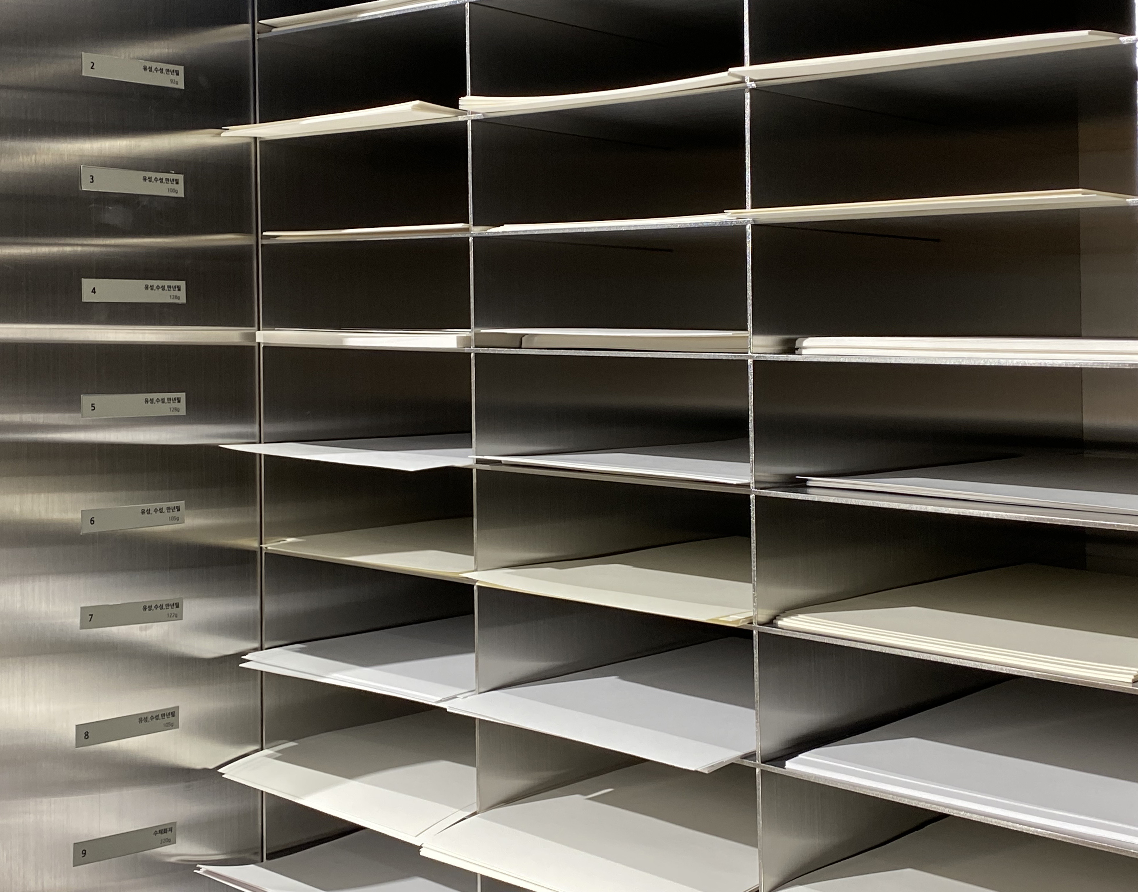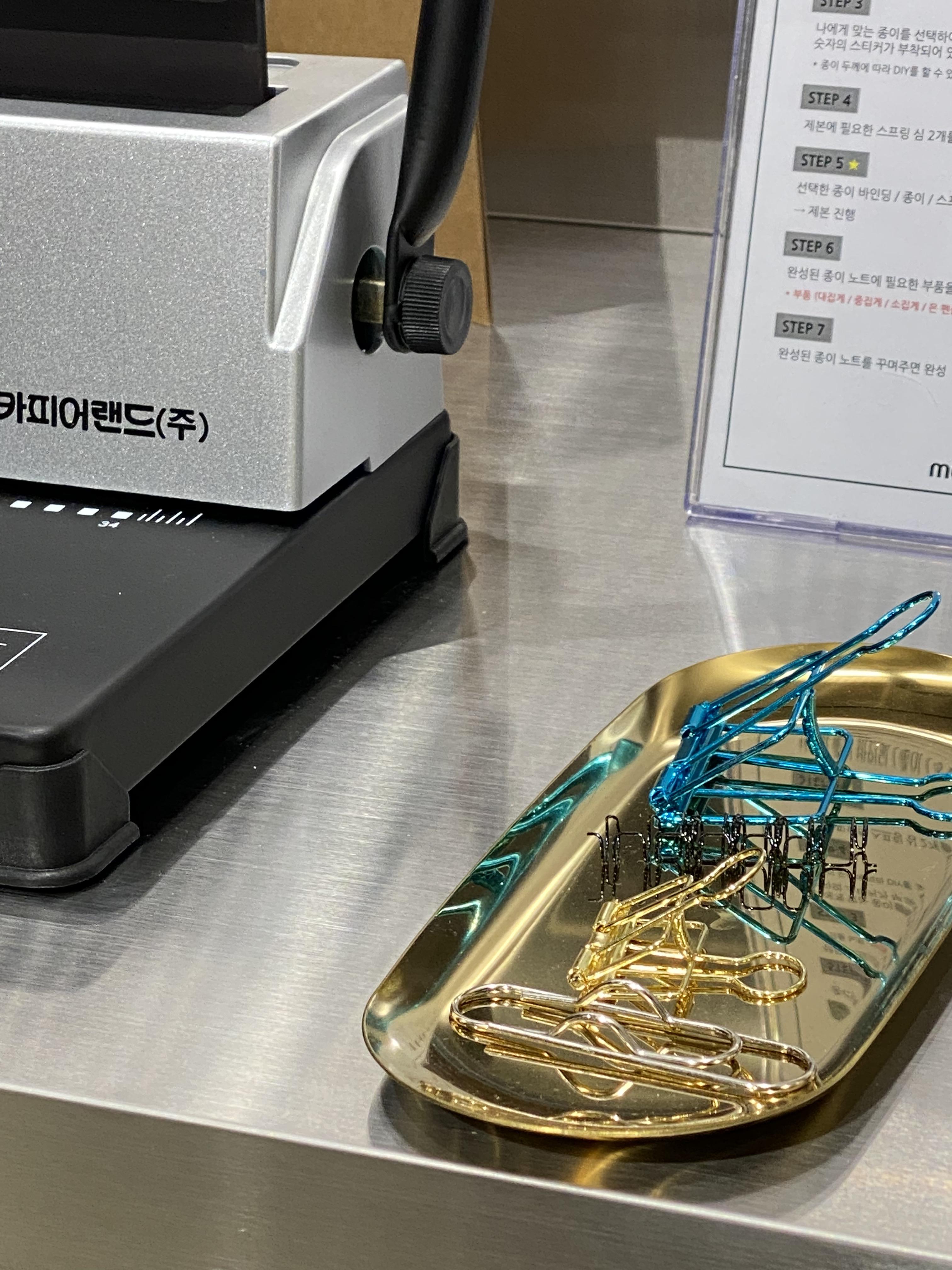 모나미 스토어만의 특별한 체험 중 두 번째는 나만의 노트 DIY입니다. 이 체험은 따로 예약하지 않아도 이용이 가능하고 내가 좋아하는 종이의 질감까지 선택할 수 있다는 것이 상당히 매력적이었어요. 미끄러지듯 쓰이는 필기감을 좋아하는 분들도 있고, 사각사각 크레파스같이 오돌토돌한 도화지 타입의 종이에 쓰는 것을 좋아하는 분들도 있으실 거예요. 본인이 원하는 취향의 종이의 질감을 손으로 만지고 고를 수 있다는 것이 좋더라고요. 마음에 드는 종이를 선택해 DIY 제작을 요청하시면 직원분이 옆에 있는 기기에서 스프링 노트를 뚝딱 제본해 주십니다.