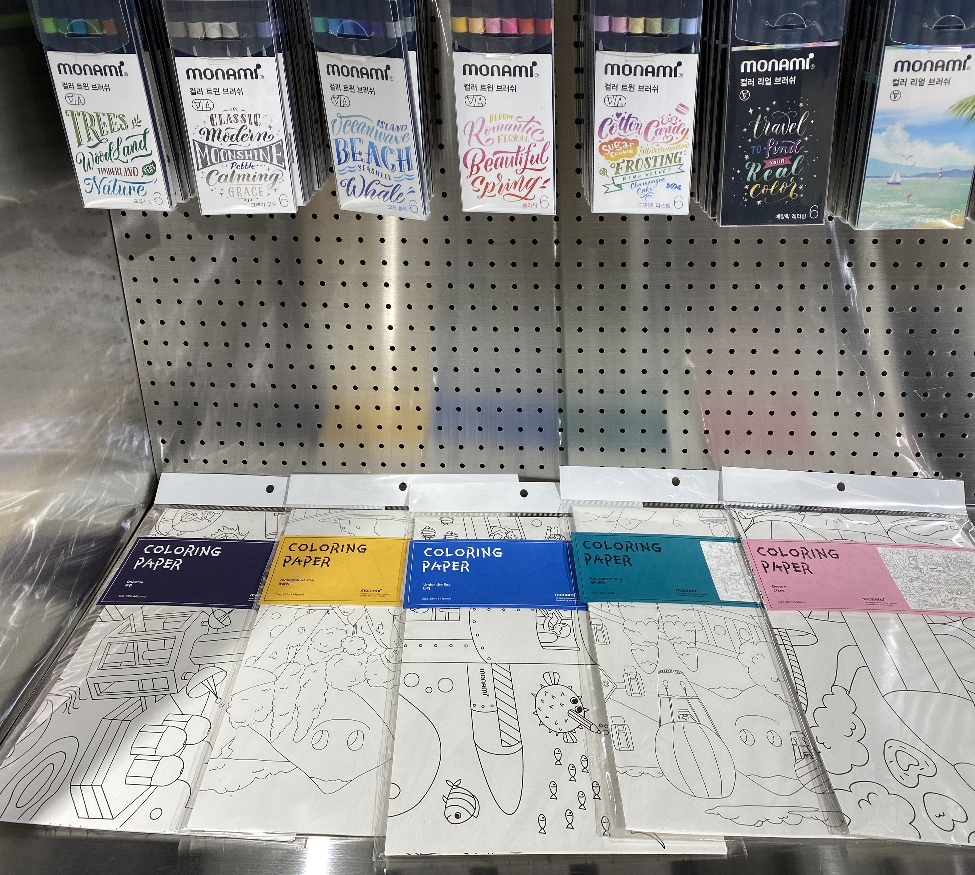 모나미 스토어에는 볼펜, 노트 외에도 다양한 굿즈와 상품들이 자리하고 있습니다. 다양한 컬러의 색연필과 형광펜, 사인펜도 있는 모나미! 옆에 빈 종이에 테스트해 볼 수 있게 준비되어 있어서 시간 가는 줄 모르고 테스트를 해봤던 것 같아요. 드로잉이나 색칠하기를 좋아하신다면 도안이 그려져 있는 키트를 구매하여 여유 시간에 사각사각 채색하고 있으면 힐링할 수 있는 시간을 가질 수 있을 것 같아요.