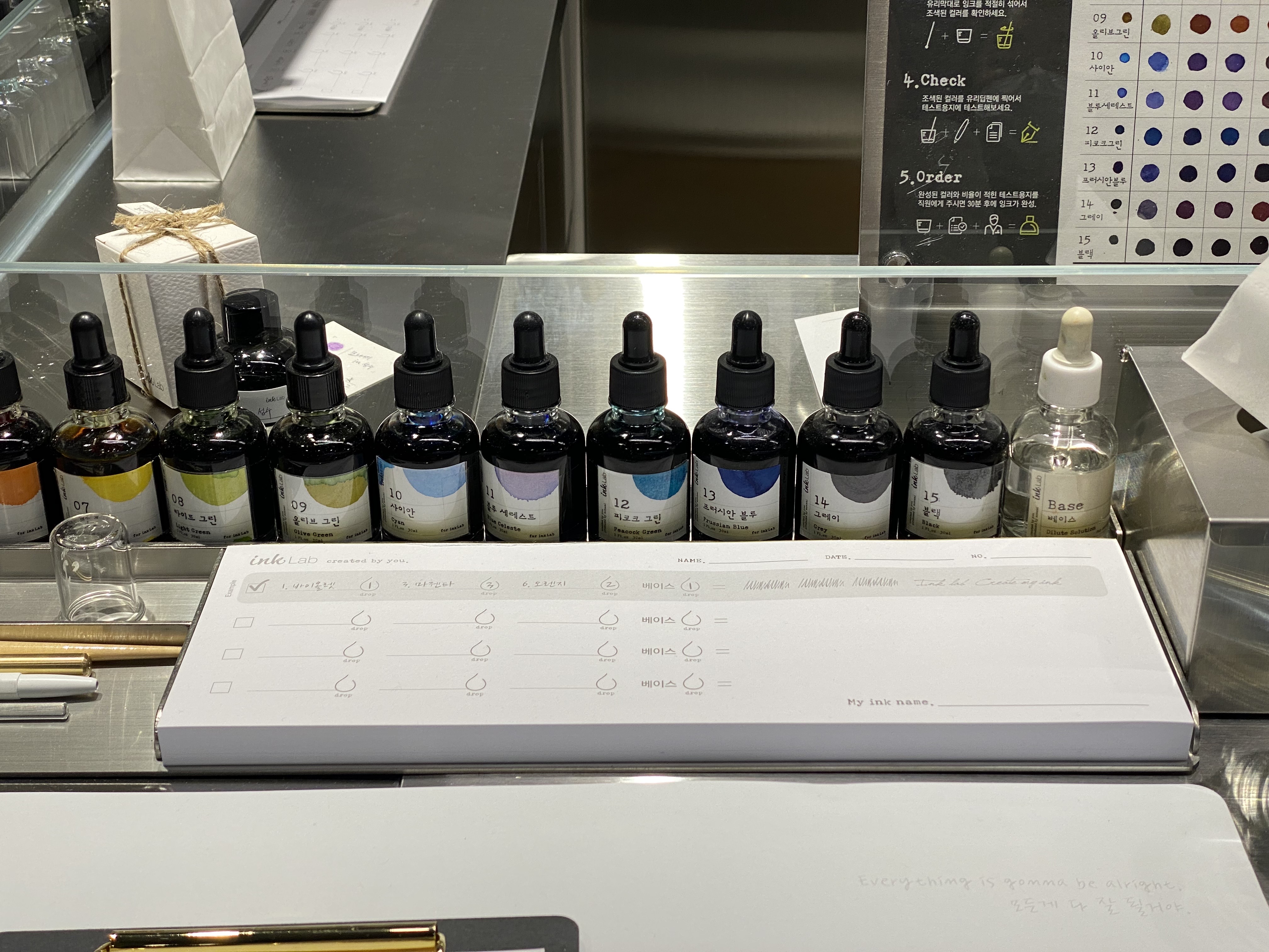 다양한 컬러의 잉크를 어느 정도의 양으로 조합하느냐에 따라 정말 수백수천 가지의 색이 나올 수 있는데요. 만 명의 사람이 있다면 만 개의 취향이 있듯이 우리 모두가 좋아하는 컬러 취향은 조금씩이라도 다를 수밖에 없잖아요. 모나미 잉크랩은 그런 만족도를 100% 충족시켜줄 수 있는 곳입니다. 약 1시간 30분 동안 체험할 수 있으며 잉크 조합은 원하는 만큼 다양하게 테스트해 볼 수 있다고 해요.