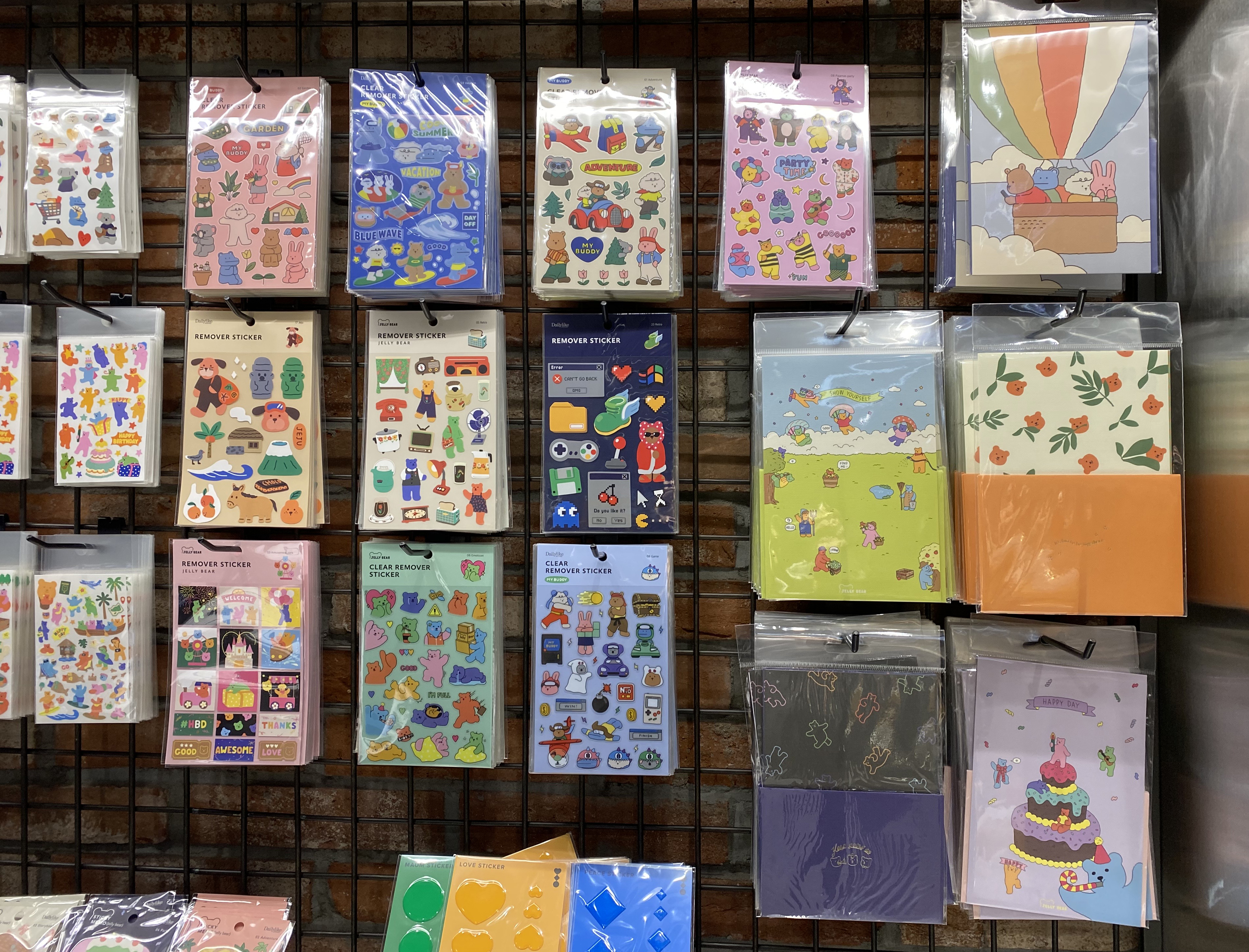 필기구 외에는 기성 컬러의 잉크와 스티커, 열쇠고리, 선물용 모나미 포장 세트 등 다양한 굿즈들이 구매 가능하도록 전시되어 있습니다. 사실 이 공간에서 가장 많은 시간을 할애하여 쇼핑을 했는데요. 편지를 쓰거나 다이어리를 꾸미는 것을 좋아하시는 분이라면 귀여운 스티커를 지나치기 힘든 곳이었어요. 모나미의 새로운 캐릭터들인지, 귀여운 젤리 친구들이 너무 사랑스럽더라고요. 여기저기 다이어리 꾸미고 스티커 붙이는 걸 좋아하는 편이라 저는 스티커만 다섯 세트 넘게 구매했답니다.