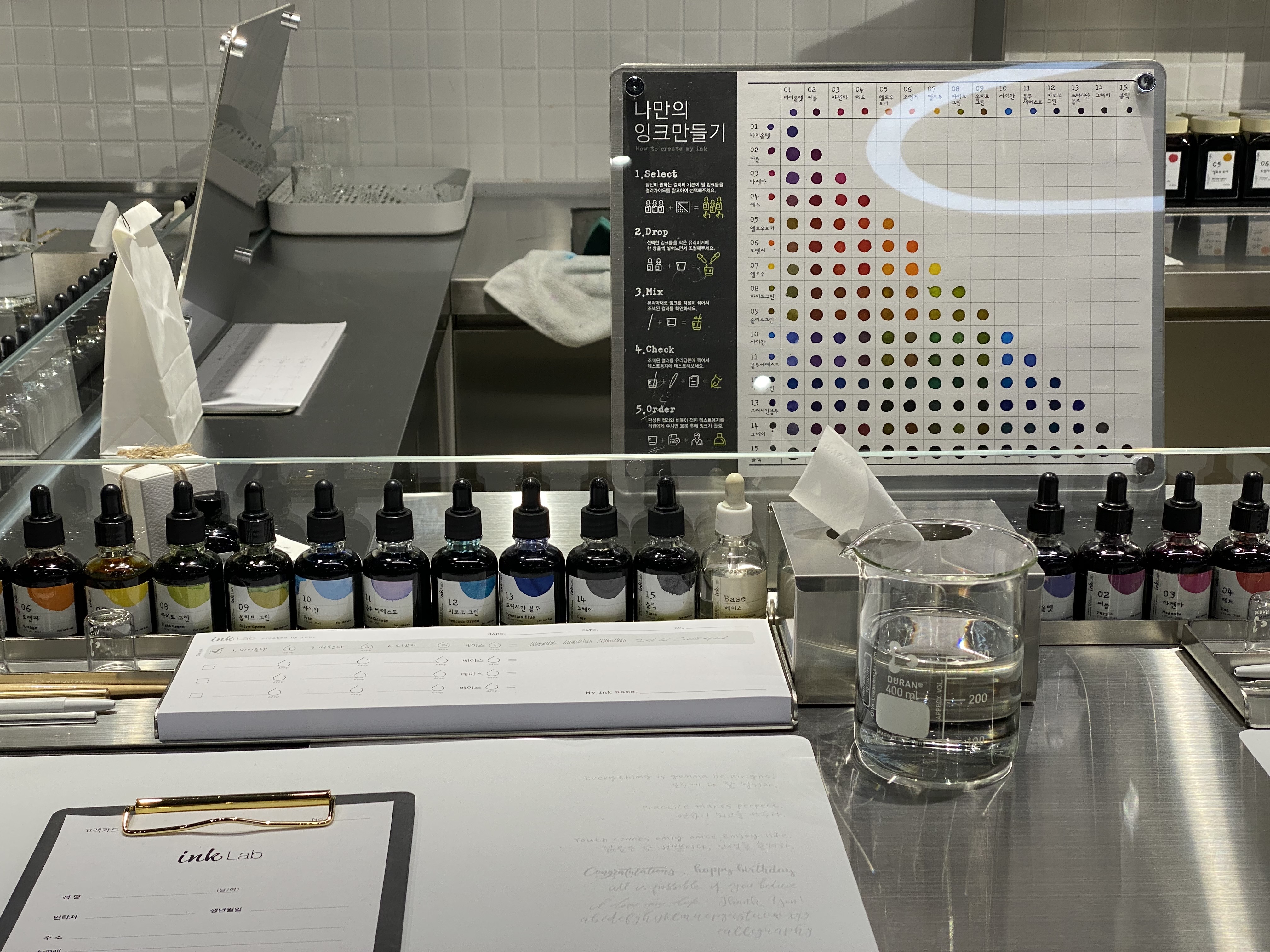 다양한 컬러의 잉크를 어느 정도의 양으로 조합하느냐에 따라 정말 수백수천 가지의 색이 나올 수 있는데요. 만 명의 사람이 있다면 만 개의 취향이 있듯이 우리 모두가 좋아하는 컬러 취향은 조금씩이라도 다를 수밖에 없잖아요. 모나미 잉크랩은 그런 만족도를 100% 충족시켜줄 수 있는 곳입니다. 약 1시간 30분 동안 체험할 수 있으며 잉크 조합은 원하는 만큼 다양하게 테스트해 볼 수 있다고 해요.