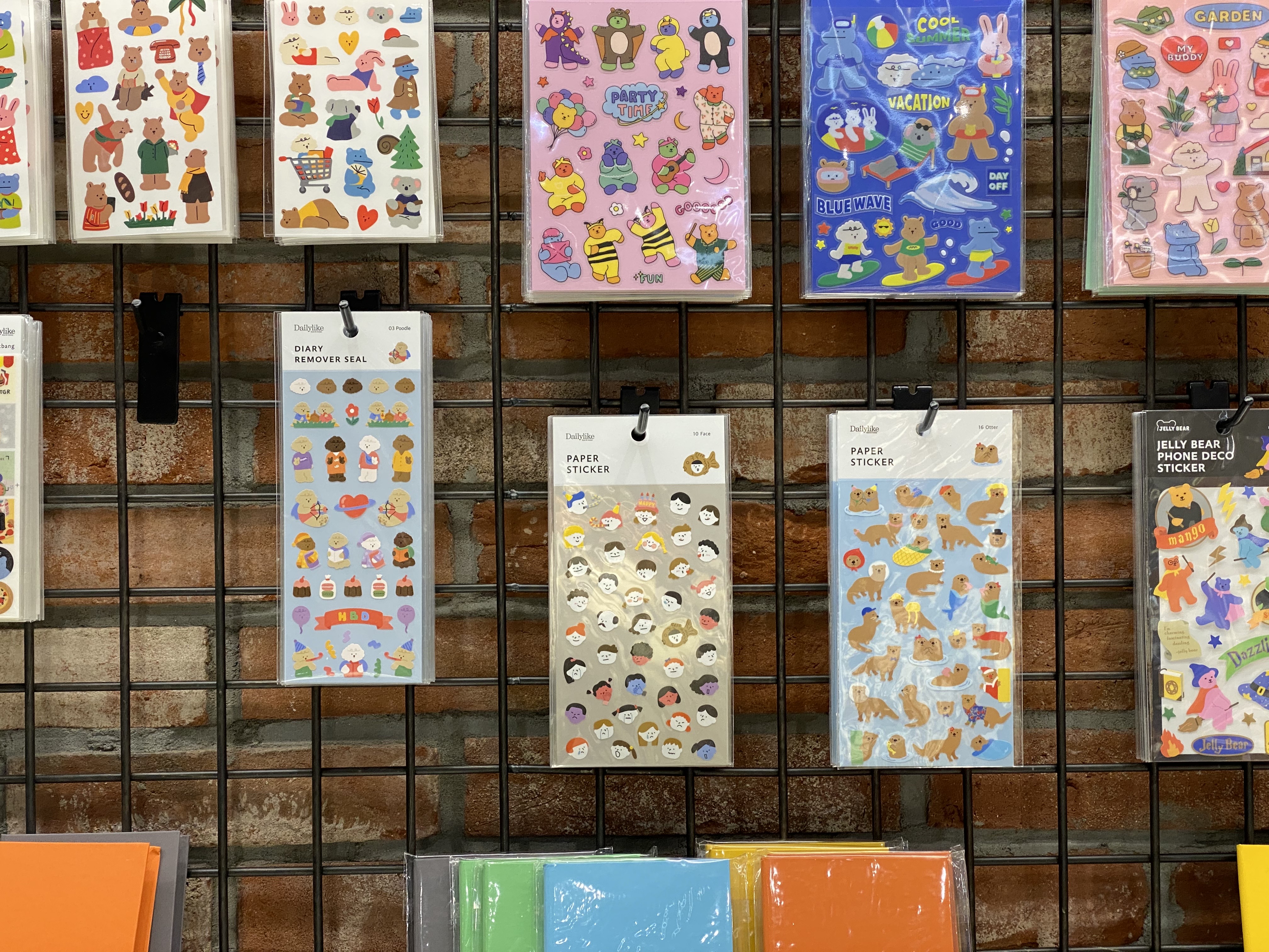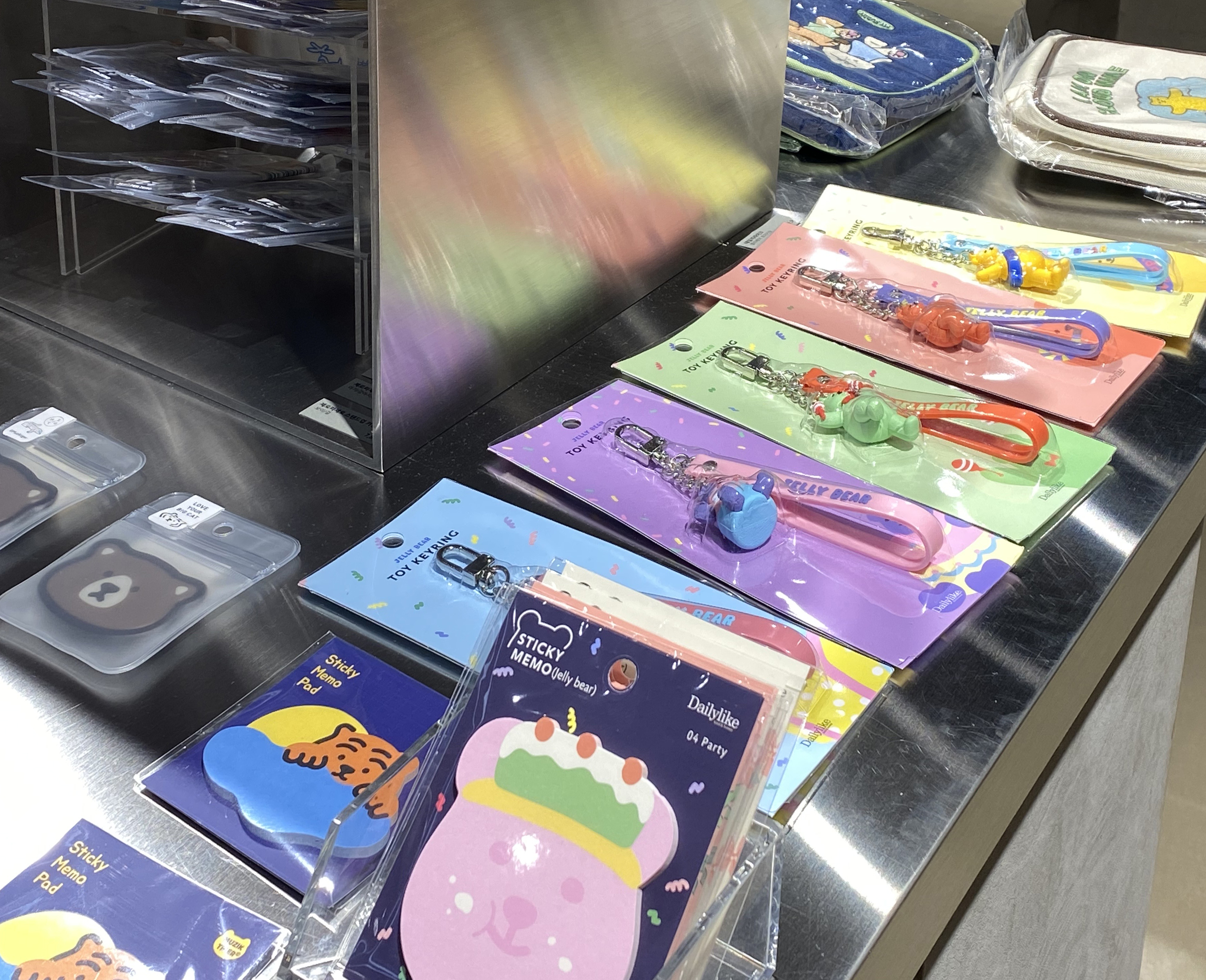 필기구 외에는 기성 컬러의 잉크와 스티커, 열쇠고리, 선물용 모나미 포장 세트 등 다양한 굿즈들이 구매 가능하도록 전시되어 있습니다. 사실 이 공간에서 가장 많은 시간을 할애하여 쇼핑을 했는데요. 편지를 쓰거나 다이어리를 꾸미는 것을 좋아하시는 분이라면 귀여운 스티커를 지나치기 힘든 곳이었어요. 모나미의 새로운 캐릭터들인지, 귀여운 젤리 친구들이 너무 사랑스럽더라고요. 여기저기 다이어리 꾸미고 스티커 붙이는 걸 좋아하는 편이라 저는 스티커만 다섯 세트 넘게 구매했답니다.