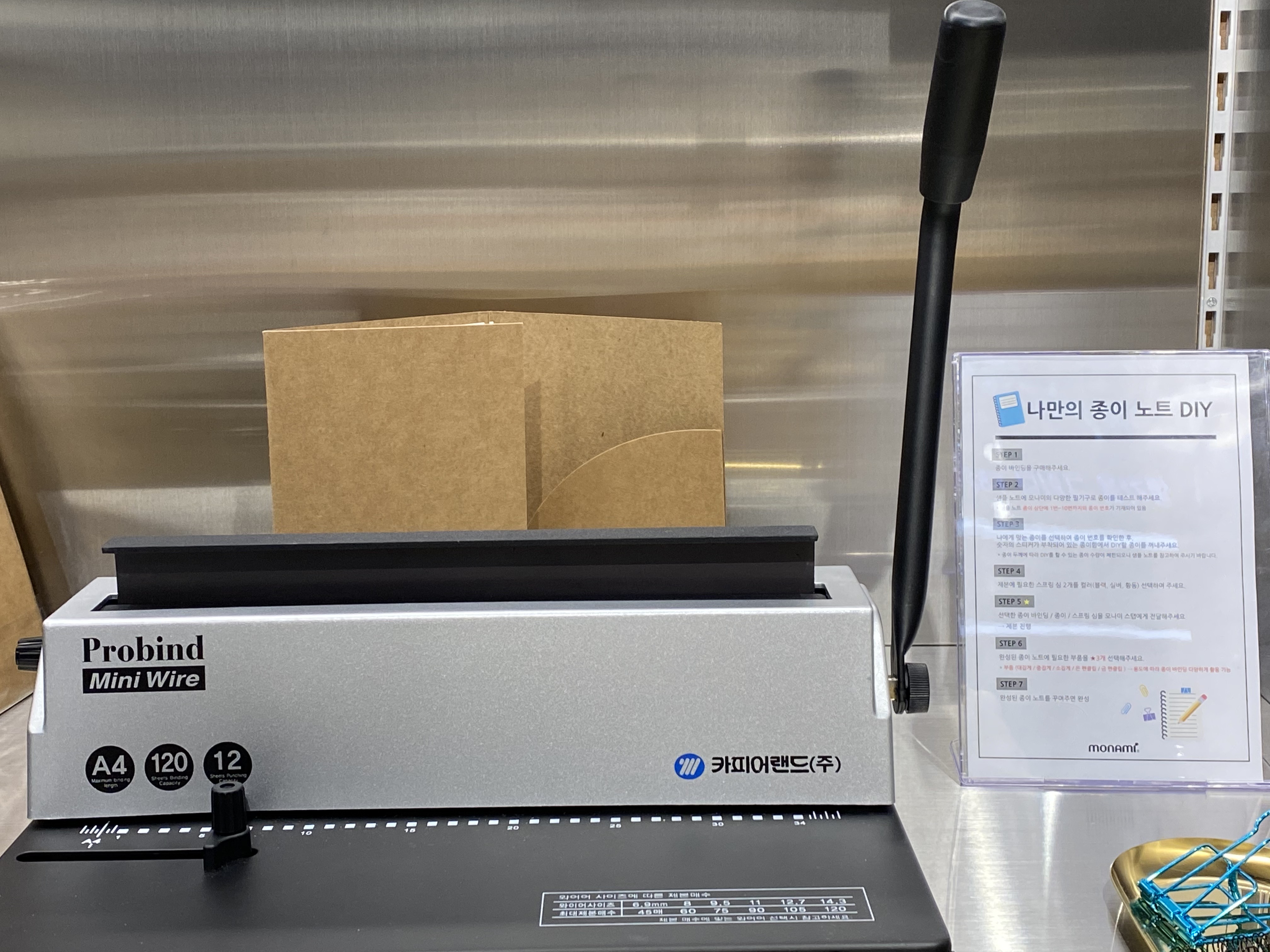 모나미 스토어만의 특별한 체험 중 두 번째는 나만의 노트 DIY입니다. 이 체험은 따로 예약하지 않아도 이용이 가능하고 내가 좋아하는 종이의 질감까지 선택할 수 있다는 것이 상당히 매력적이었어요. 미끄러지듯 쓰이는 필기감을 좋아하는 분들도 있고, 사각사각 크레파스같이 오돌토돌한 도화지 타입의 종이에 쓰는 것을 좋아하는 분들도 있으실 거예요. 본인이 원하는 취향의 종이의 질감을 손으로 만지고 고를 수 있다는 것이 좋더라고요. 마음에 드는 종이를 선택해 DIY 제작을 요청하시면 직원분이 옆에 있는 기기에서 스프링 노트를 뚝딱 제본해 주십니다.