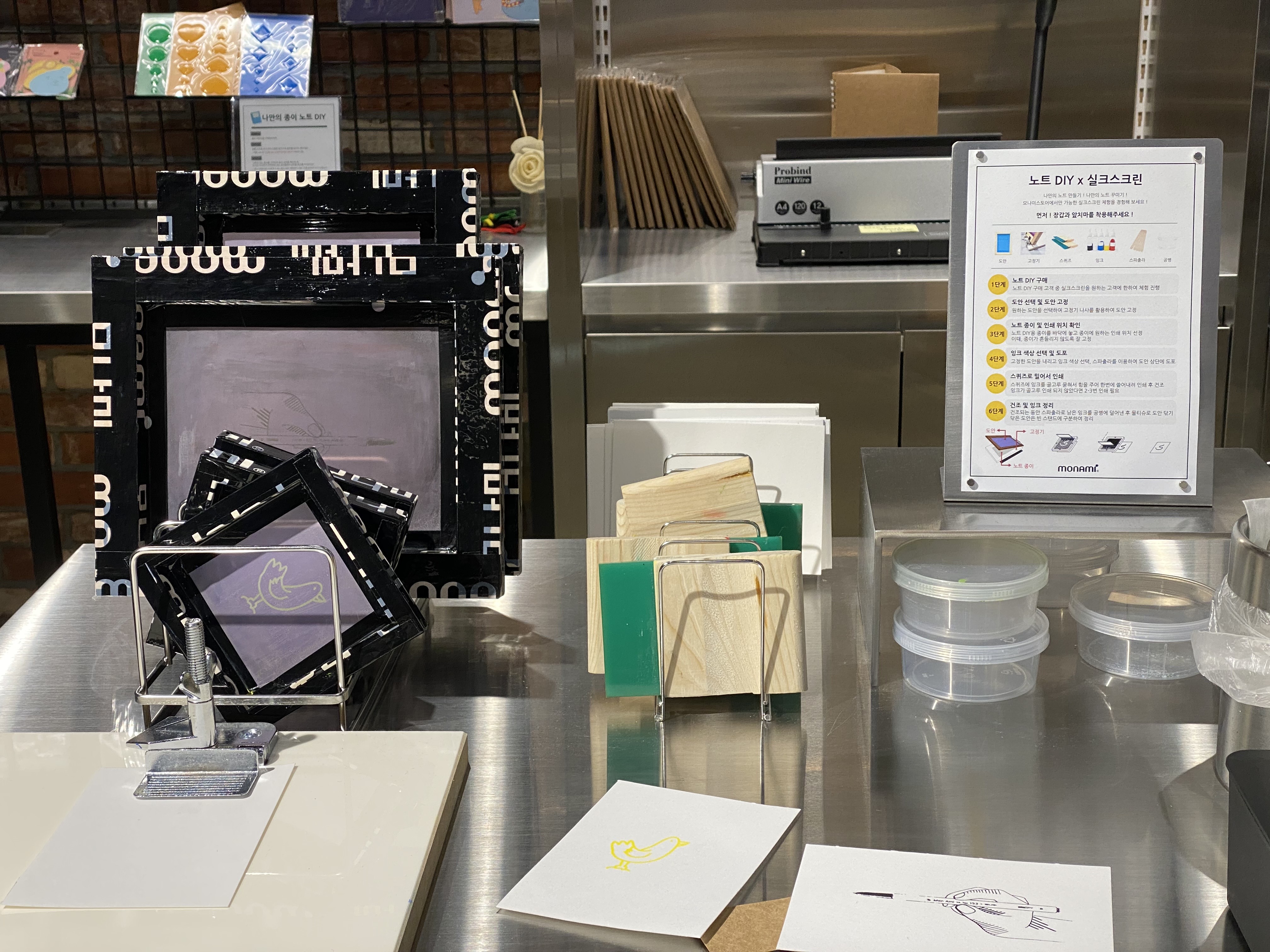완성된 노트는 위에 실크스크린 기법을 활용해 노트의 표지 꾸미기 작업을 할 수 있는데요. 학교에서 판화 수업을 했던 때의 경험을 생각하시면 될 것 같아요. 직원분이 따로 실크스크린을 할 수 있는 방법을 알려주세요. 작업 전에 다른 여분의 종이에 충분히 테스트해 숙련도 또한 높일 수 있었어요. 비치되어 있는 볼펜들로 낙서까지 해주면, 나만의 DIY 노트를 취향에 꼭 맞게 만들어 구매할 수 있으니 모나미 스토어를 방문하실 분들은 잉크랩 예약을 못 하셨다면 DIY 노트 만들기를 꼭 이용해 보세요!