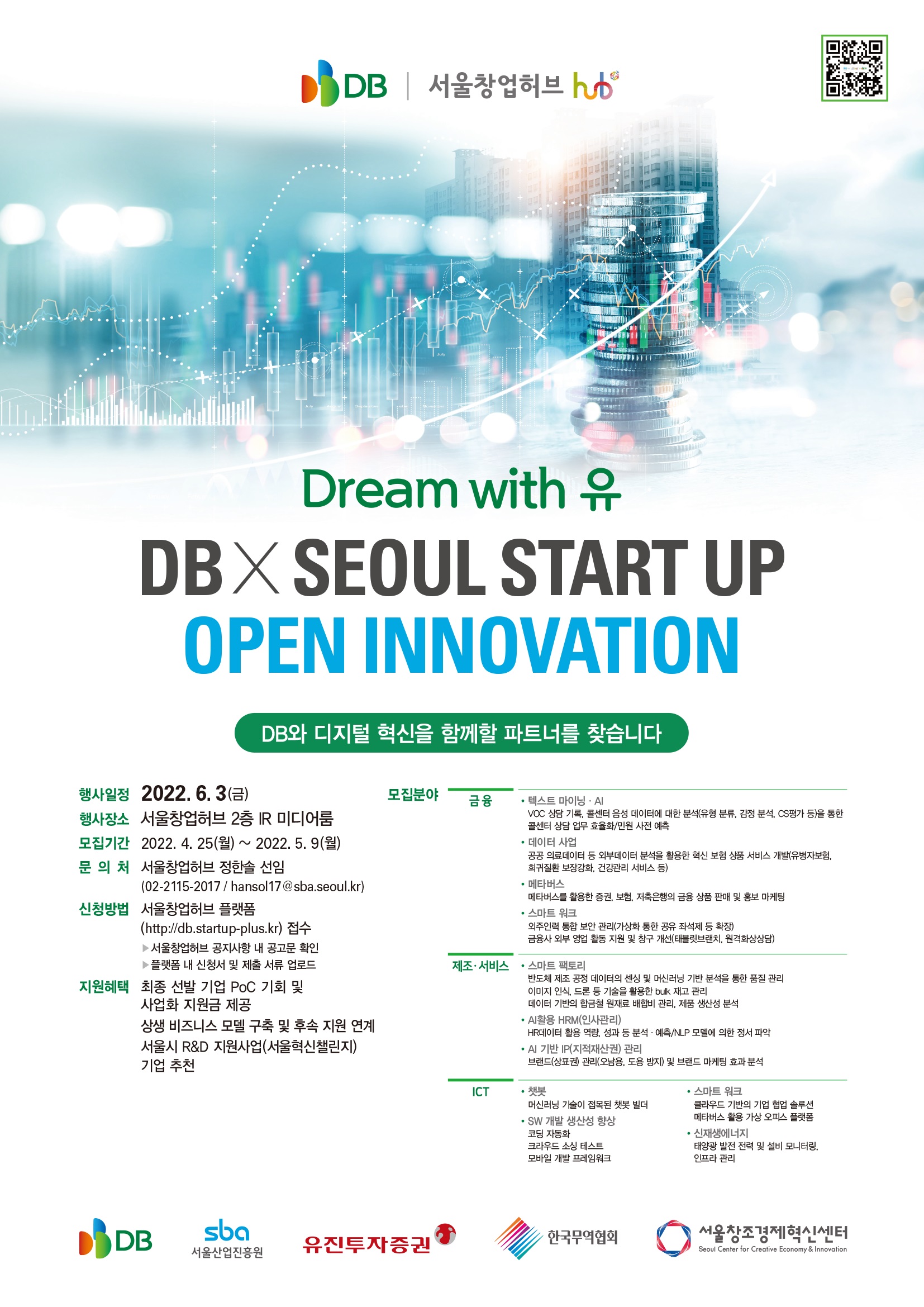 DB Inc.(디비아이엔씨)가 서울창업허브와 협력하여 <Dream with 유 DB×Seoul Start up 오픈이노베이션>에 참여할 2기 스타트업을 모집한다.