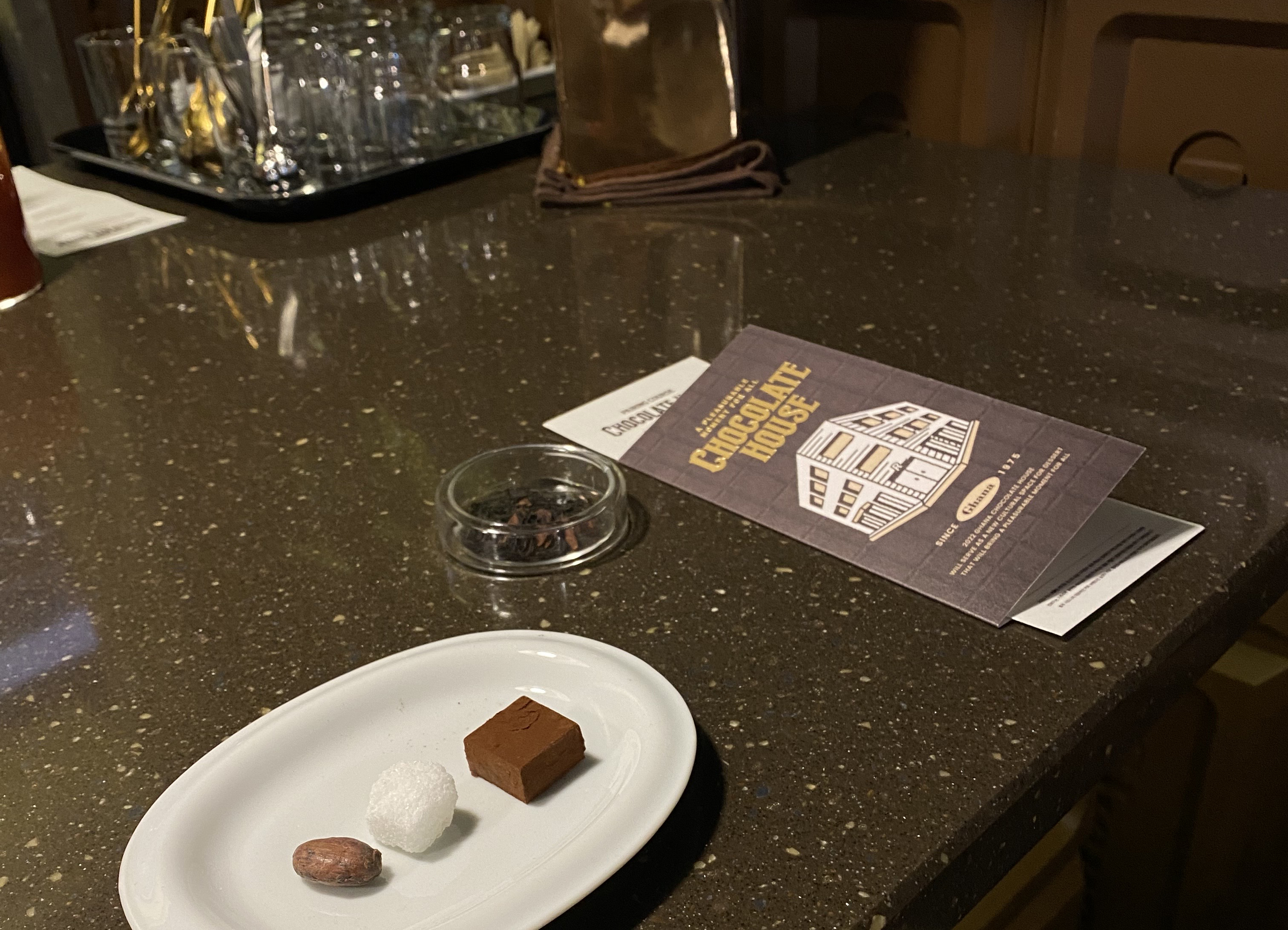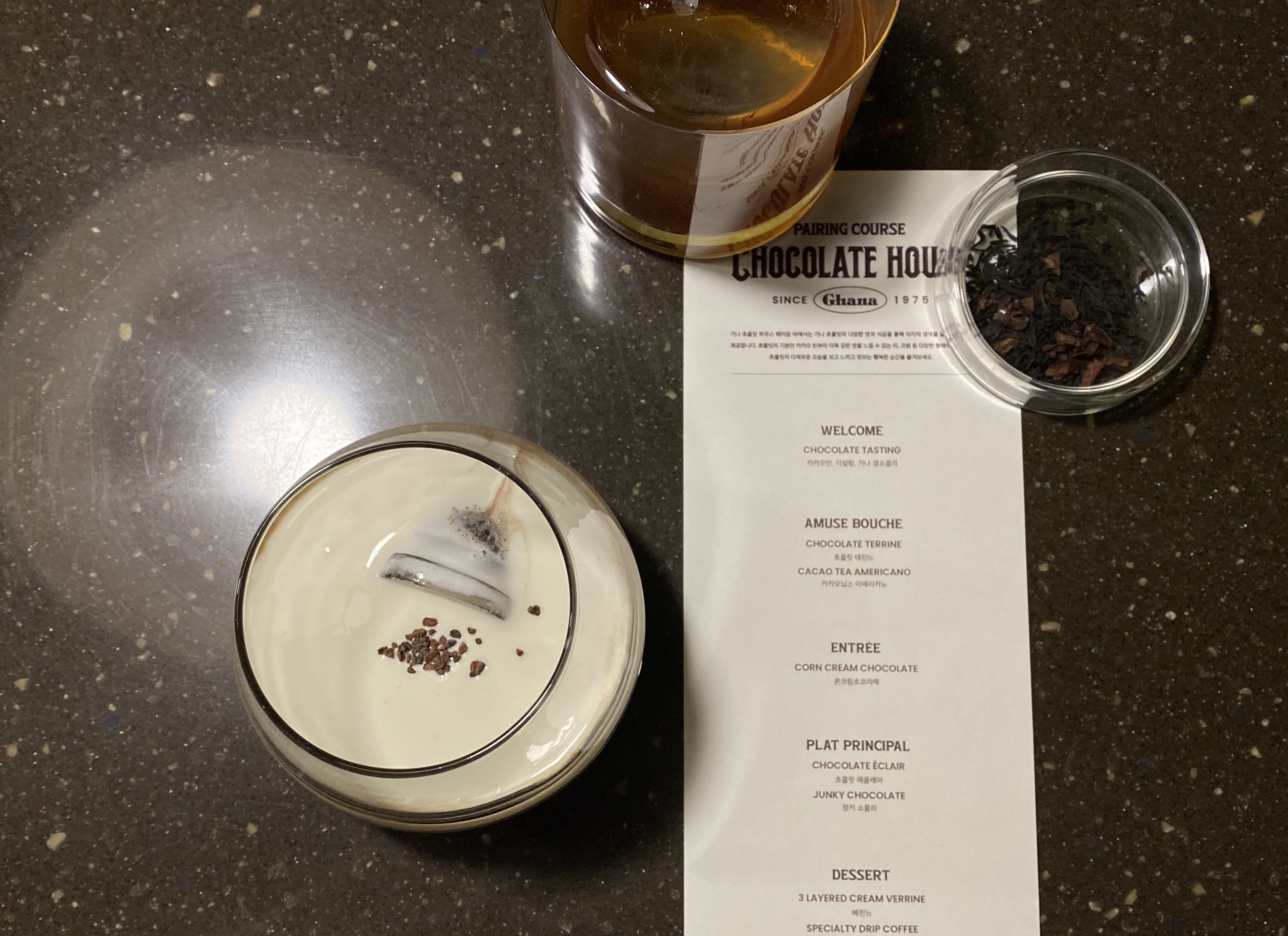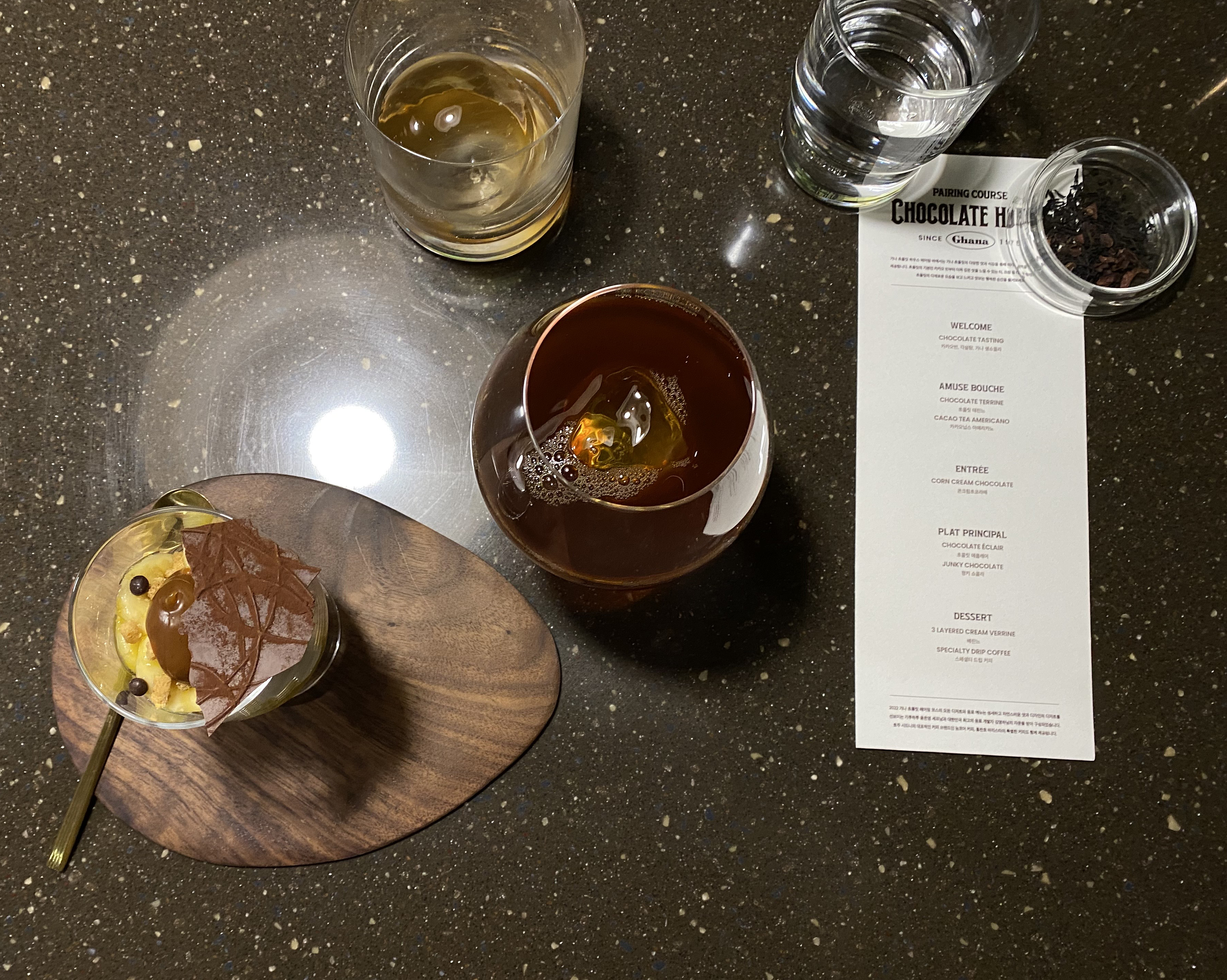 특히 이번 가나초콜릿 하우스를 놓치지 말아야 하는 또 하나의 이유입니다! 디저트 페어링의 모든 코스들은 압구정 가루 하루의 윤은영 셰프님과 국내 최고 음료 개발자 김영하 님의 자문을 받아 구성된 메뉴들이라고 해요. 지난 4월, 5코스의 디저트가 페어링 되는 프로그램에 직접 다녀온 내용을 살짝 소개해 드리겠습니다. 처음 도착했을 때 준비되어 있던 웰컴 푸드는 각설탕 그리고 70퍼센트 농도의 생초콜릿이 순서대로 놓여 있었어요. 초콜릿을 만드는 가장 기본 원료인 카카오 빈을 껍질을 벗겨 꼭꼭 씹으면 쌉싸름하면서도 달콤함이 실제로도 느껴지더라고요. 그때 각설탕을 함께 입안에 넣고 씹어보았는데요. 처음에는 너무 달지 않을까 걱정했는데 카카오빈의 쌉싸름함과 각설탕의 단 맛이 정말 과하지 않게 녹아들었습니다. 함께 제공해 주신 카카오닙스티로 입안을 한번 헹궈준 후에 생초콜릿의 부드러움을 느낄 수 있었습니다!