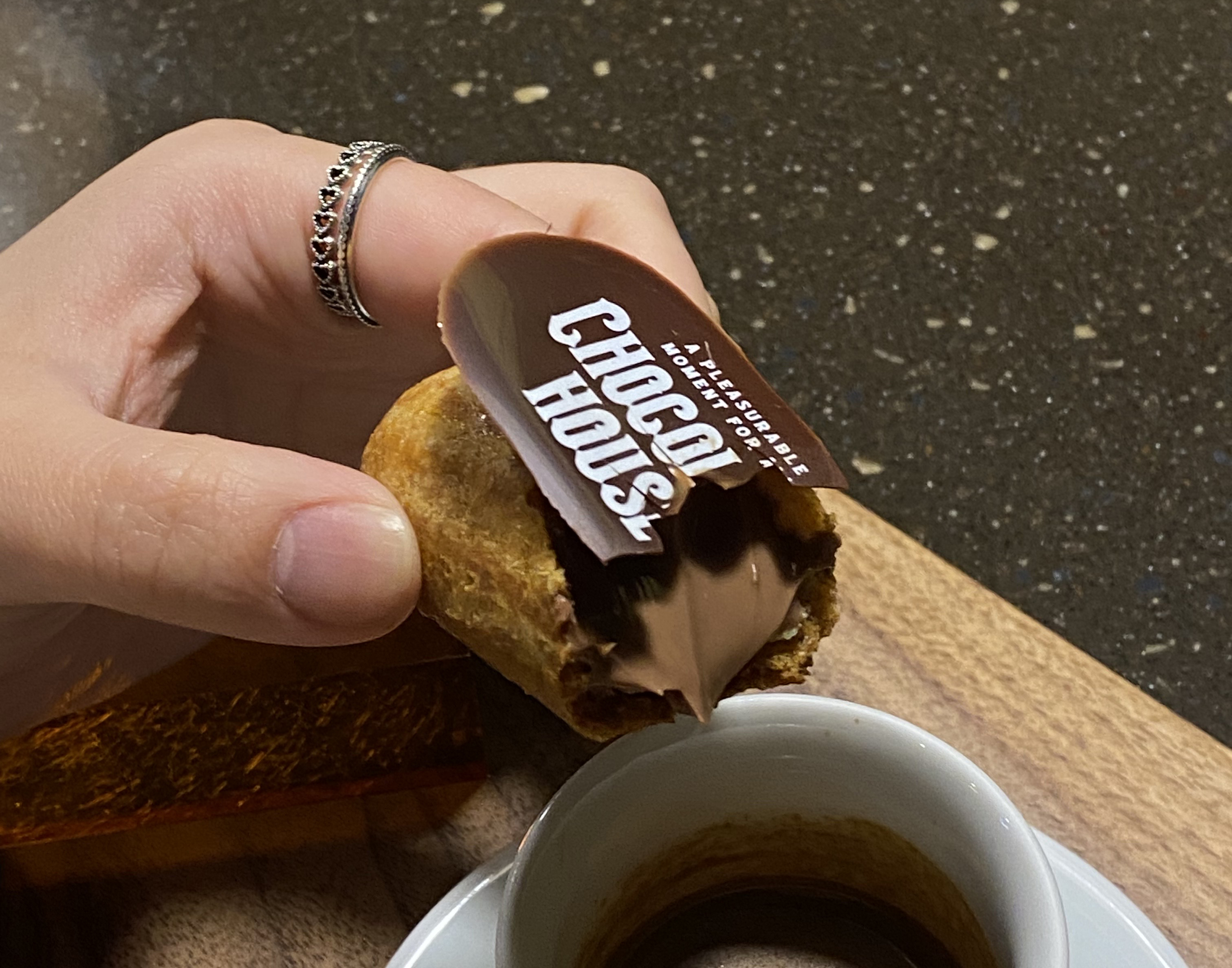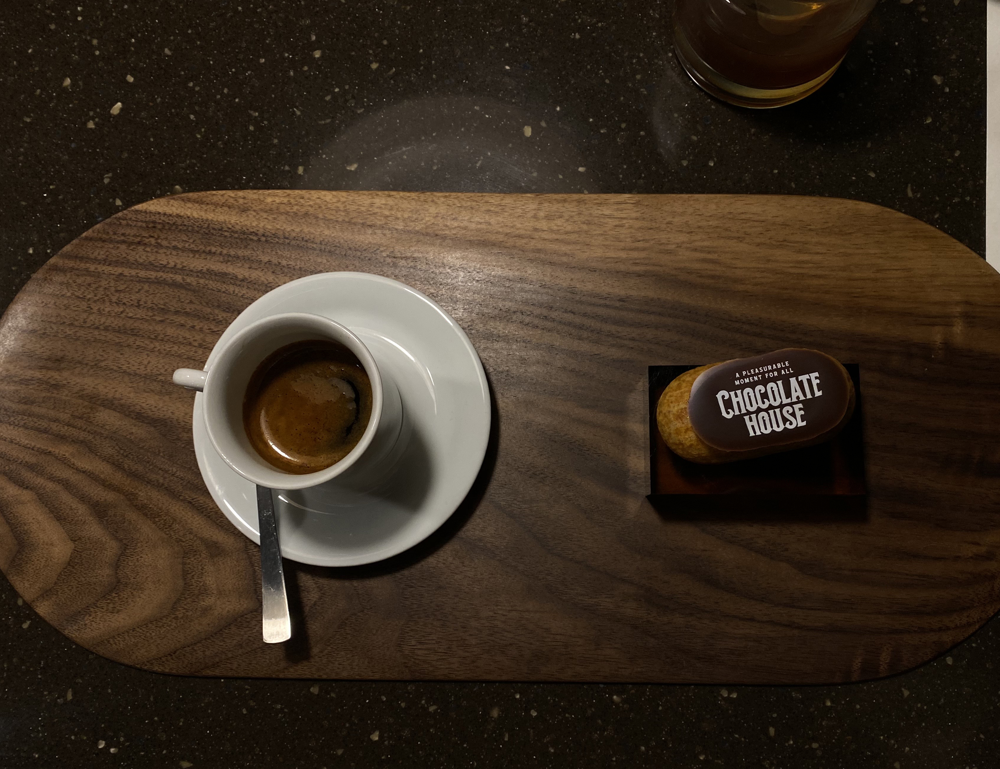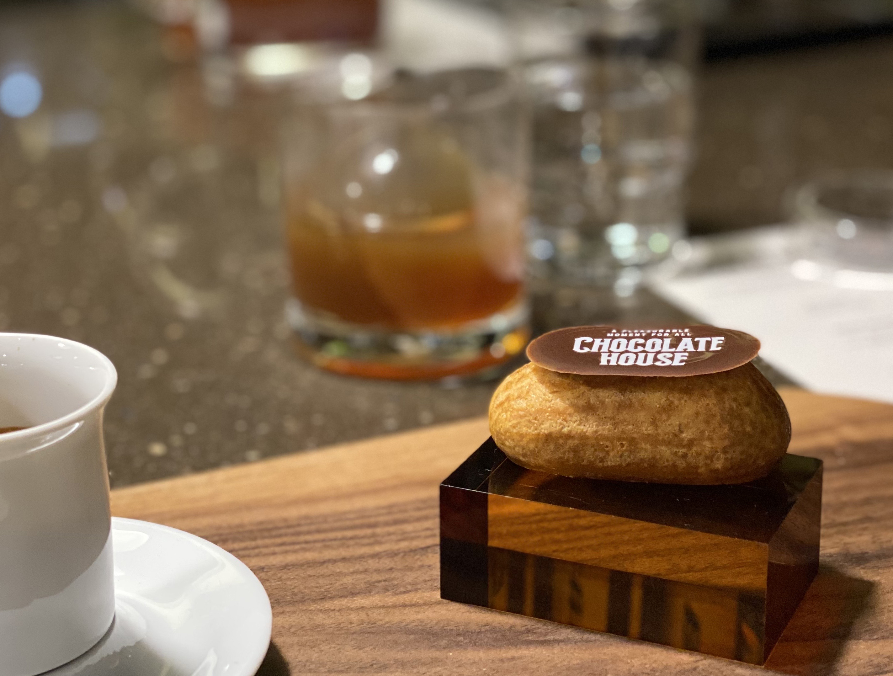 이번 디저트 페어링 코스의 메인입니다! 초콜릿 에클레어와 정키 쇼콜라 인데요. 정키 쇼콜라는 초코바와 땅콩을 액상화해서 에스프레소 아래에 깔아준 에스프레소 음료입니다. 요즘 많이 보이기 시작하는 에스프레소 커피바에 가면 잘 어울릴 것 같은 메뉴이지 않나요? 아래에 가라앉은 초콜릿과 땅콩을 잘 저어 한 입 마셔준 후에는 함께 나온 에클레어를 콕 찍어 먹으면 바삭한 에끌레어의 식감과 정키 쇼콜라의 강렬하고 진한 달콤함, 그리고 에클레어 속 초코 크림의 부드러움을 한 번에 느낄 수 있습니다.