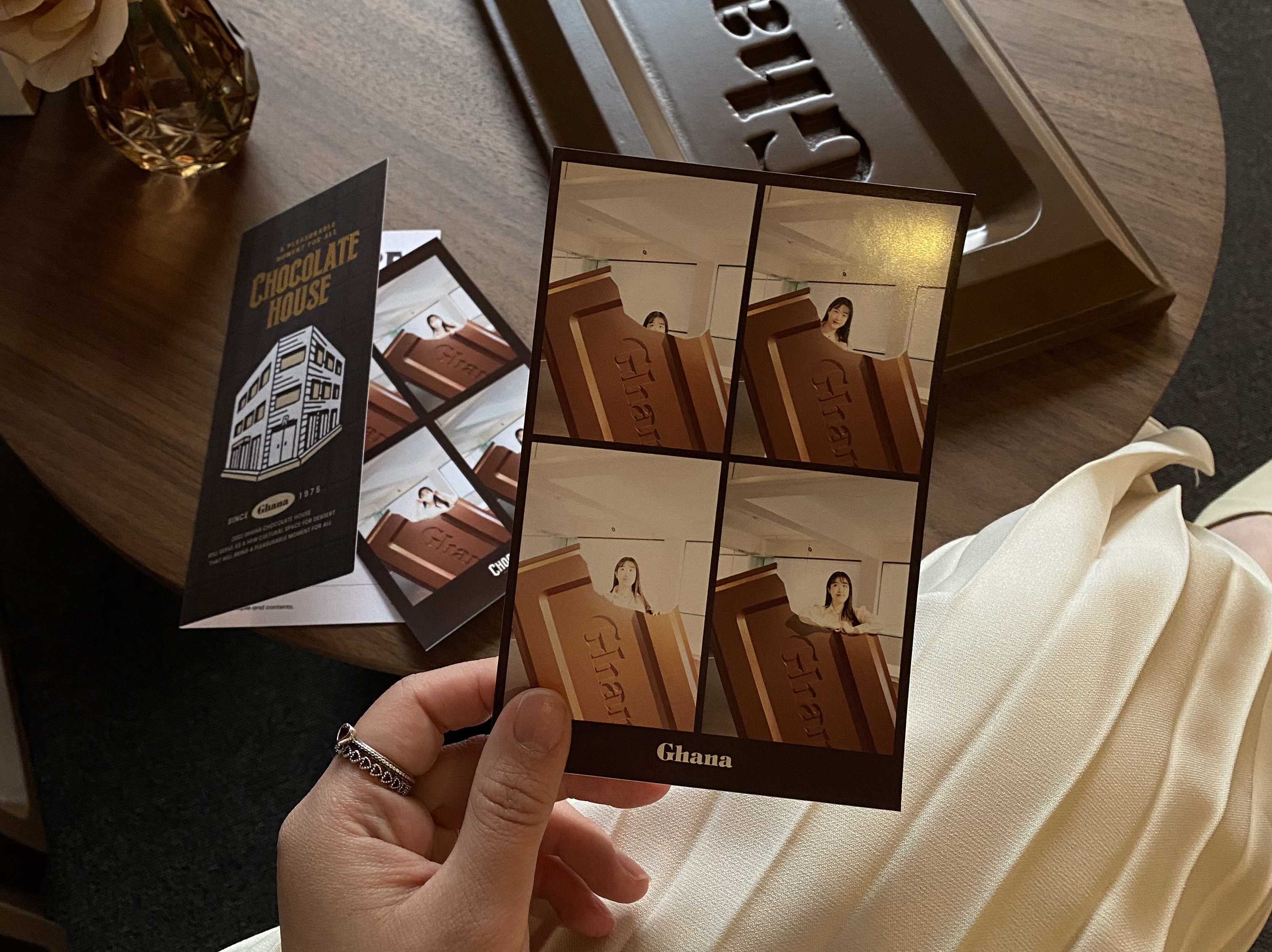 요즘 팝업스토어에는 이런 즉석 사진 기계, 필수죠? 초콜릿 하우스 2층에 준비되어 있는 즉석 사진 기계는 1,000원으로 이용이 가능했는데요. 사진기 바로 앞에 거대한 사이즈의 한 입 베어 문 초콜릿 바가 놓여 있어서 저처럼 이렇게 초콜릿 바 뒤로 가서 컨셉 사진을 찍어도 특별한 사진이 될 것 같습니다. 너무 가까이에서 사진을 찍고 싶지 않아서 뒤로 갔는데, 위치가 딱 초콜릿 바를 이용해 사진을 찍을 수 있도록 계획한 것 같더라고요!