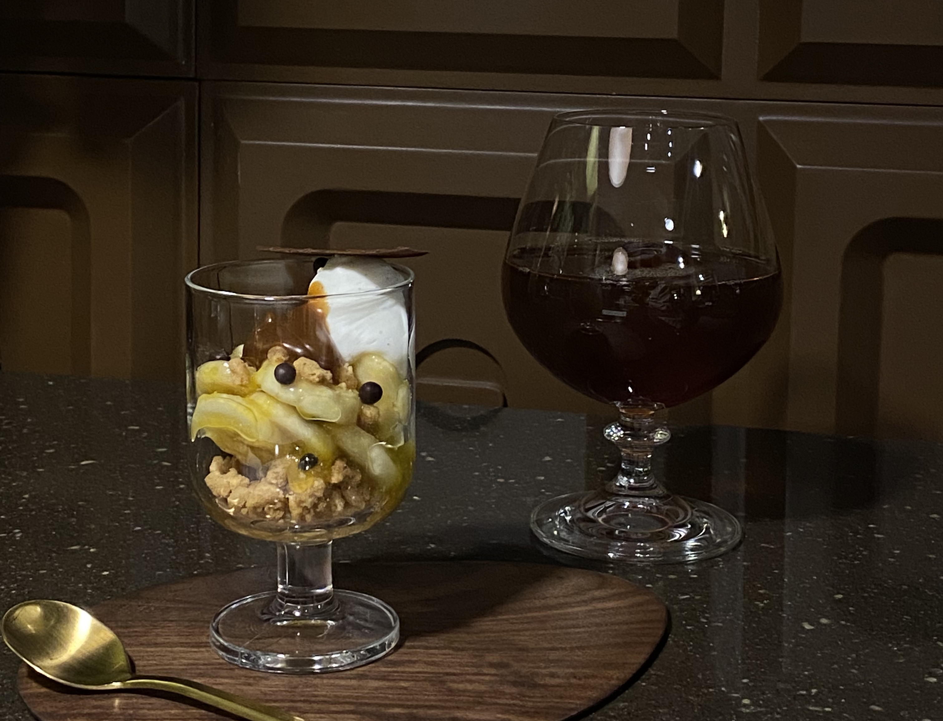 페어링 코스의 마지막! 계속해서 달고 헤비한 플로우로 왔다면 이번 디저트 코스에서는 상큼하게 입안을 마무리할 수 있도록 준비해 주셨습니다. 크럼블과 바나나가 들어 있는 파르페 스타일의 디저트에 땅콩 시럽과 초콜릿 크림 그리고 얼그레이 크림으로 레이어링 되어 있어요.