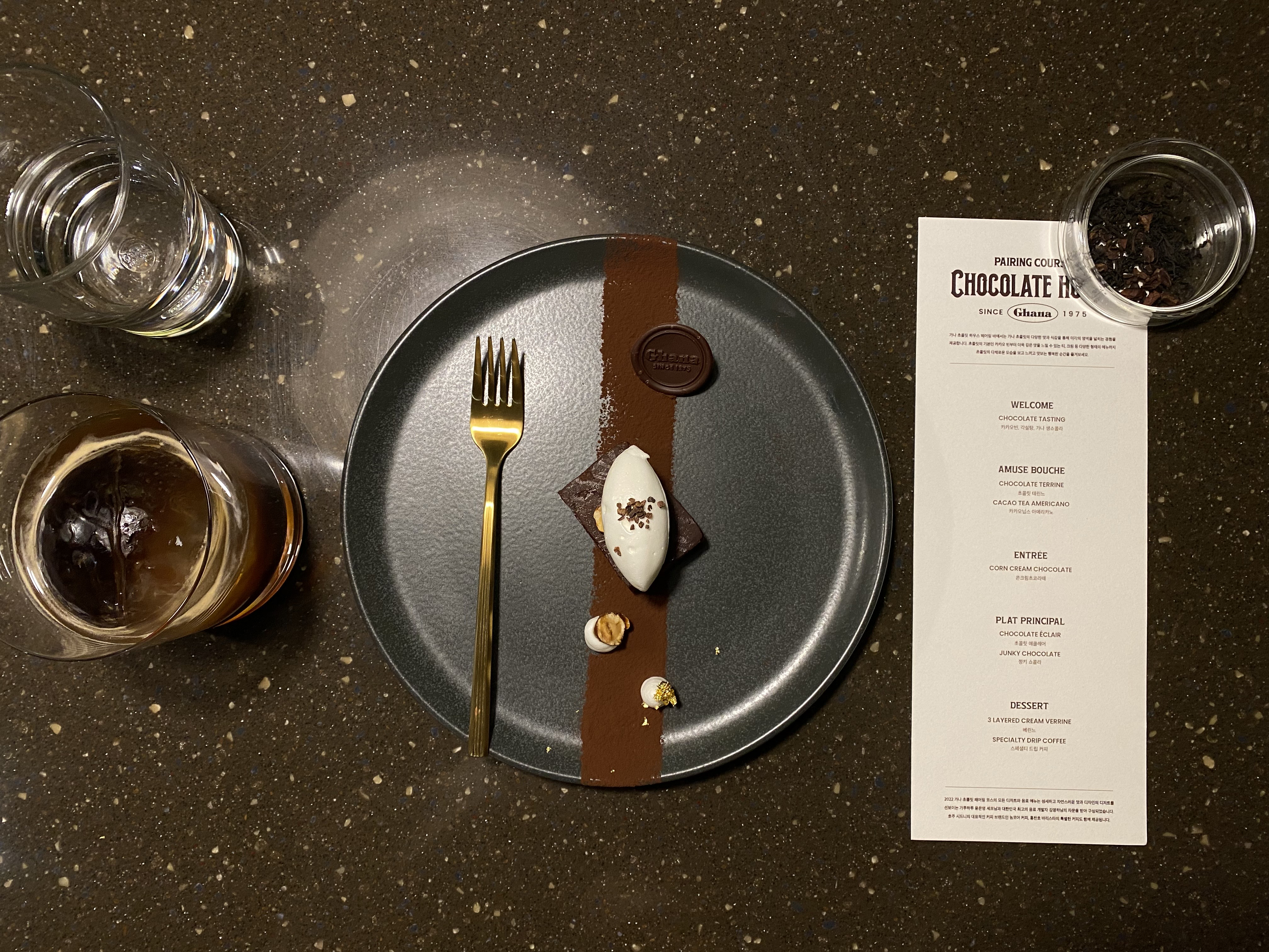 특히 이번 가나초콜릿 하우스를 놓치지 말아야 하는 또 하나의 이유입니다! 디저트 페어링의 모든 코스들은 압구정 가루 하루의 윤은영 셰프님과 국내 최고 음료 개발자 김영하 님의 자문을 받아 구성된 메뉴들이라고 해요. 지난 4월, 5코스의 디저트가 페어링 되는 프로그램에 직접 다녀온 내용을 살짝 소개해 드리겠습니다. 처음 도착했을 때 준비되어 있던 웰컴 푸드는 각설탕 그리고 70퍼센트 농도의 생초콜릿이 순서대로 놓여 있었어요. 초콜릿을 만드는 가장 기본 원료인 카카오 빈을 껍질을 벗겨 꼭꼭 씹으면 쌉싸름하면서도 달콤함이 실제로도 느껴지더라고요. 그때 각설탕을 함께 입안에 넣고 씹어보았는데요. 처음에는 너무 달지 않을까 걱정했는데 카카오빈의 쌉싸름함과 각설탕의 단 맛이 정말 과하지 않게 녹아들었습니다. 함께 제공해 주신 카카오닙스티로 입안을 한번 헹궈준 후에 생초콜릿의 부드러움을 느낄 수 있었습니다!