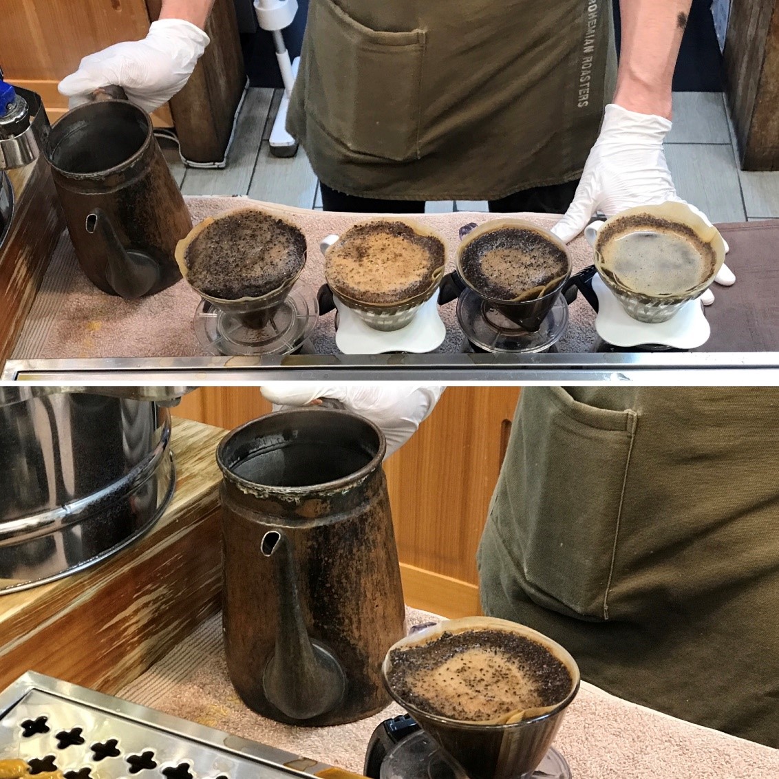 입구에는 박이추 선생의 문구가 눈에 띈답니다. 직원들이 커피를 준비하고 “선생님 준비되었습니다.”라고 하면 로스팅 실에서 박이추 선생이 나와 주방으로 가요. 박이추 선생의 드립은 물줄기가 꽤 굵은 편입니다. 그러나 일정한 굵기와 속도 그리고 방향으로 커피 가루에 물을 주죠.