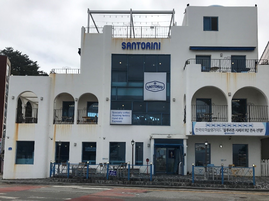 안목 해변 끝자락에 위치한 '산토리니'는 강릉 커피거리의 1세대 카페에요. 그리스 산토리니를 연상케 하는 새하얀 건물이 인상적입니다. 미슐랭 가이드 블루리본 서베이에 9년 연속 선정됐고, 스페셜티 전문으로 핸드드립과 에스프레소 베리에이션이 유명하답니다. 에스프레소와 핸드드립 음료 종류가 많아 다양한 시도를 해볼 수 있어요.
