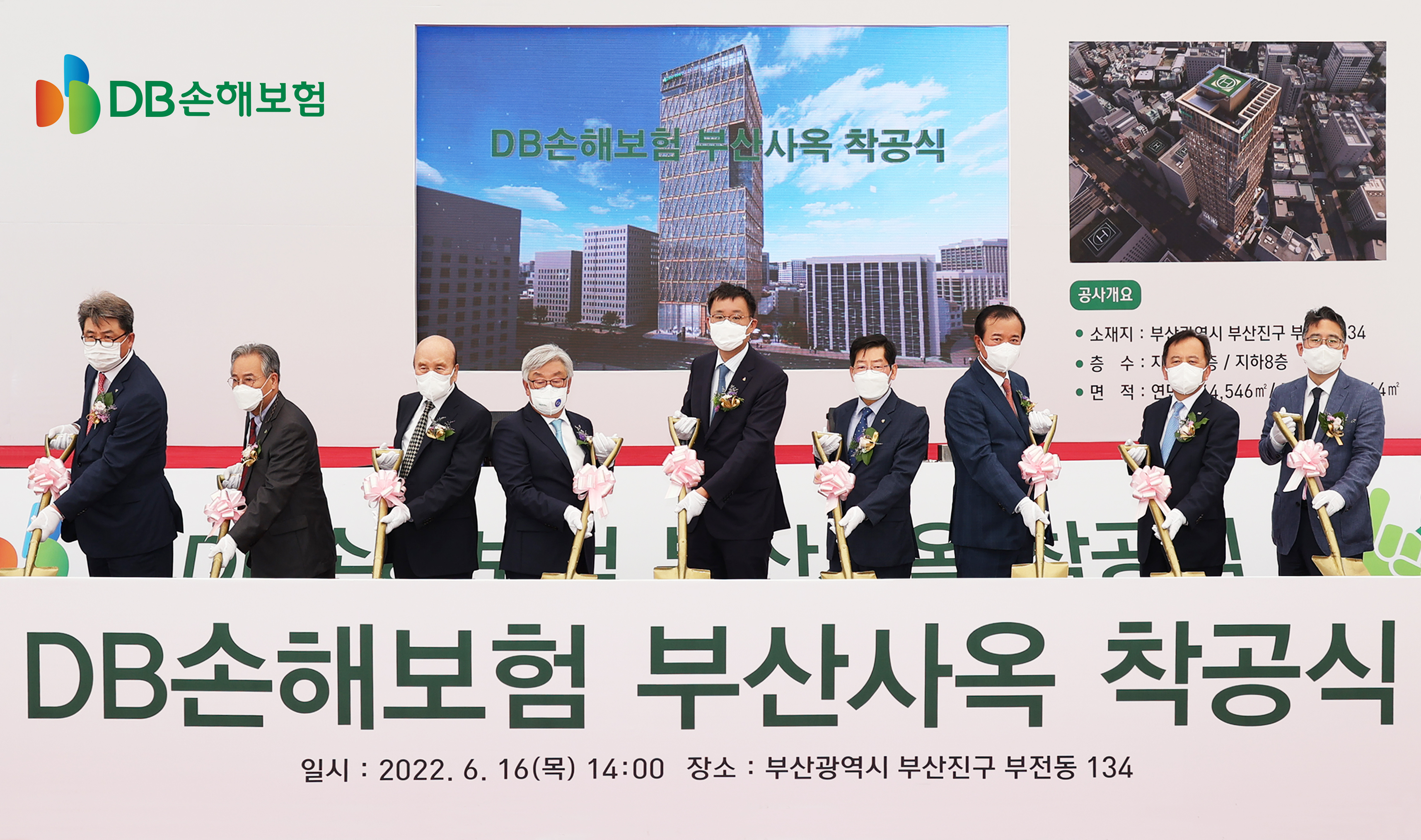 DB손해보험(대표 김정남)은 지난 6월 16일 부산 서면에서 DB그룹 김남호 회장, DB손해보험 김정남 부회장, DB생명 김영만 사장 등 주요 관계자들이 참석한 가운데 부산 신사옥 착공식을 가졌다.
