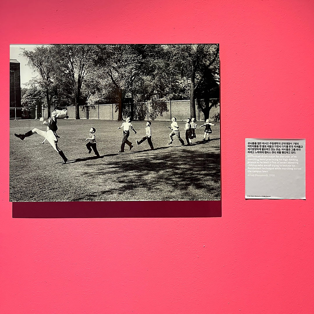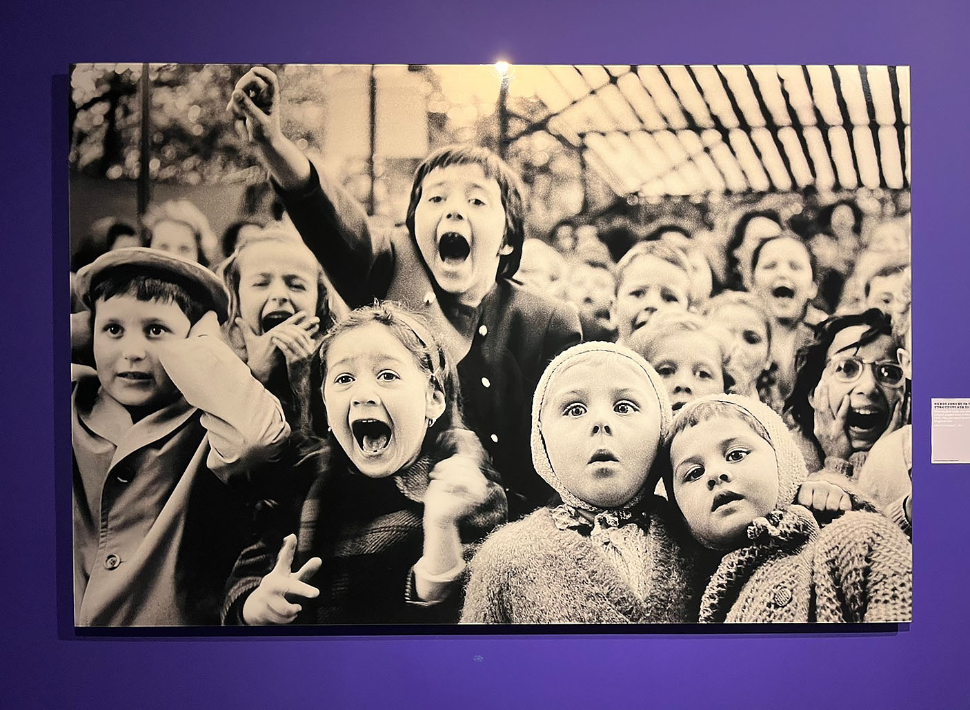파리 몽수리 공원에서 열린 귀뇰 인형극 도중, 용이 죽는 장면에서 각양각색의 표정을 짓는 아이들의 사진(상), 유니폼을 입은 미시건 주립대학의 군악대장이 한껏 다리를 치켜들고 의기양양하게 활보하는 모습 뒤로 7명의 아이들이 그를 따라 하려고 노력하며 캠퍼스 잔디 위를 행진하는 모습(하)