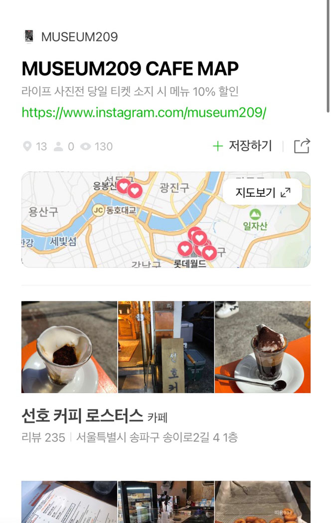 전시회 당일 관람 티켓을 갖고 가면 주변의 카페나 맛집에서 10% 메뉴 할인을 받을 수 있습니다. 해당 카페나 맛집들은 잠실과 성수동 부근에 위치해 있었어요. 전시회 관람 후 티켓을 버리지 않고 챙겨 카페나 맛집에서 할인받아 이용하는 것도 좋은 방법이니 참고해 보시길 바랍니다.