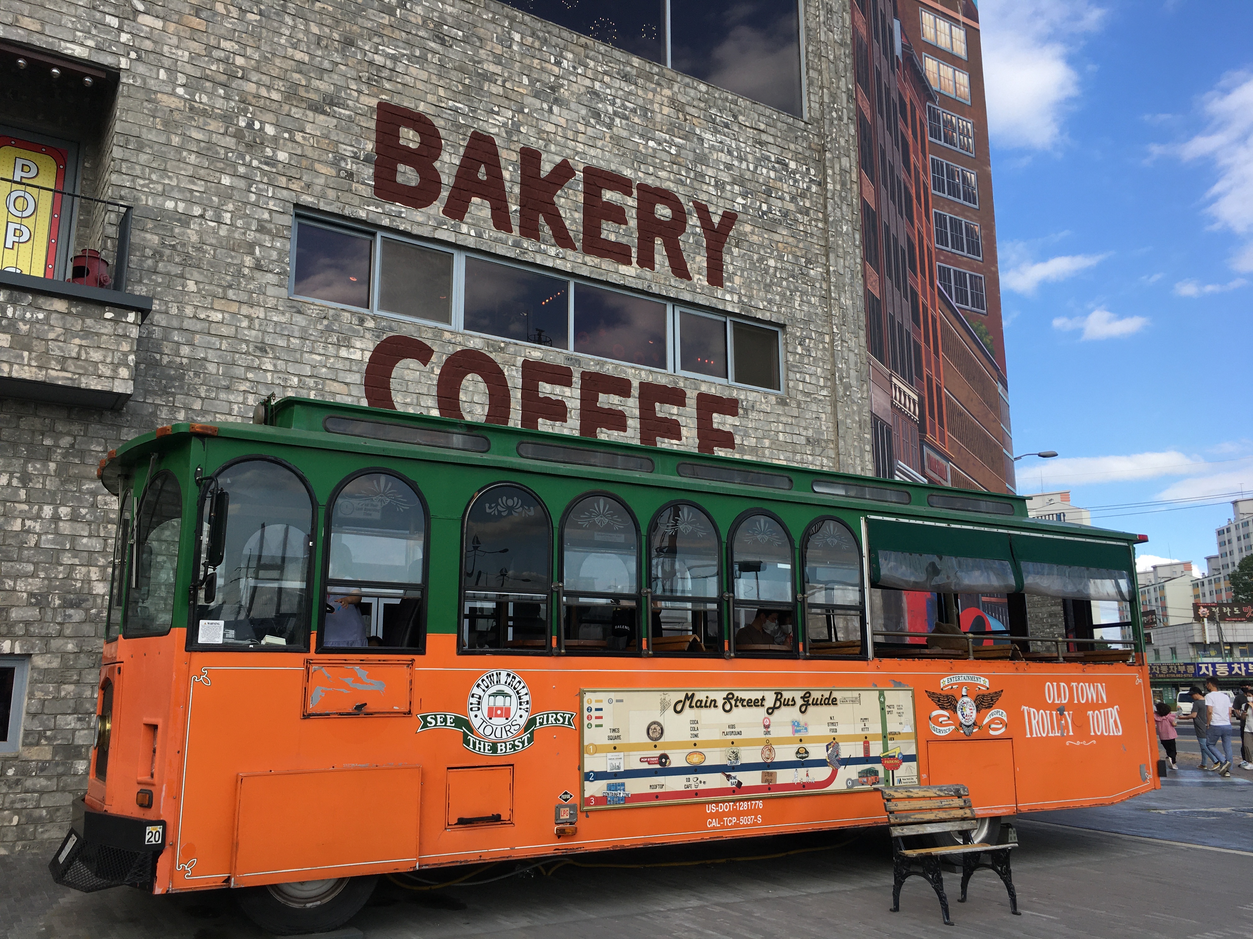 건물 앞에는 실제 미국에서 운행했던 1910년대 트롤리가 놓여있고, 현관은 뉴욕의 지하철 입구 모양이에요.