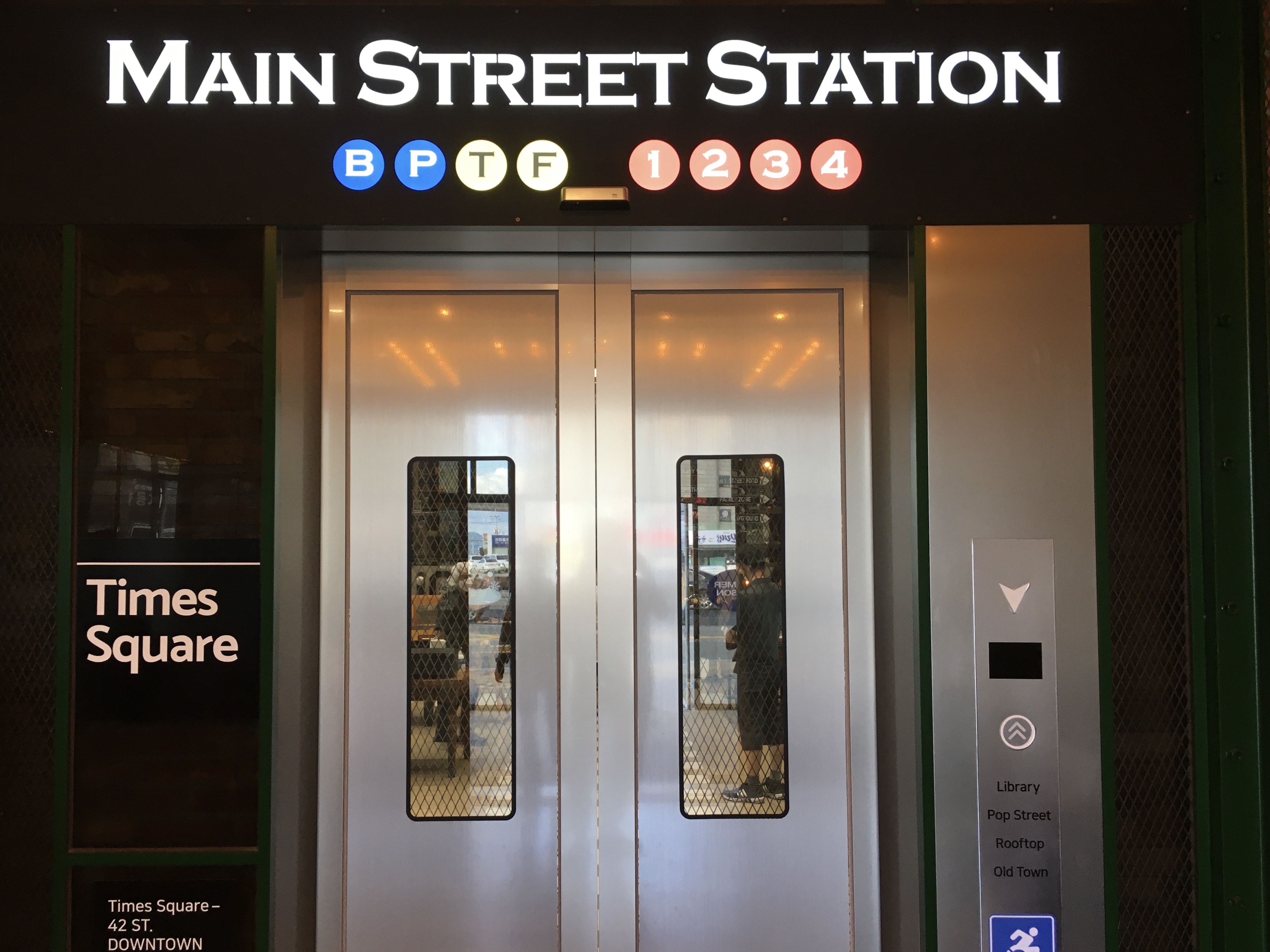 입구로 들어서면 위쪽에 '메인 스트리트 스테이션(MAIN STREET STATION)'이라고 적힌, 지하철 출입문이 나와요. 자동으로 개폐되는 출입문이 열리고 안으로 들어가면 갑자기 눈앞에 뉴욕 타임스퀘어가 펼쳐집니다.