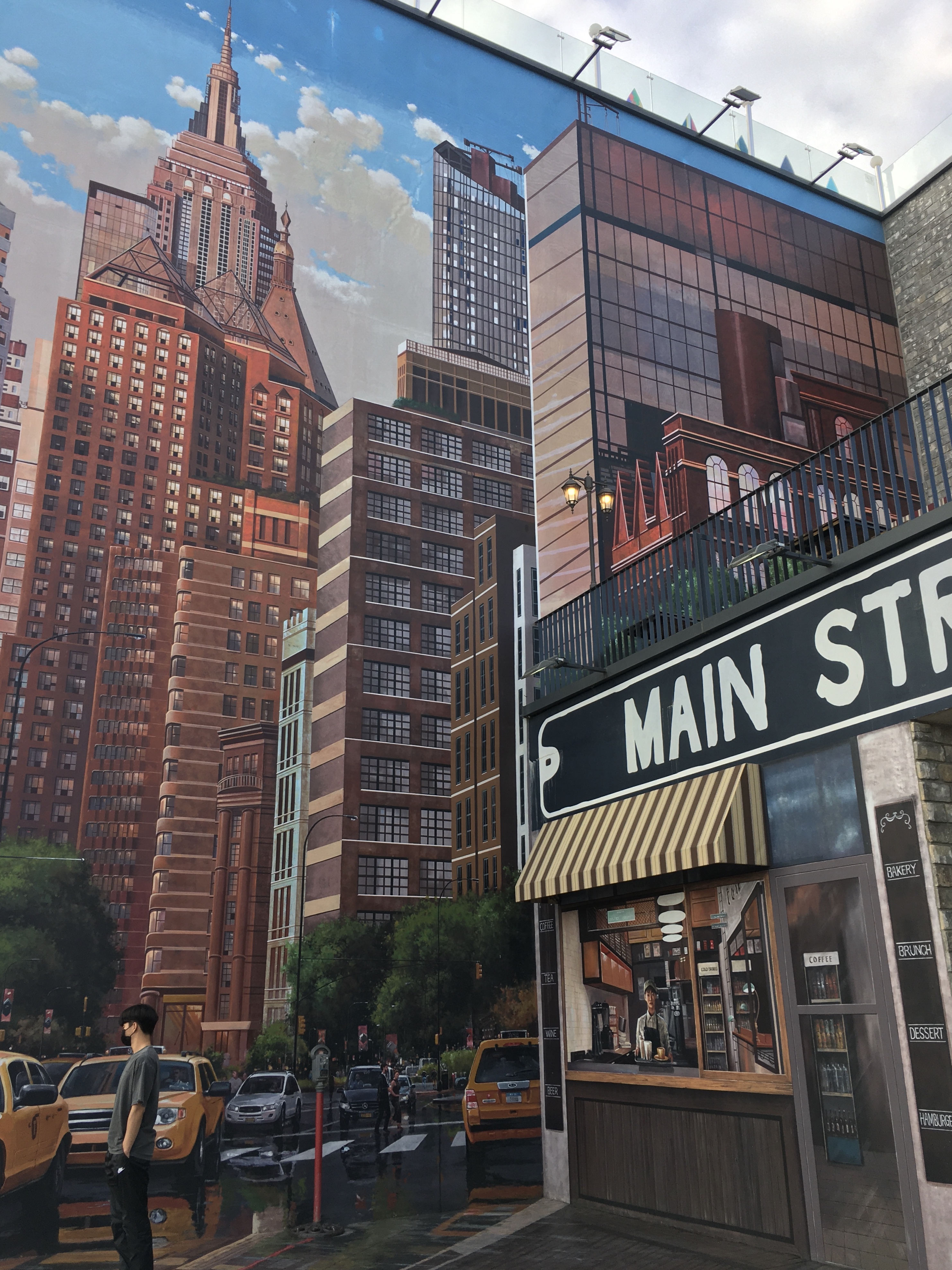 건물 외벽은 해 저무는 ‘맨해튼 다운타운’을 그대로 옮긴 대형 벽화(Super graphic)로 꾸며져 있어요. 엠파이어 스테이트 빌딩과 맨해튼 광장, 노란색 택시가 그려진 벽화는 거대한 영화 세트장을 연상시킨답니다.