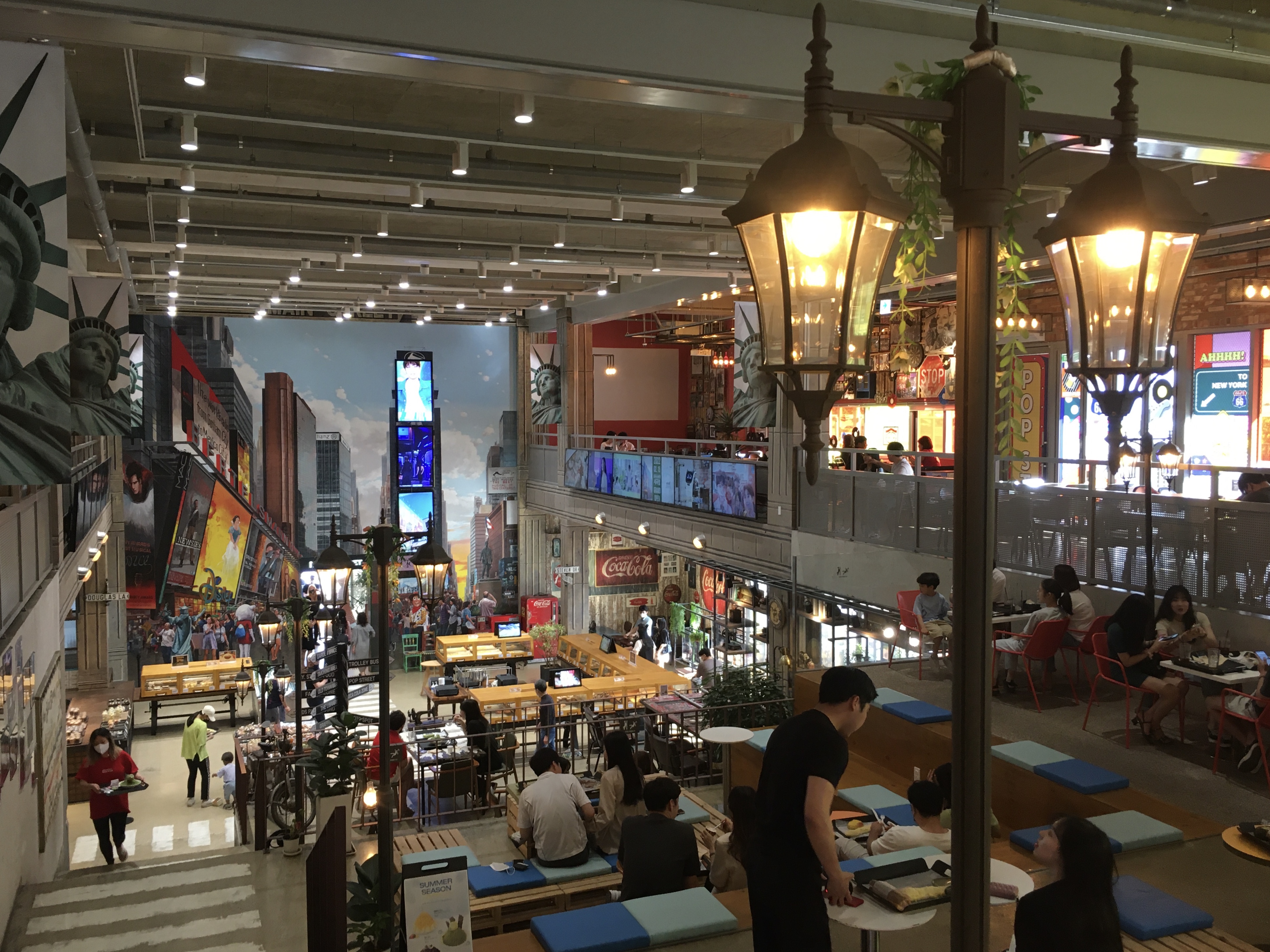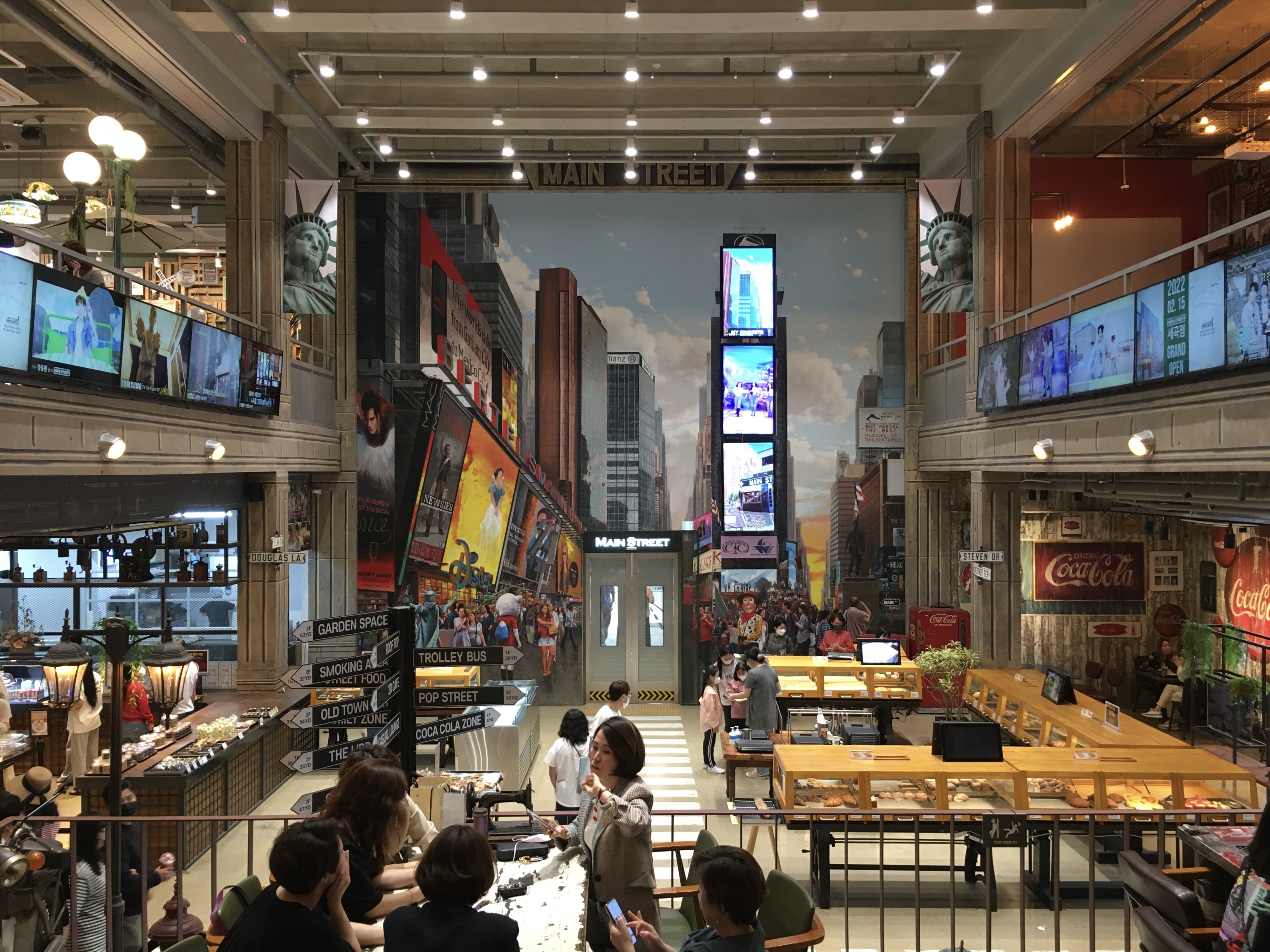 전광판이 반짝이는 타임스퀘어, 빈티지한 매력이 가득한 첼시, 여유의 상징 센트럴파크, 뉴욕공립도서관, 뉴욕 거리의 그라피티, 푸드 트럭과 와인바 등 실제 뉴욕의 메인스트리트에서 볼 수 있는 20가지 명소를 재연해 뉴욕의 매력이 건물 곳곳에 채워져 있습니다. 메인스트리트를 구상하고 소품을 구하는 데만 무려 2년, 건축 기간은 1년이 걸렸다고 해요.