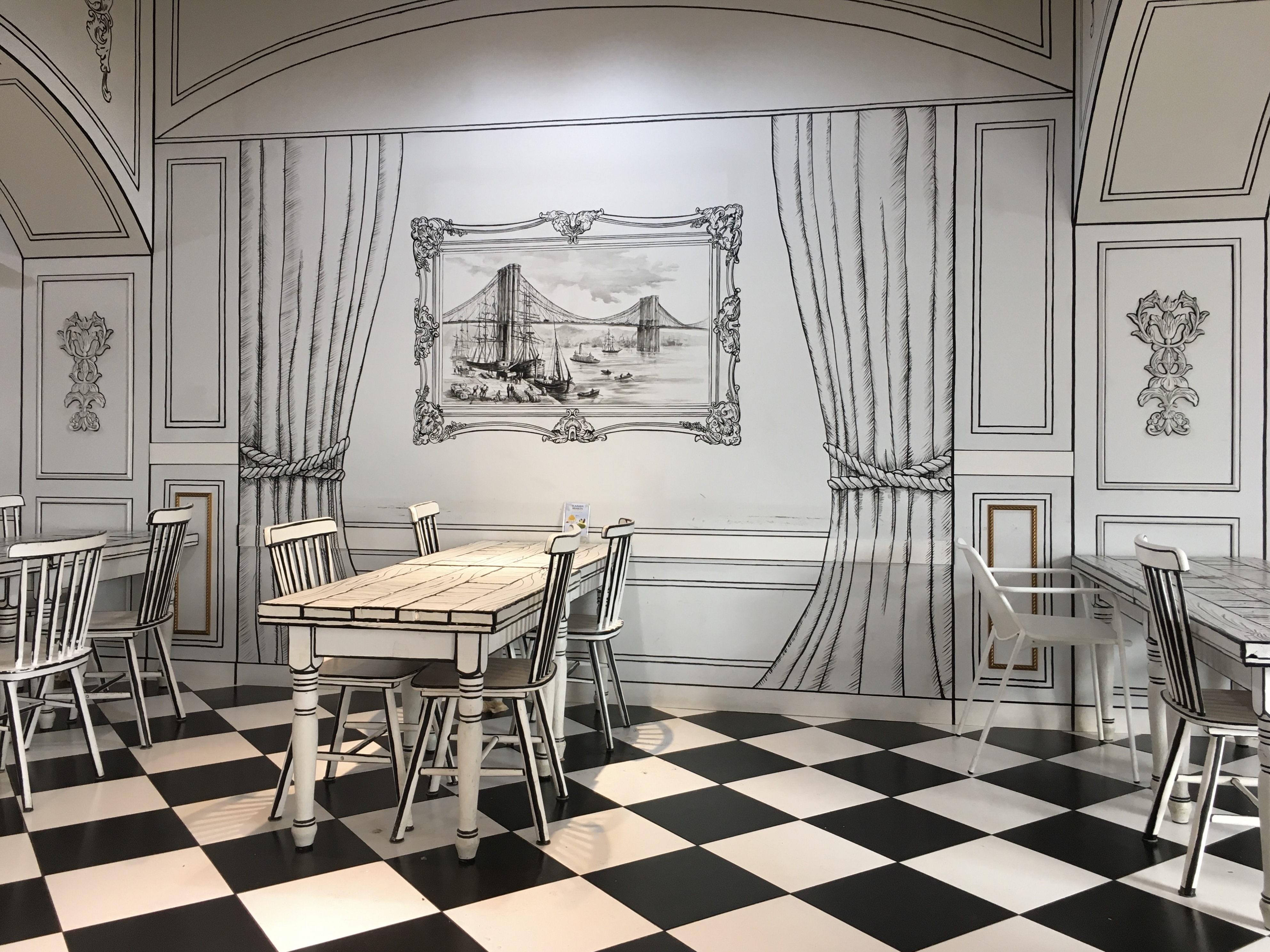 맞은편에는 흰색과 검은색을 적절히 섞어 2차원 공간처럼 만들어 놓은 '2차원 카페(2D CAFE)'가 있습니다. 벽에는 고흐의 명화, 브루클린 브리지를 표현한 그림도 걸려있어요.