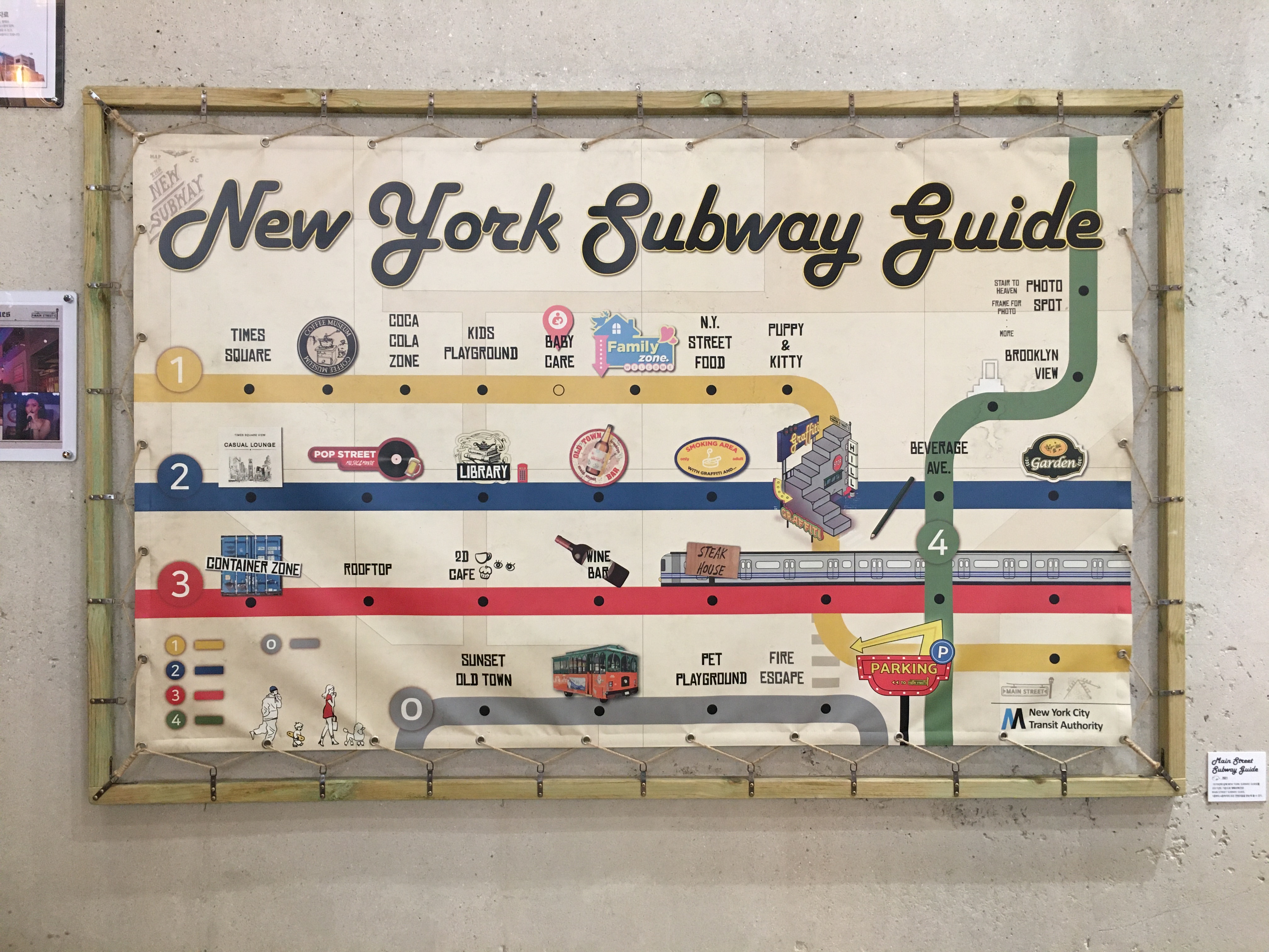 전광판이 반짝이는 타임스퀘어, 빈티지한 매력이 가득한 첼시, 여유의 상징 센트럴파크, 뉴욕공립도서관, 뉴욕 거리의 그라피티, 푸드 트럭과 와인바 등 실제 뉴욕의 메인스트리트에서 볼 수 있는 20가지 명소를 재연해 뉴욕의 매력이 건물 곳곳에 채워져 있습니다. 메인스트리트를 구상하고 소품을 구하는 데만 무려 2년, 건축 기간은 1년이 걸렸다고 해요.