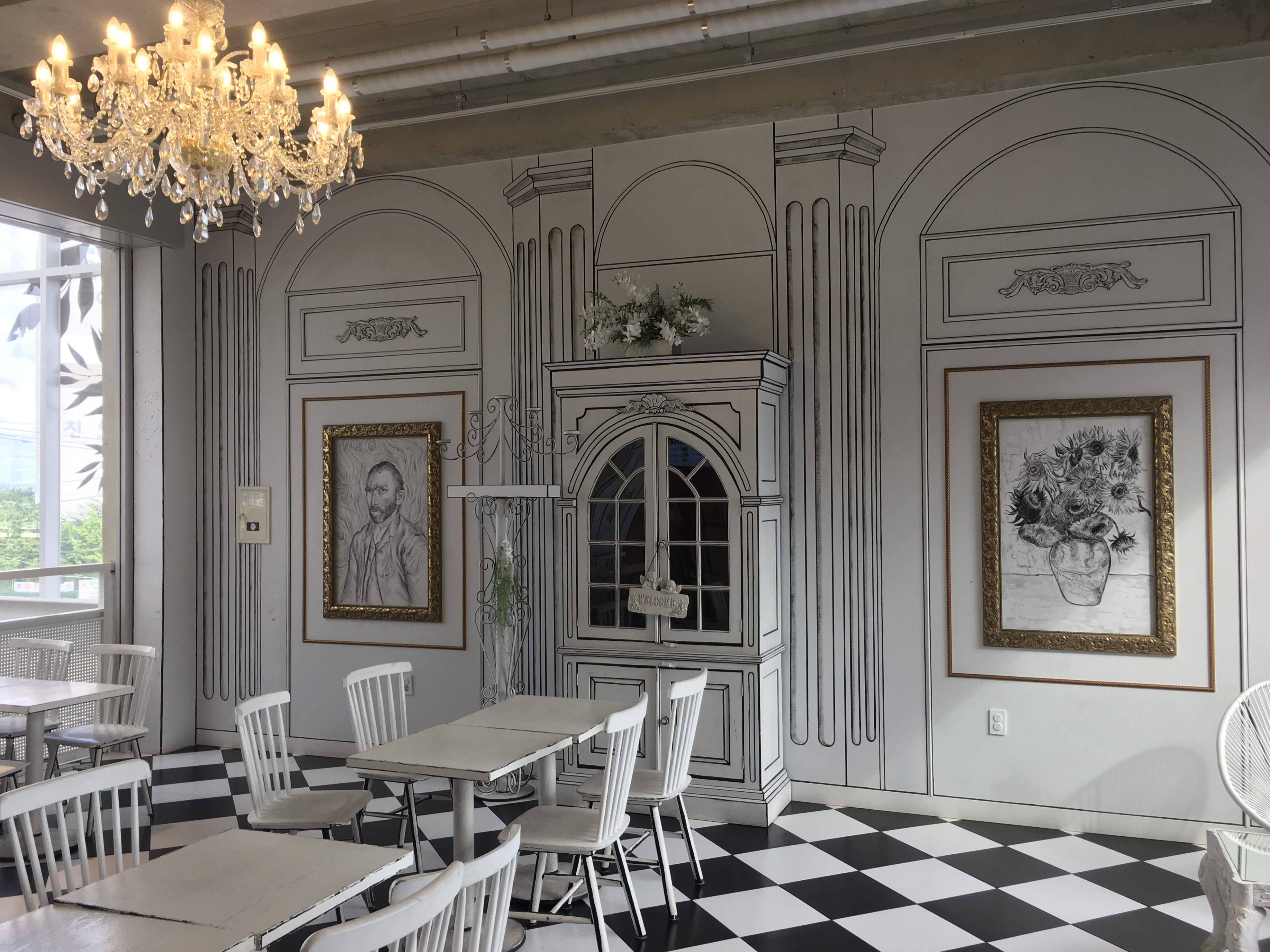 맞은편에는 흰색과 검은색을 적절히 섞어 2차원 공간처럼 만들어 놓은 '2차원 카페(2D CAFE)'가 있습니다. 벽에는 고흐의 명화, 브루클린 브리지를 표현한 그림도 걸려있어요.