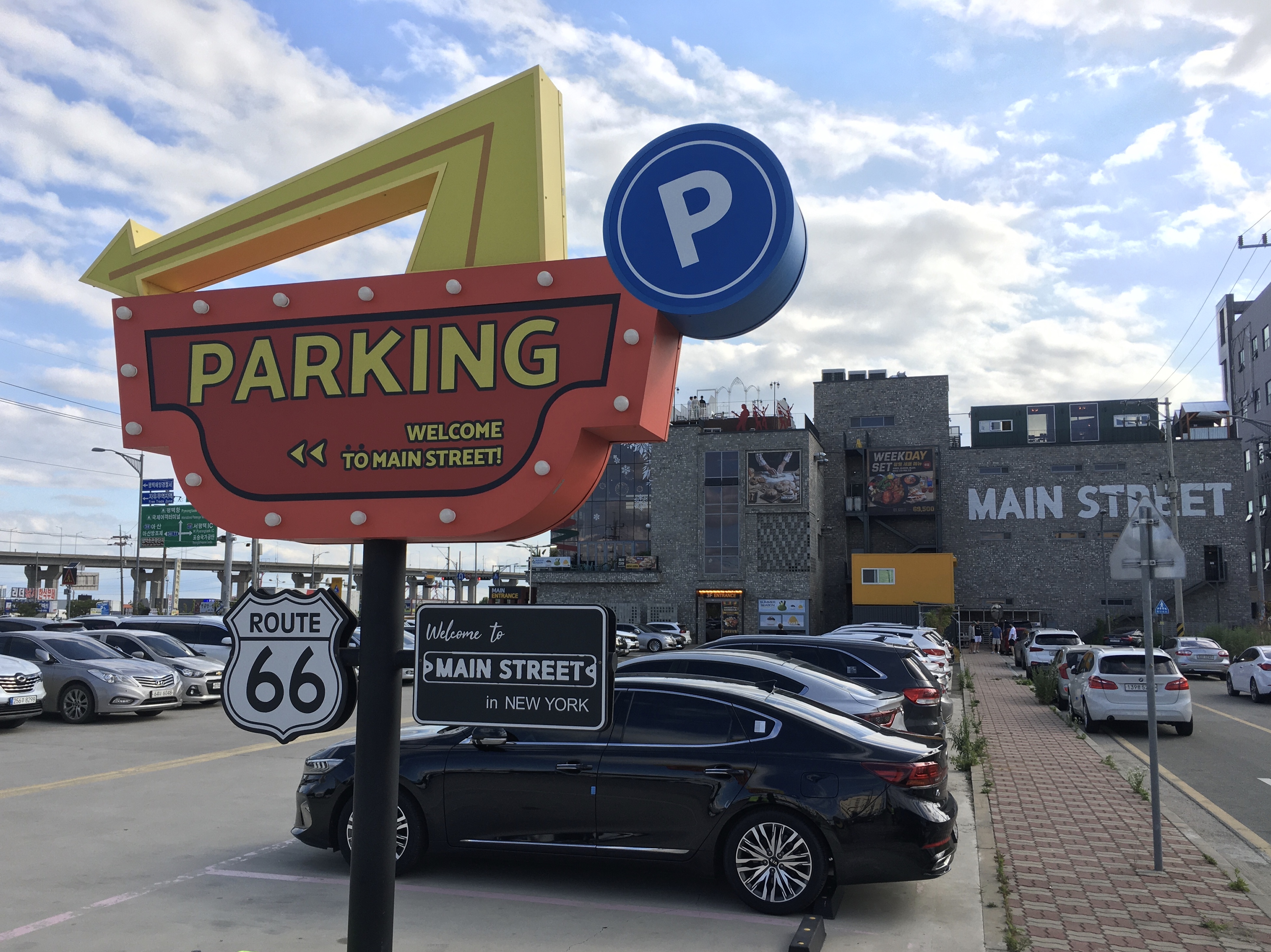주차는 메인스트리트 뒤편에 있는 2천쳥 규모의 대형 주차장을 무료로 이용할 수 있습니다. 빨간색 배경에 노란색 글씨로 ‘PARKING’이라고 쓰인 미국 감성 간판이 지금 막 뉴욕에 도착한 것처럼 맞이해 준답니다.