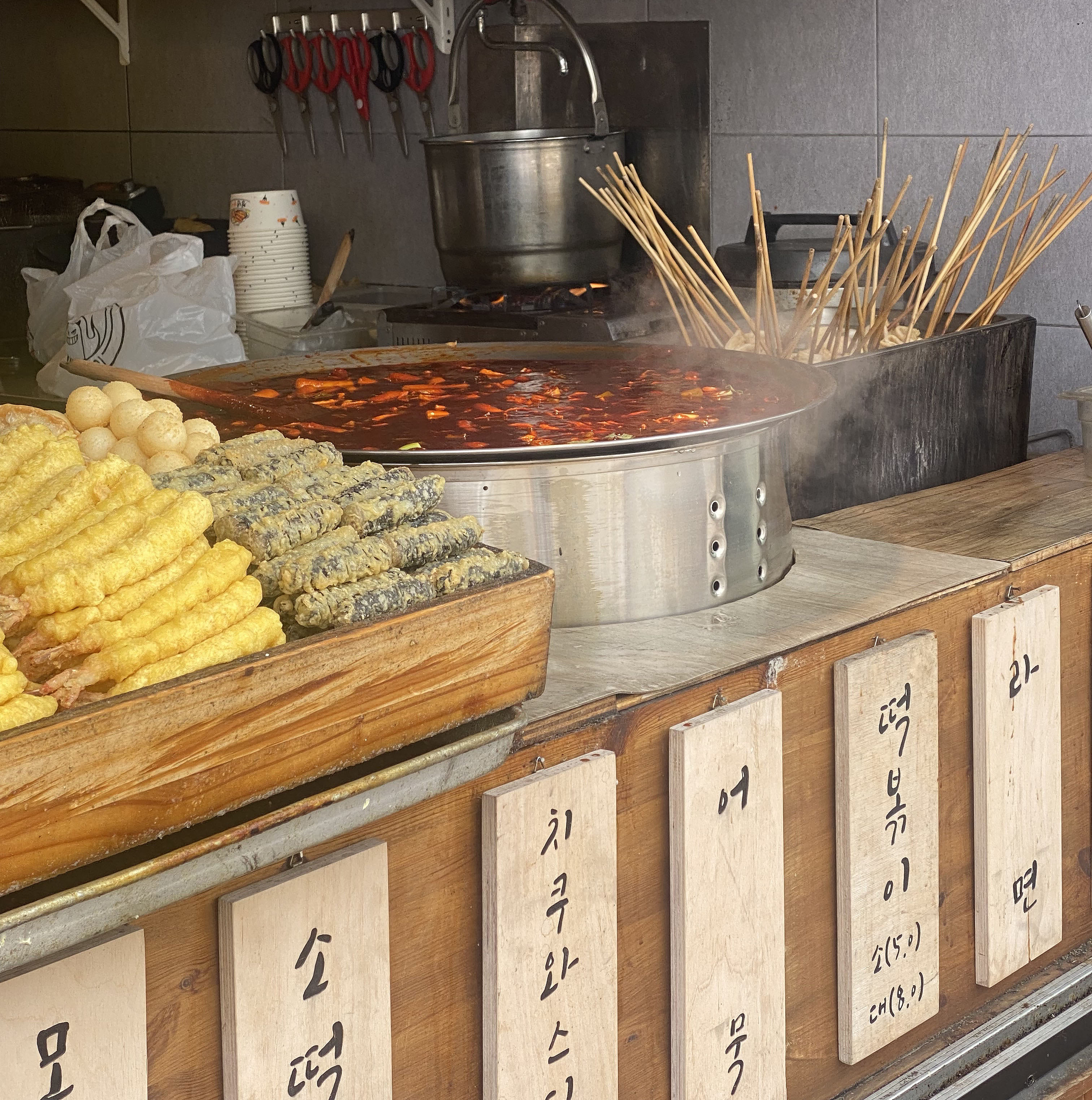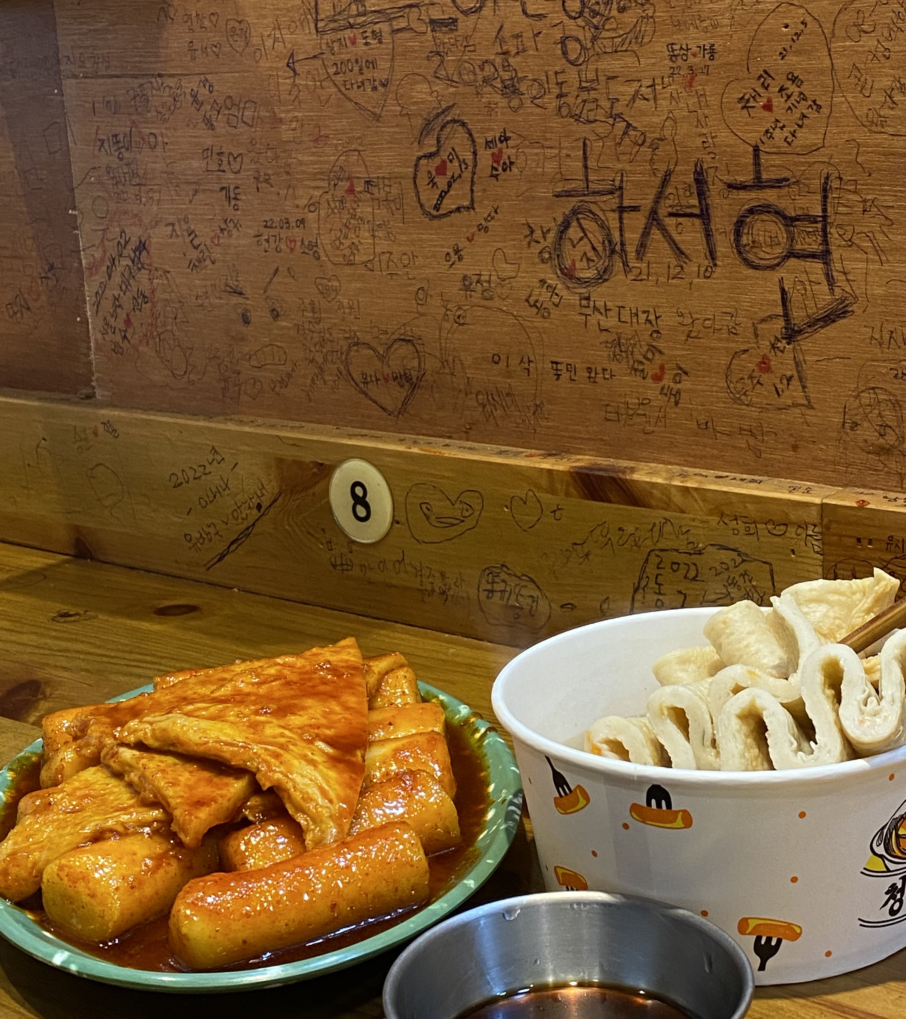 황리단길을 관광할 때 길거리 맛집 투어 역시 빼놓을 수 없죠. 길가를 가다 보면 가판대의 떡볶이가 먹음직스럽게 끓고 있는 청년분식이 눈길을 사로잡습니다. 벽면 가득한 낙서들, 두꺼운 가래떡에 양념이 적절히 베어 있는 떡볶이와 두툼한 어묵을 보니 초등학교 시절에 길거리 간식을 사 먹던 기억이 떠올랐습니다. 배가 불러 먹지는 못했지만, 튀김도 인기 메뉴 중 하나라고 해요.