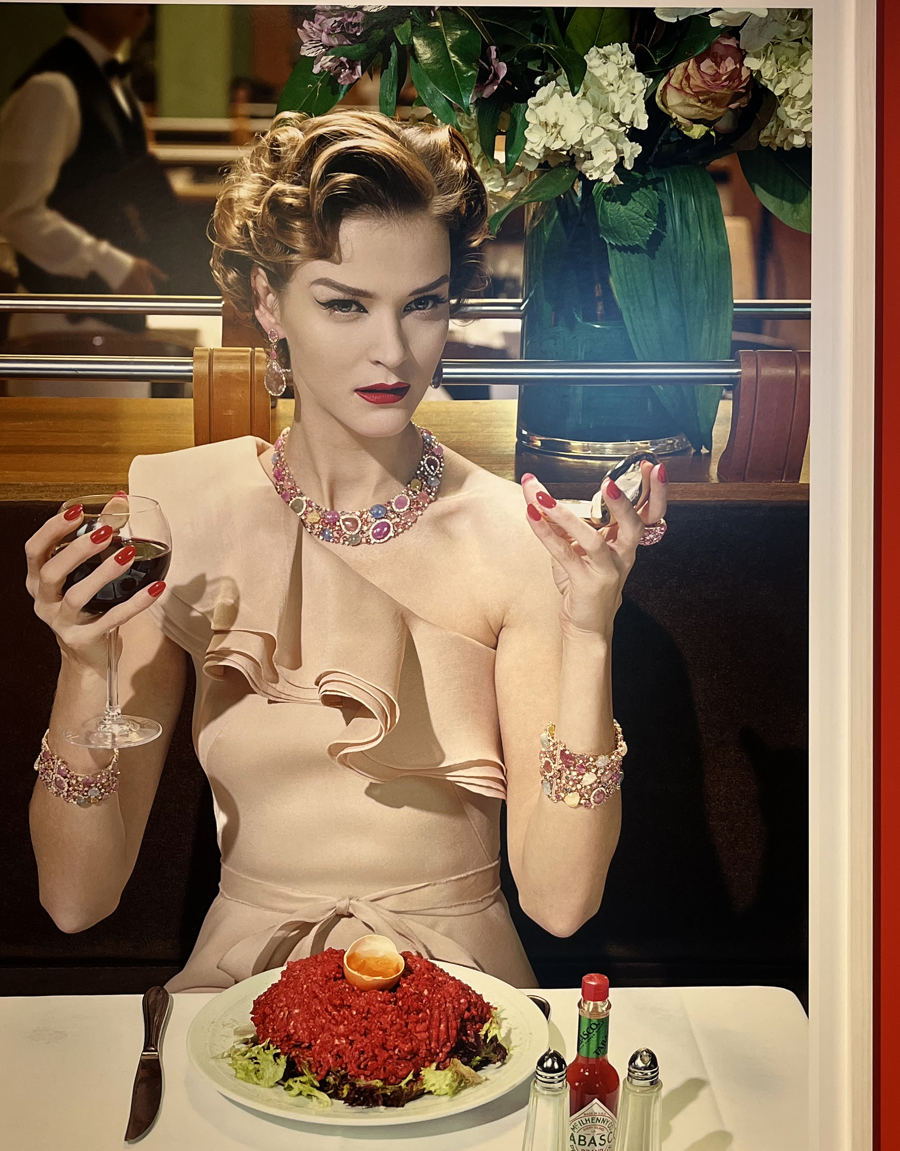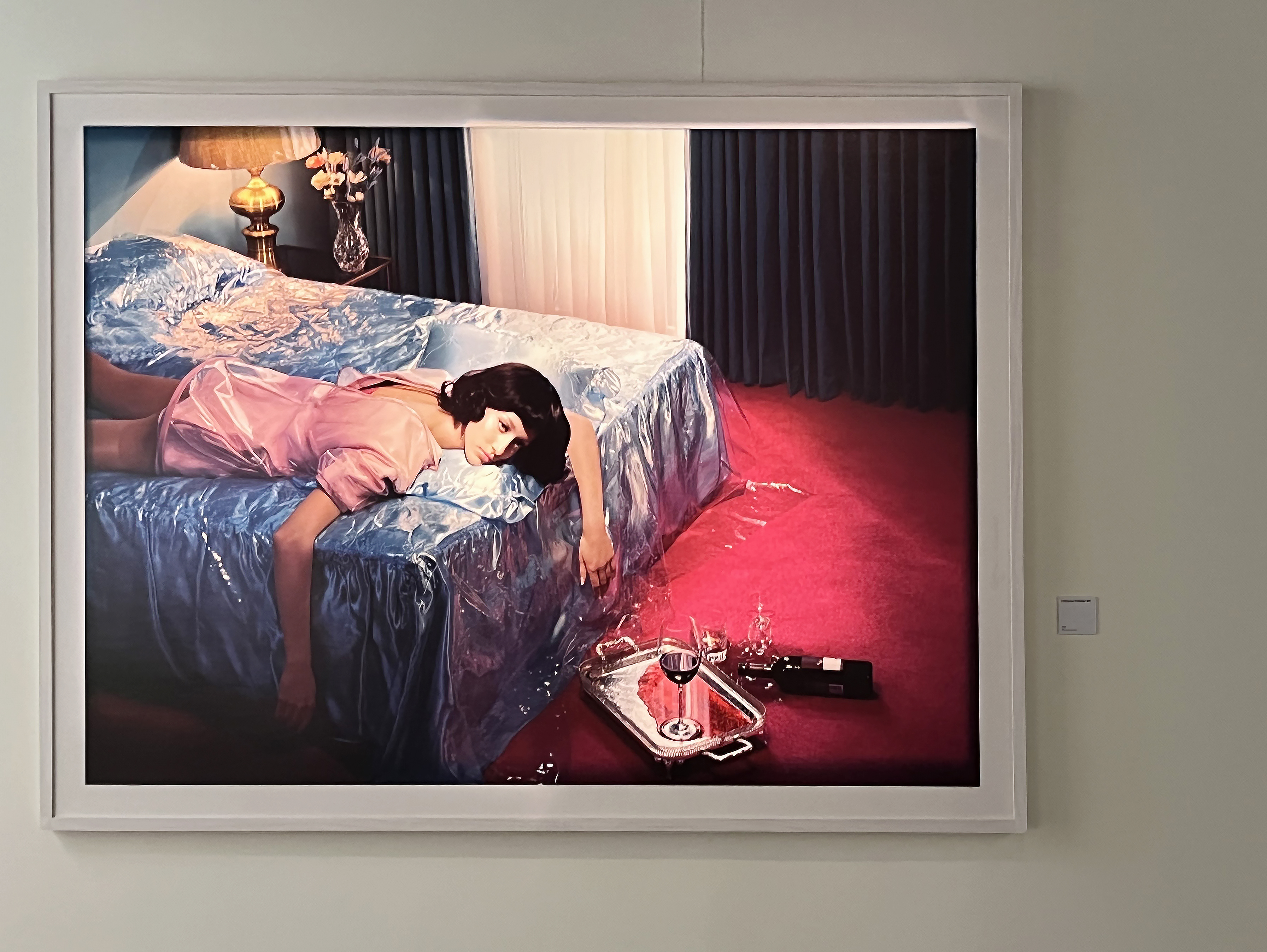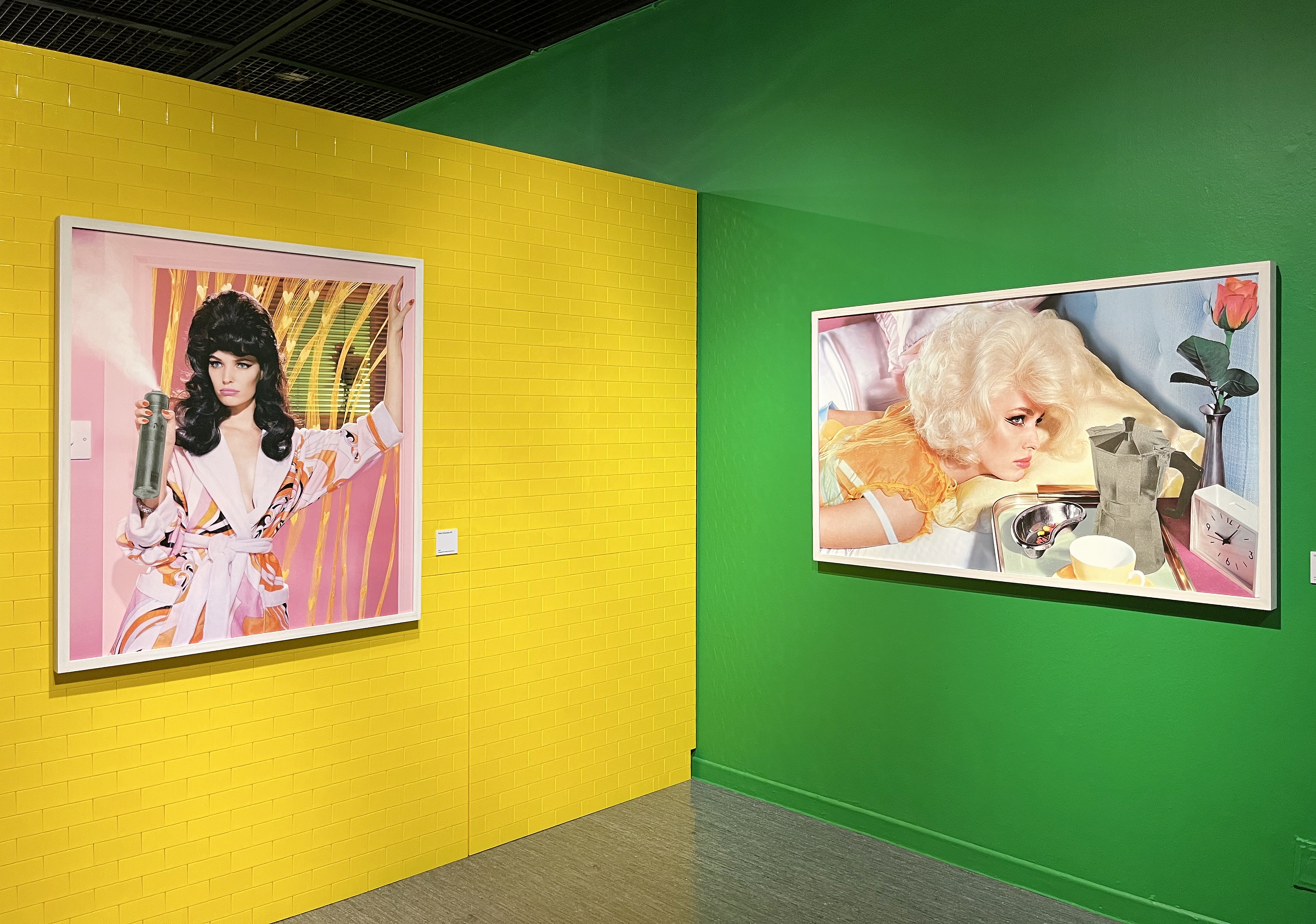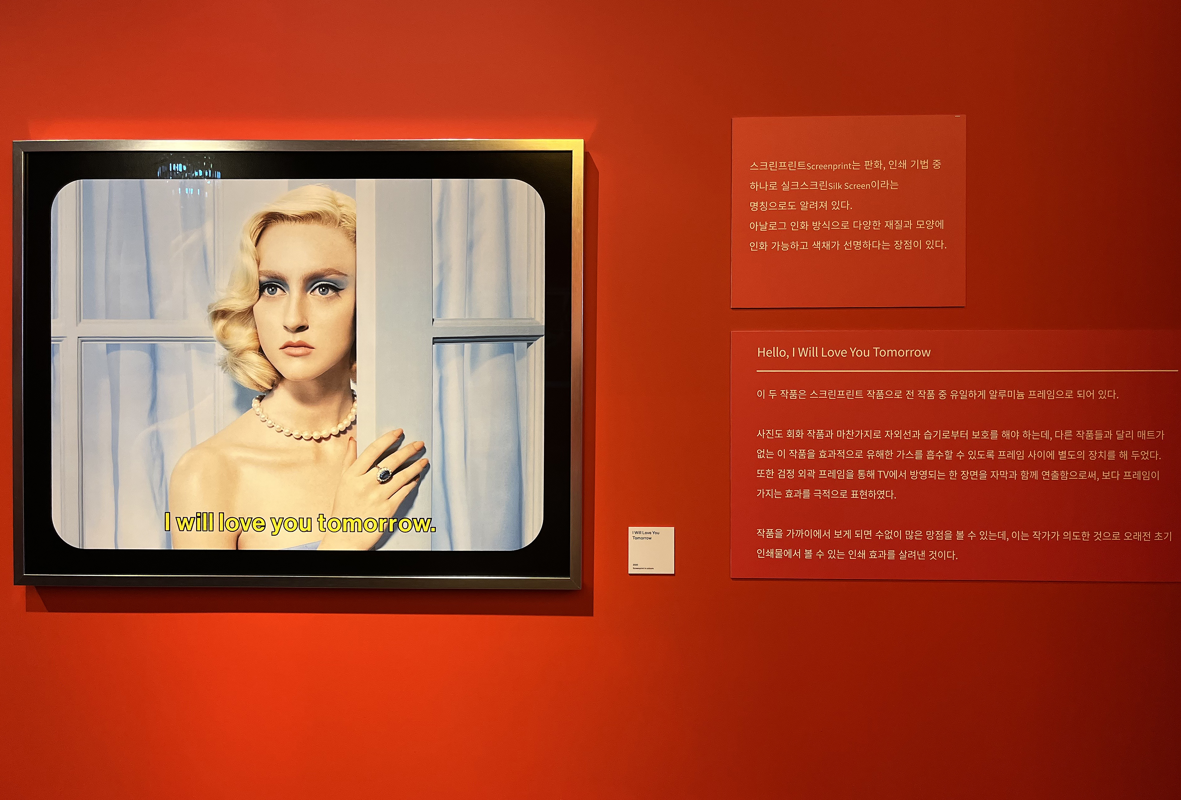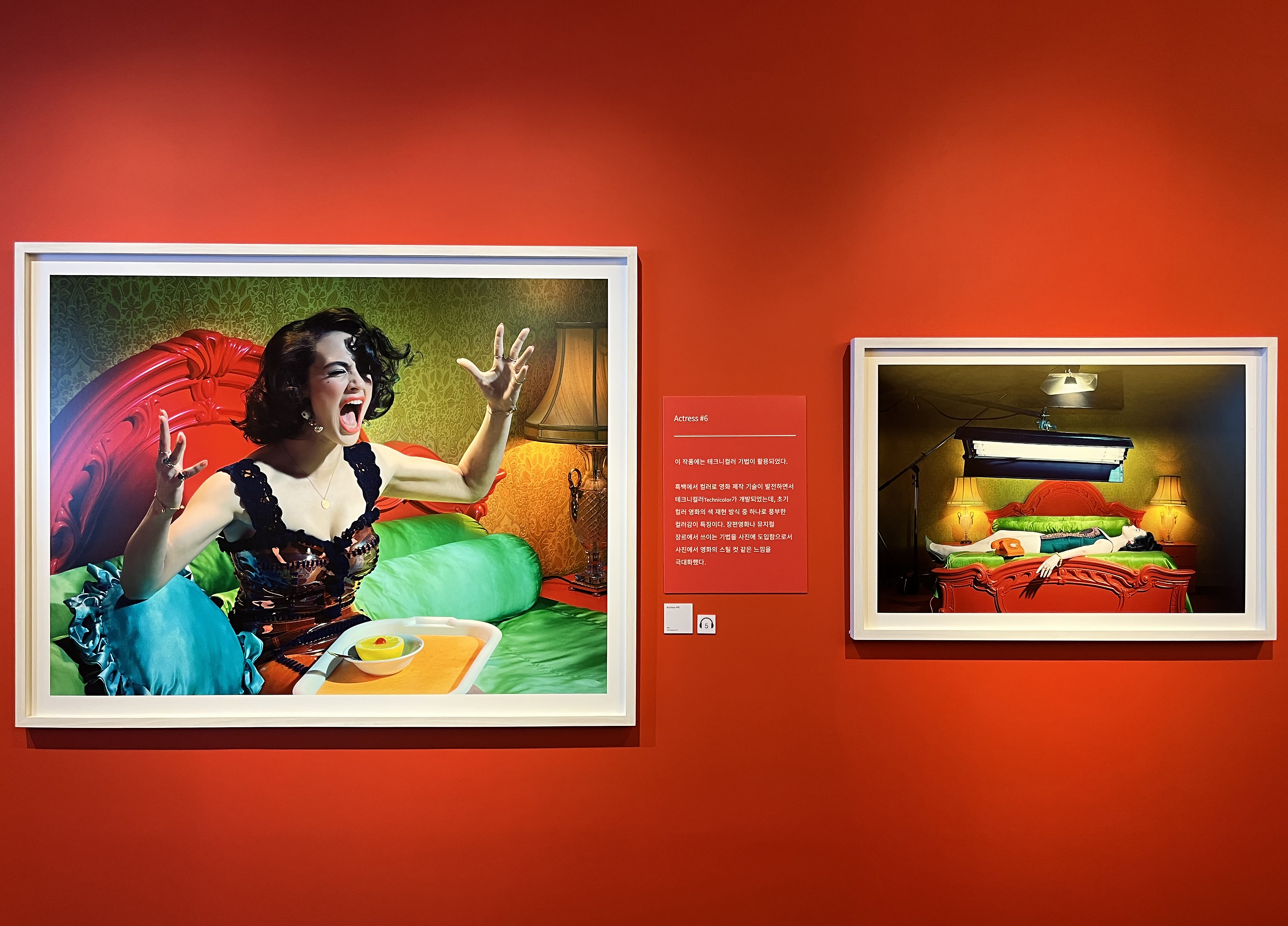 마일즈 알드리지는 패션 사진에서 더 나아가 아날로그 필름 사진을 예술의 경지로 끌어올리는 작업에 관심을 갖게 되면서 패션 사진에서 예술 사진으로 방향을 전환했고, 디지털카메라보다는 아날로그 필름으로 그의 작품 세계의 정체성을 확립하며 또 한 번 새로운 길을 열어나가고 있습니다. 알드리지의 소개와 함께, 본격적으로 8개 Section으로 구분된 작품들을 구경할 수 있는데요. 각 Section 별로 강렬하게 바뀌는 분위기와 특색 있는 포토존은 관람객을 지루할 틈 없이 만들어 줍니다. 마일즈 알드리지 컬러 픽쳐스의 대표 사진인 팝콘과 콜라를 들고 영화 관람 중인 여성의 작품 옆에 앉아 똑같이 콜라와 팝콘을 먹으며 인증샷을 남겨 보세요. 필요한 소품들이 모두 준비되어 있답니다. 사진전의 시작을 여는 이 여인은 Section.1 Drama의 첫 번째 사진으로, 마일즈 알드리지가 그간 영감을 받은 영화의 감독들에 대한 존경의 표현이라고 해요. 갑자기 왜 영화 이야기가 나오나 싶으시죠?