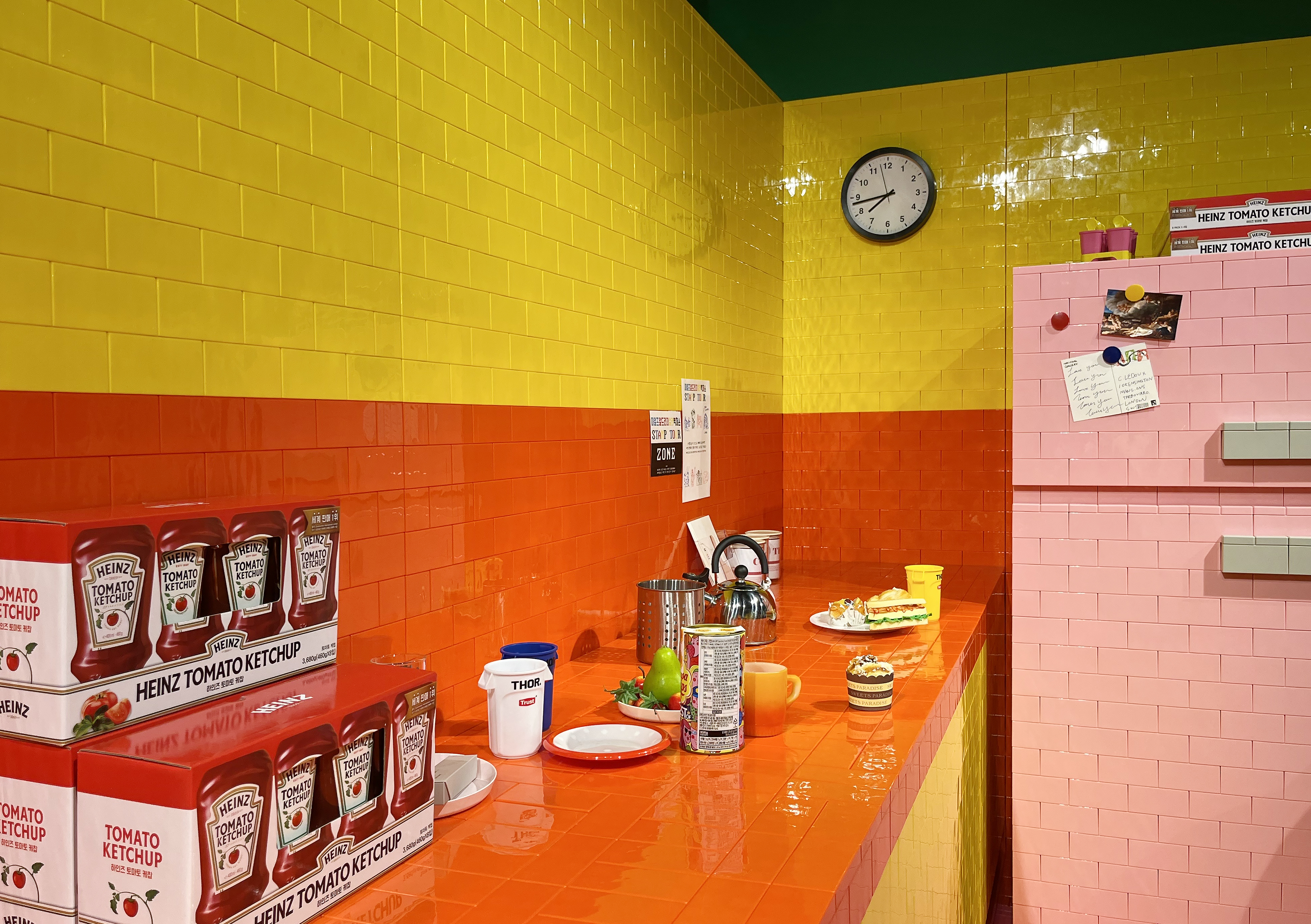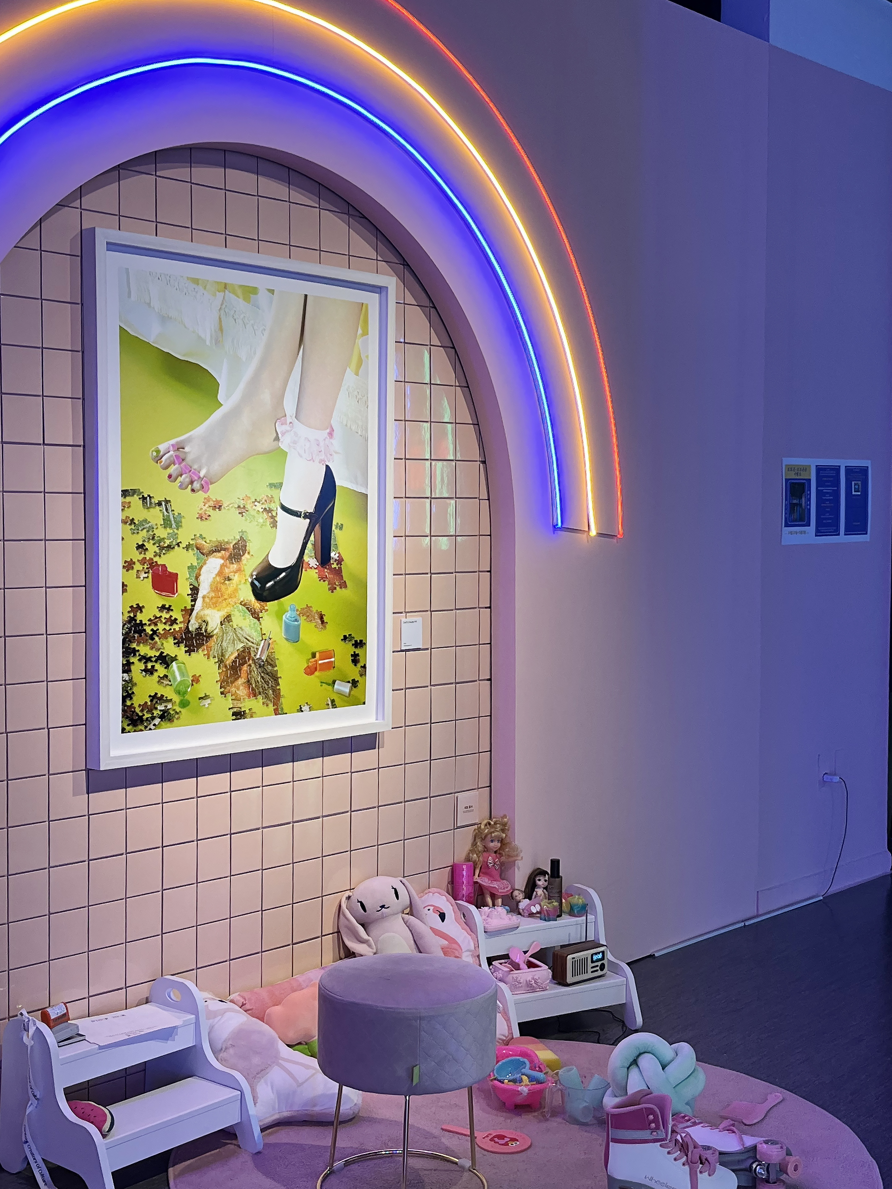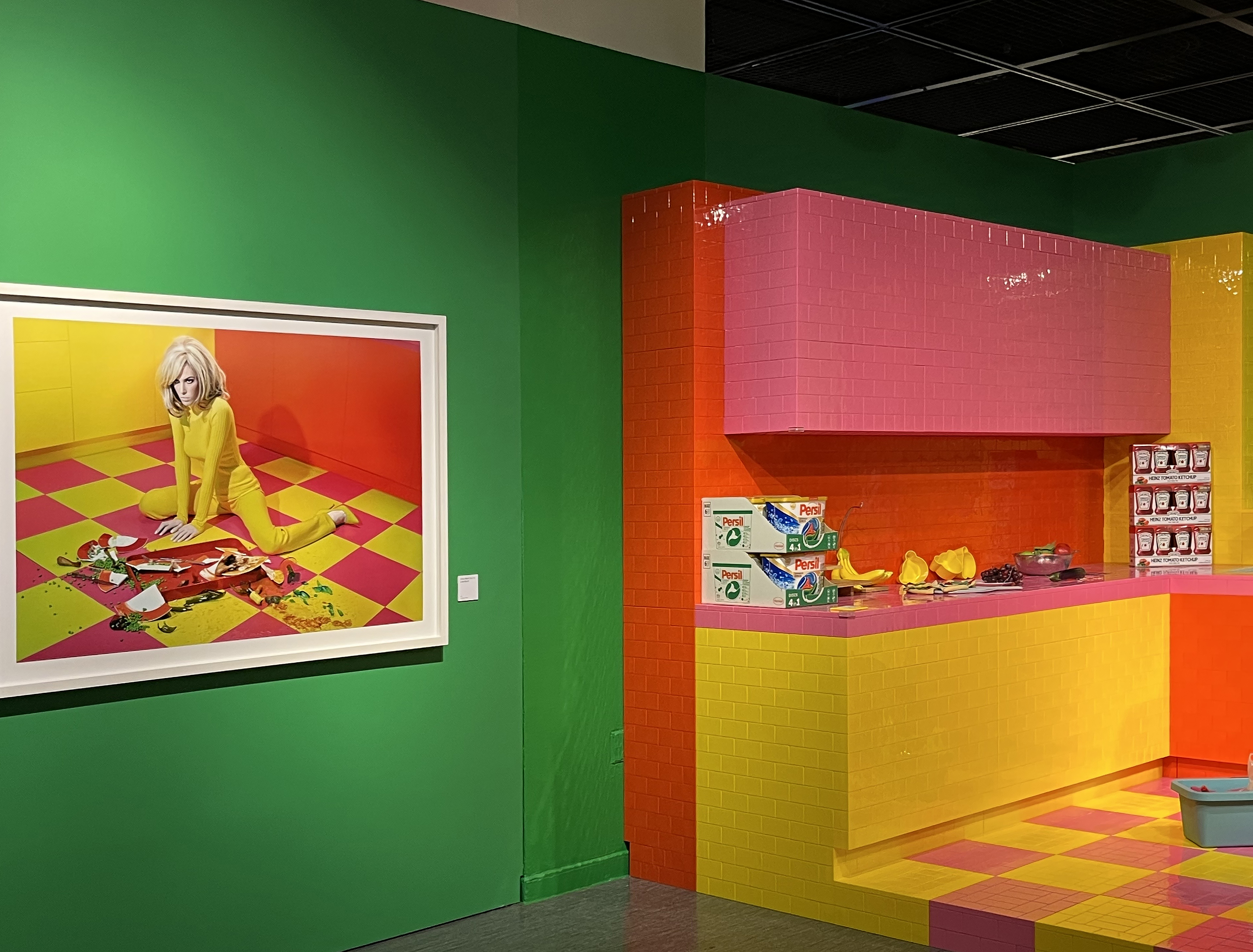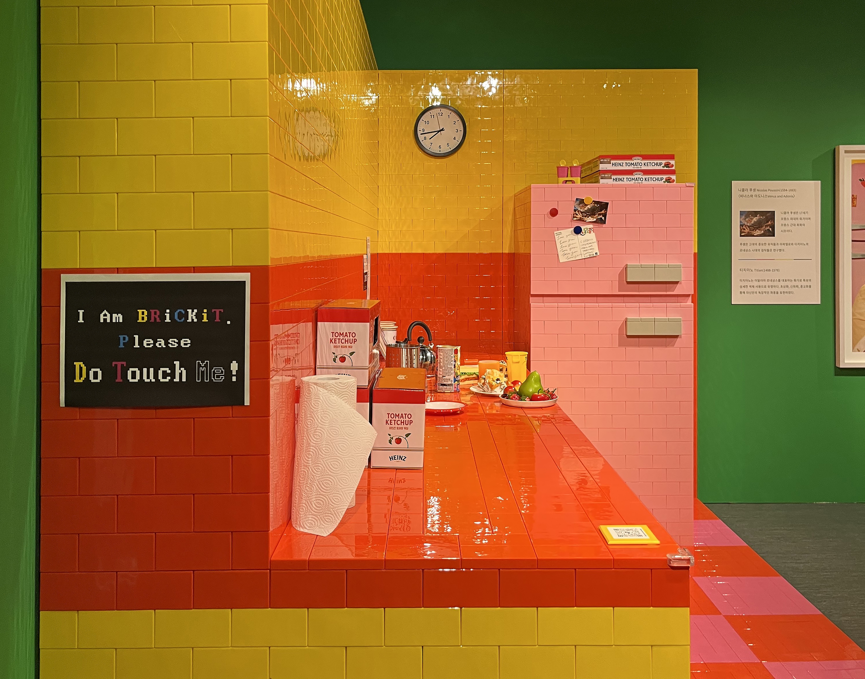 이 공간은 다른 작품과는 달리 소품들을 손에 쥐고 연출하기도 하고 직접 만져볼 수도 있는 세트장이에요. 아이들뿐만 아니라 어른들도 애니메이션 속으로 들어간 듯한 이 공간에서 인증샷을 찍으며 상당히 즐거워하는 모습이었습니다. 브릭으로 만들어진 싱크대 위에 놓인 하인즈 케찹과 브릭으로 만들어진 냉장고 위에 쌓인 피자박스라거나, 현실과 상상을 넘나드는 것 같은 연출이지 않나요? 이 구조물은 친환경 젖병 소재로 제작된 조립식 브릭으로 마일즈 알드리지의 작품들을 모티브로 제작되어 같은 구도로 사진 촬영을 하거나 준비된 소품들을 자유롭게 활용해 작품 속의 모델이 되어볼 수도 있게 연출되어 있었습니다. 배경과 대비되는 흰 컬러의 옷이나 전시의 전반적인 느낌을 끌고 가튼 키치하고 팝한 요소들을 가미한 힙한 스타일링을 해도 만족스러운 사진이 나올 것 같더라고요.