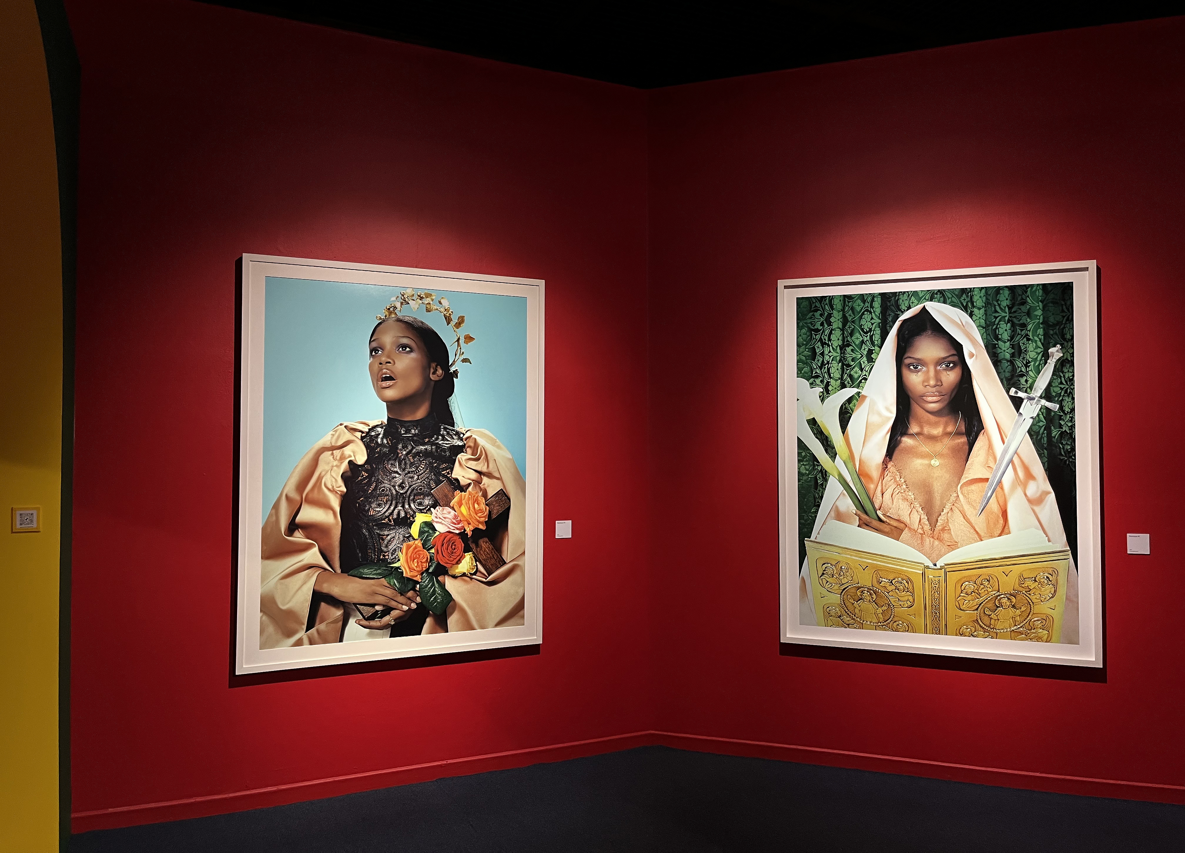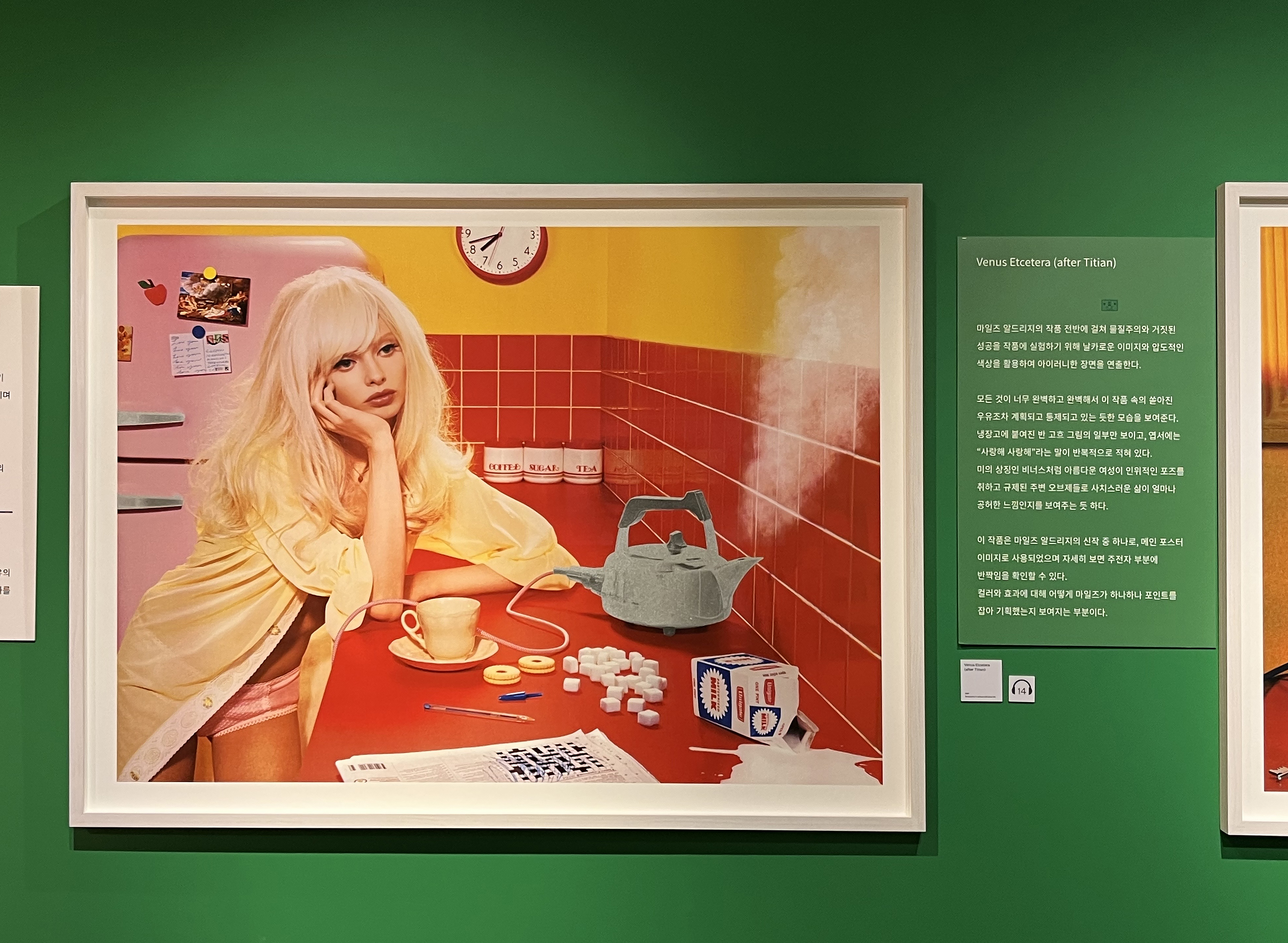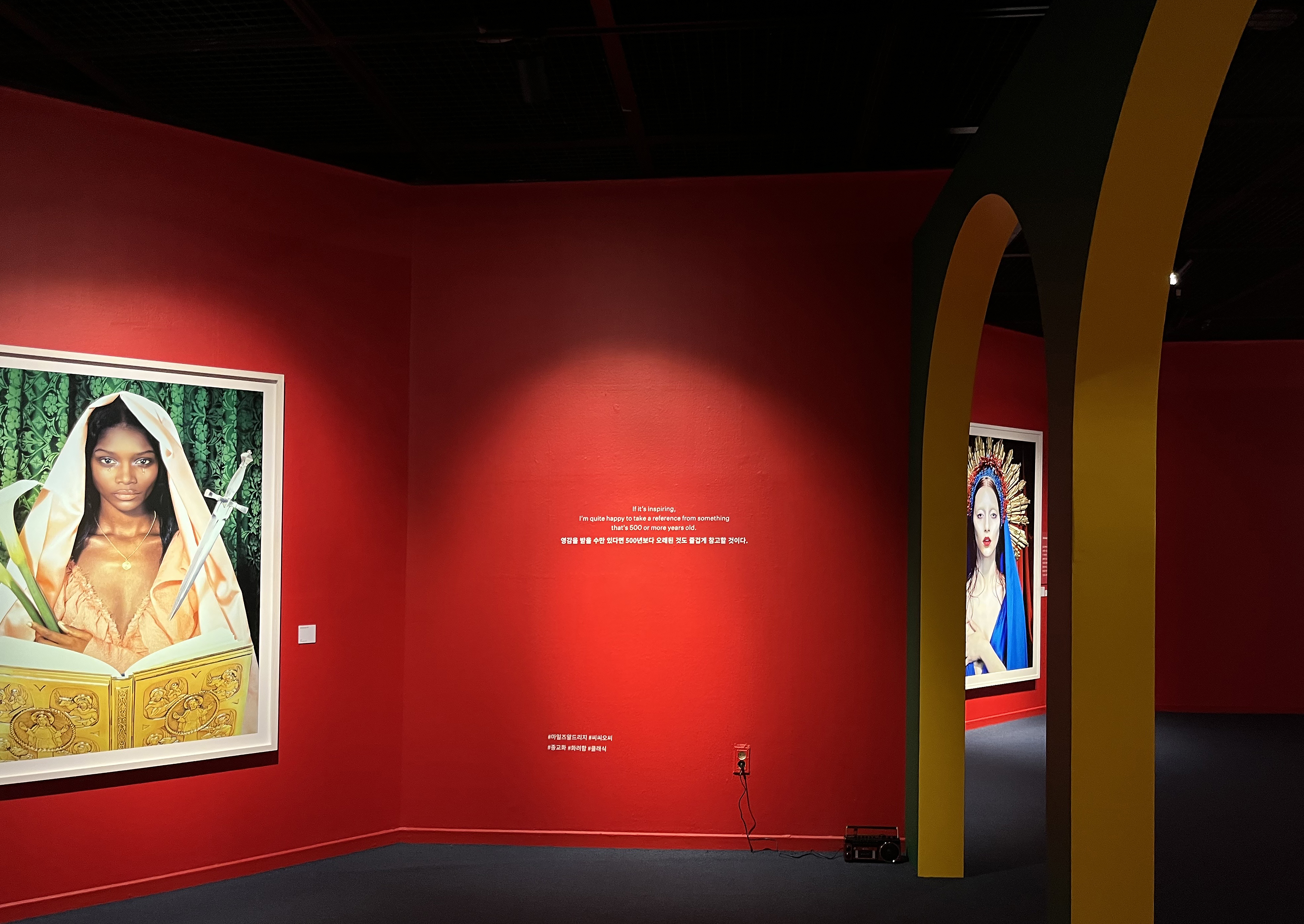 서양 미술사에서도 많은 영감을 받은 마일즈 알드리지의 작품 공간이에요. 앞선 팝한 느낌의 작품들과는 달리 초현실적인 분위기를 지닌 사진들이 강렬한 인상을 자아냅니다. 이 공간에 전시된 작품들은 주로 패션 잡지 화보로 촬영되었던 사진들이라고 해요. 드라마 ‘왕좌의 게임’ 속 배우 메이지 윌리엄스와 소피 터너의 사진도 만나볼 수 있었습니다. 소설 속 비운의 주인공, 명화에서 걸어 나온 듯한 인물과 반짝이는 장신구로 치장한 여신까지. 컬러풀한 배경과 판타지 세계의 몽환적인 느낌을 느껴보실 수 있어요. 특히 우측 하단의 성모마리아를 표현한 촬영작은 장 폴 고티에의 2007년 오뜨꾸뛰르 컬렉션을 촬영한 것으로 화려한 의상과 몽환적인 모습이 판타지적 느낌을 제대로 불러일으키고 있습니다. 이 사진은 2016년 DDP에서 진행된 장 폴 고티에 展의 포스터로도 사용된 작품이에요.