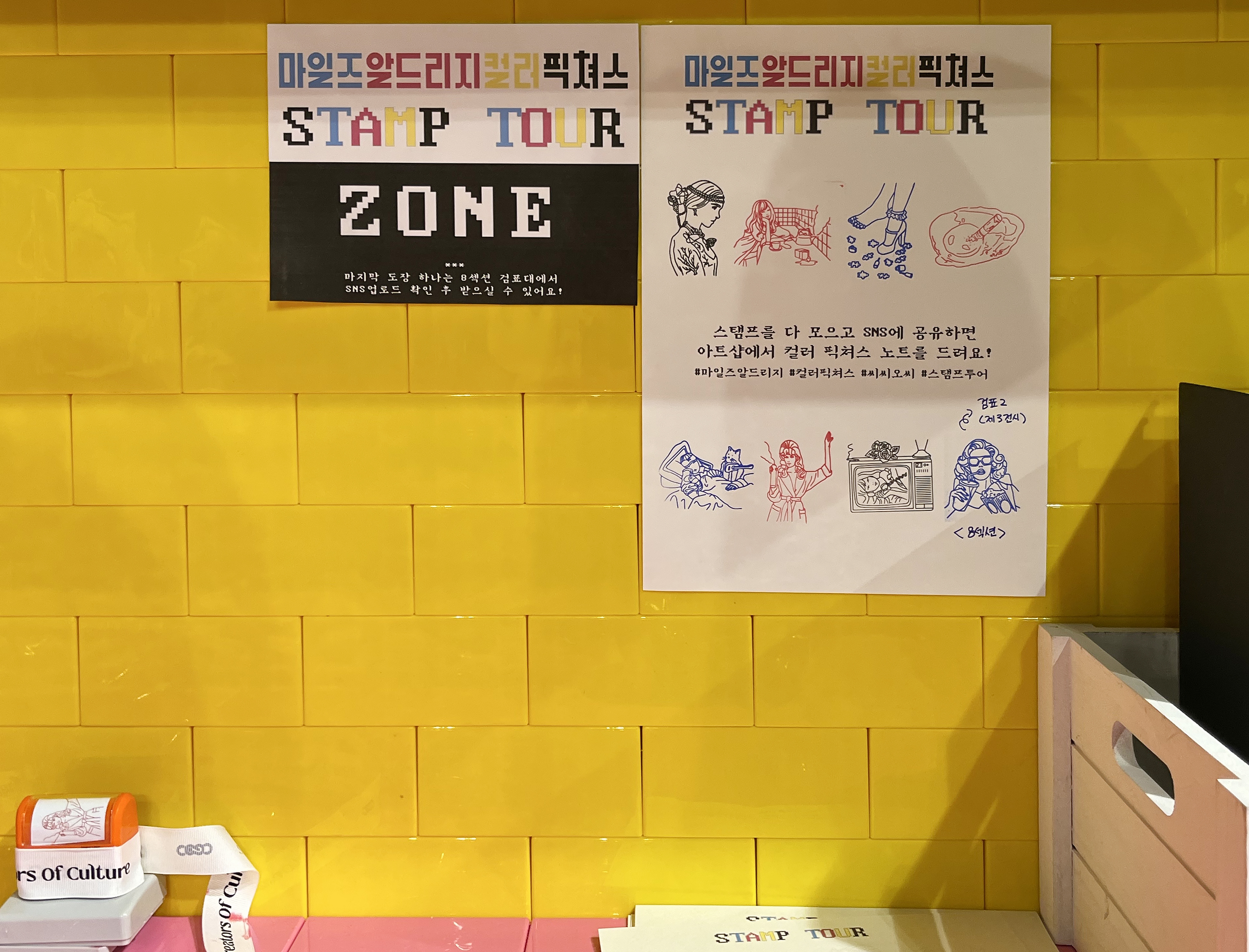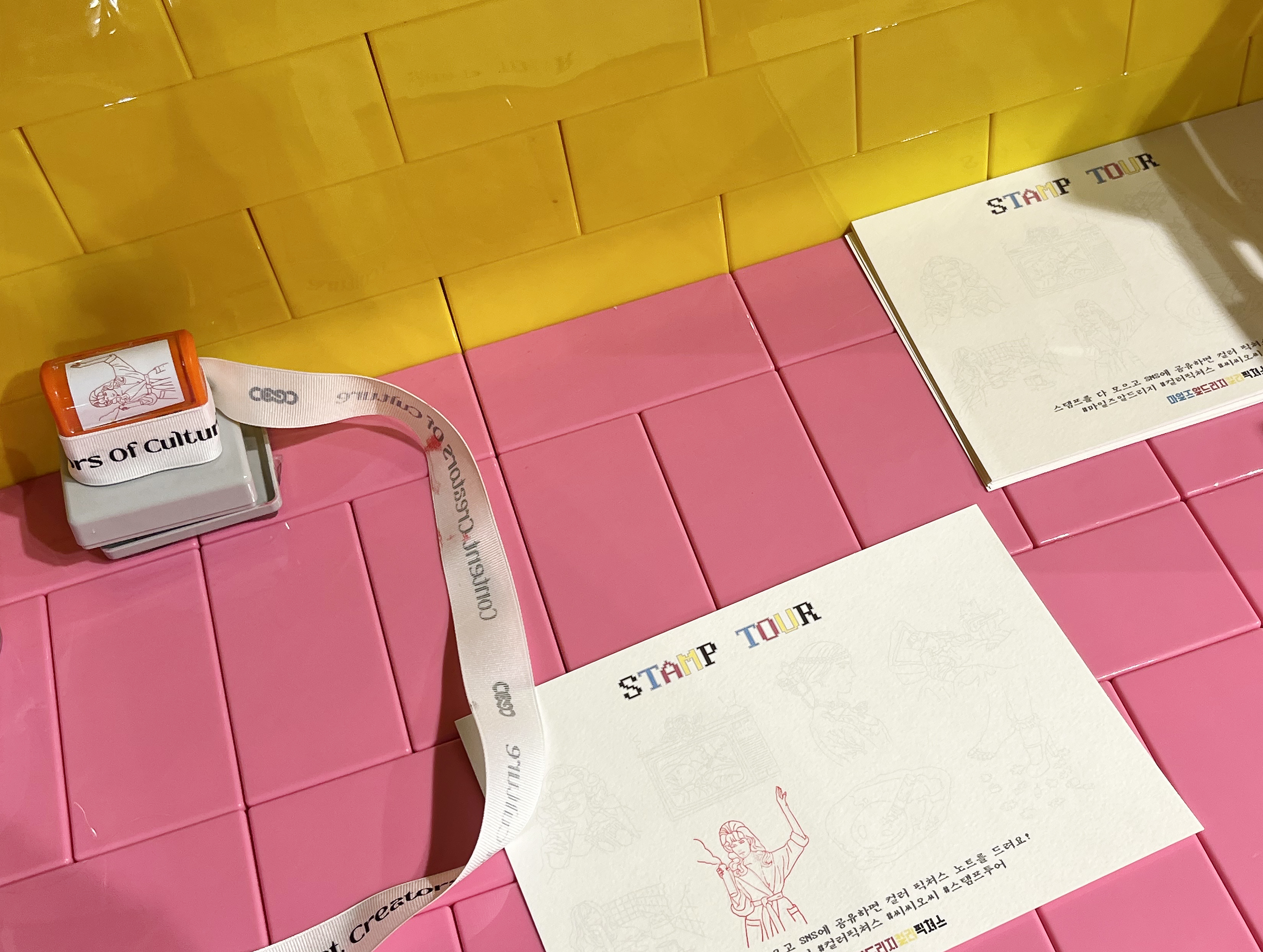 가만히 보다 보면, 이렇게 스탬프 투어라는 엽서가 하나 보이는데요. 구석구석 숨어 있는 스탬프들 8개를 모두 찍고 SNS 인증샷을 올리면 전시장 로비의 아트샵에서 굿즈로 제작된 작은 노트를 하나 준다고 합니다. 스탬프 디자인은 작품을 본떠서 만들어진 거라 콕콕 찍는 재미가 있어 8개의 스탬프가 어디에 숨어 있는지 전시장 곳곳을 더 찾게 되더라고요. 스탬프는 section 4의 브릭에서 첫 번째 스탬프가 등장해서 section 6의 하이틴에서 7번째 스탬프까지 찍을 수 있습니다. 마지막 1개의 스탬프가 없어도 놓친 것이 아니니 걱정하지 마세요! 마지막 스탬프는 마지막 Section에서 찍을 수 있어요!