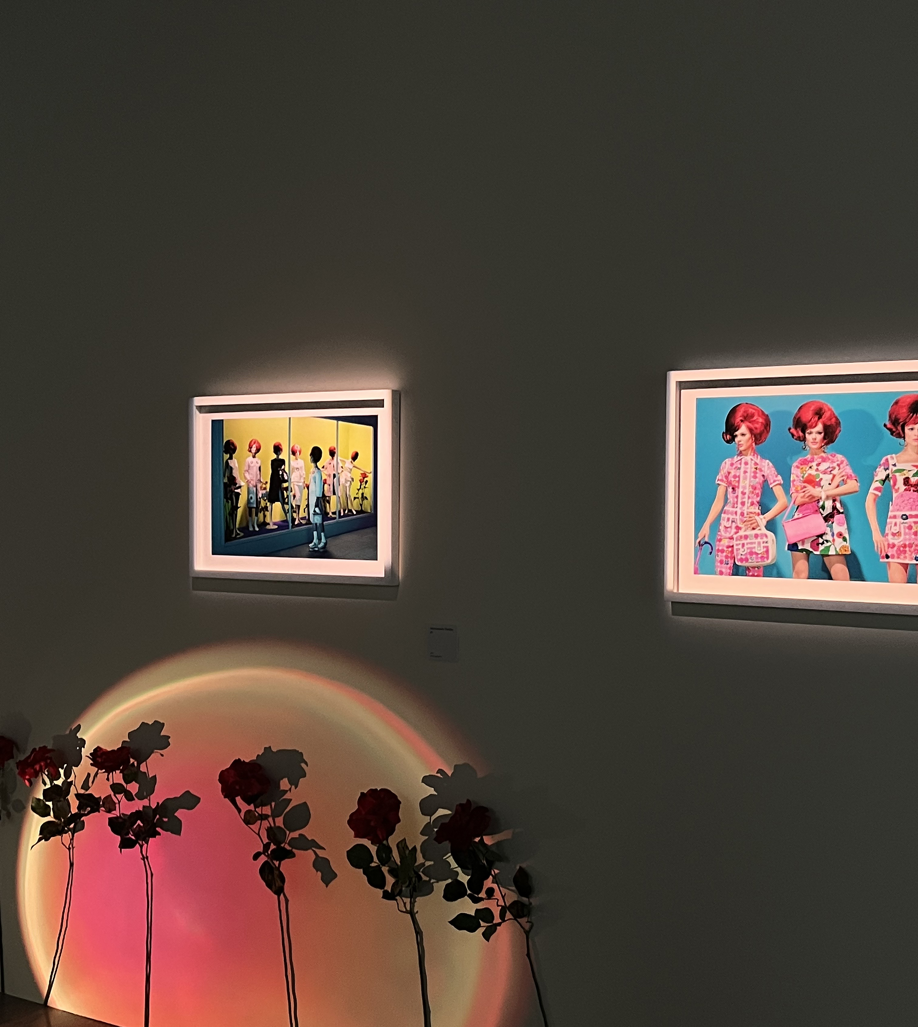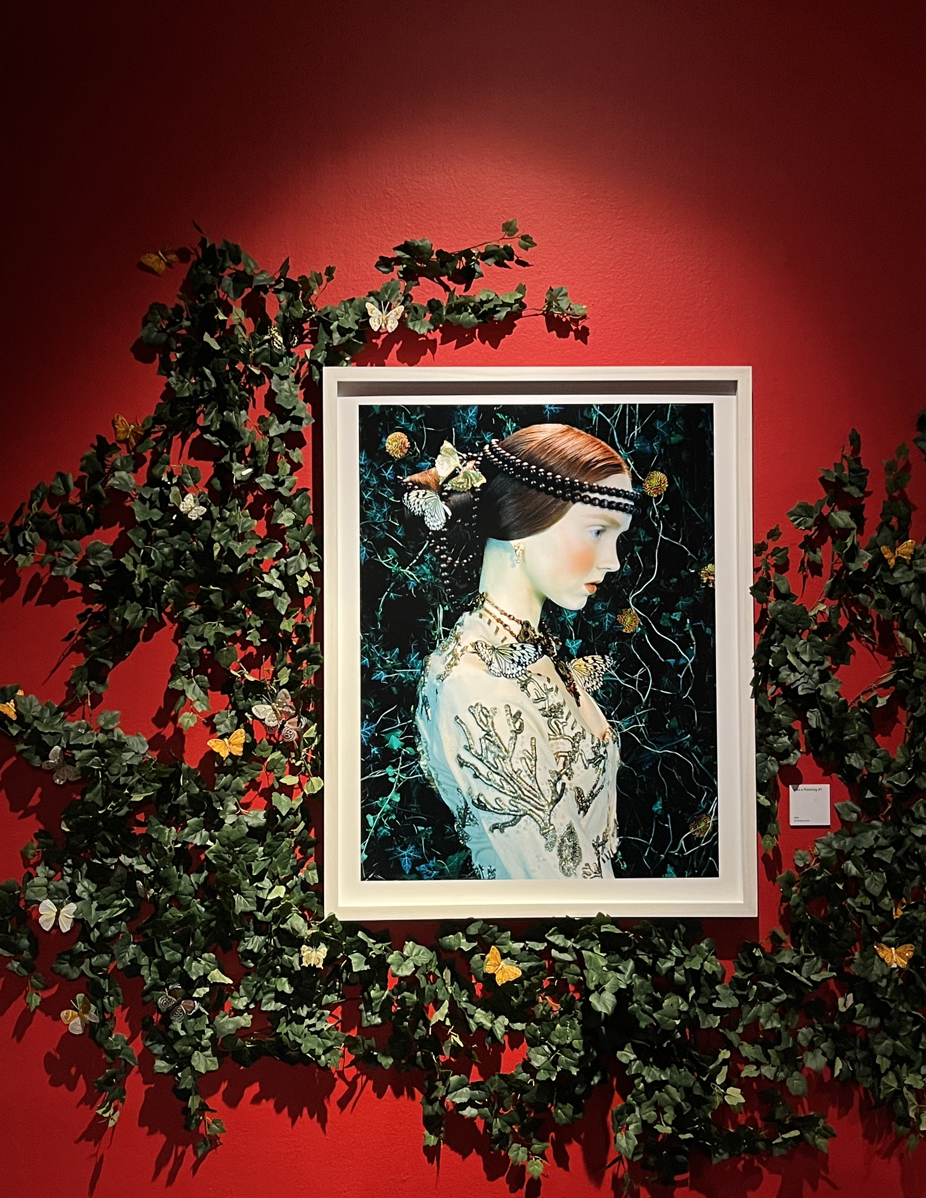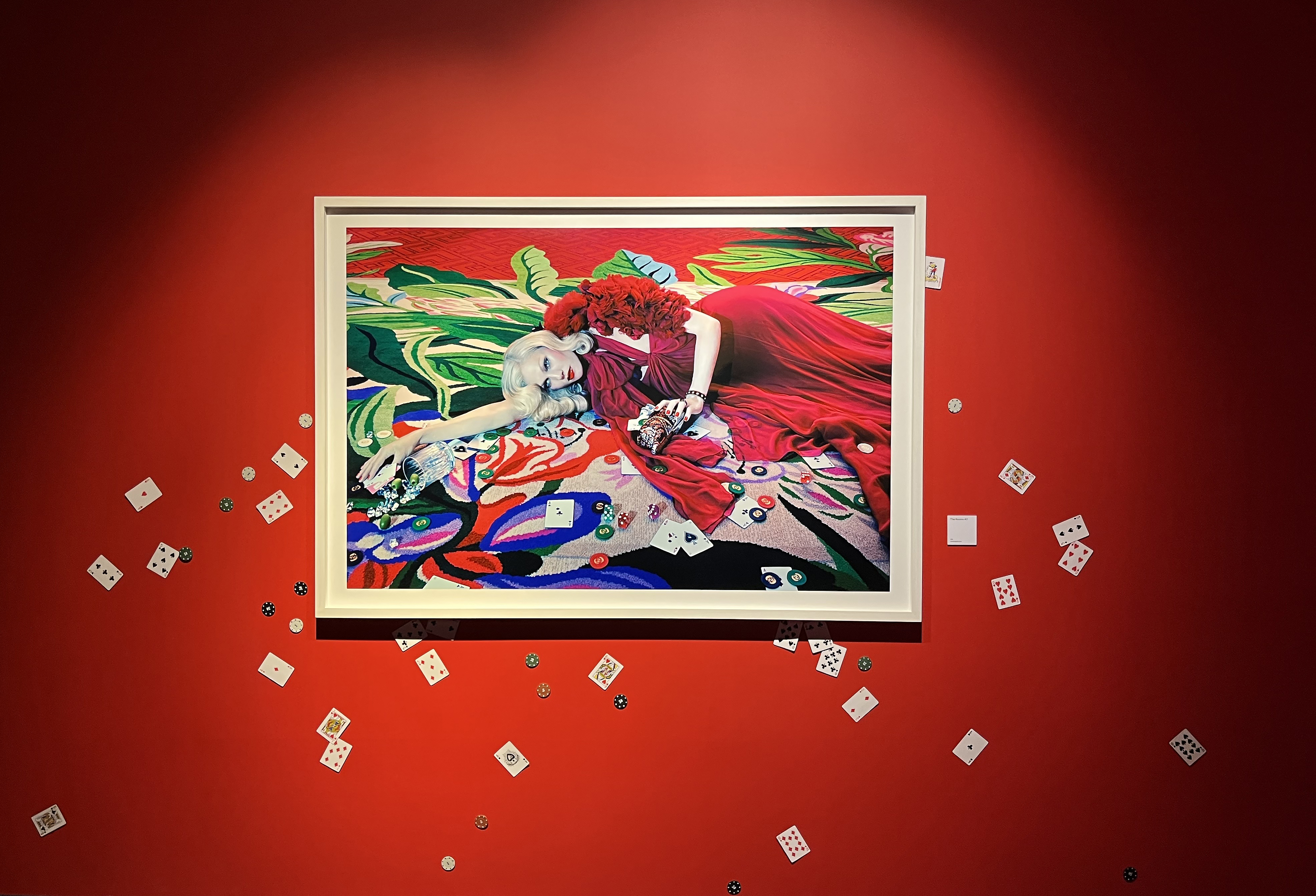 온통 강렬한 붉은 컬러가 배경을 장악해서 그런가 작품들의 명도가 한눈에 인상 깊게 들어오는 공간이었어요. 특히 매력적이었던 포인트 중 하나는 사진 액자 밖의 공간에도 사진과 이어진 것 같이, 덩굴덩 피어 있다거나, 포커가 흩어져서 벽에 붙어 있다거나 하는 연출 요소들이었습니다. 덕분에 작품이 살아 있는 것 같은 느낌을 준다고 해야 할까요?