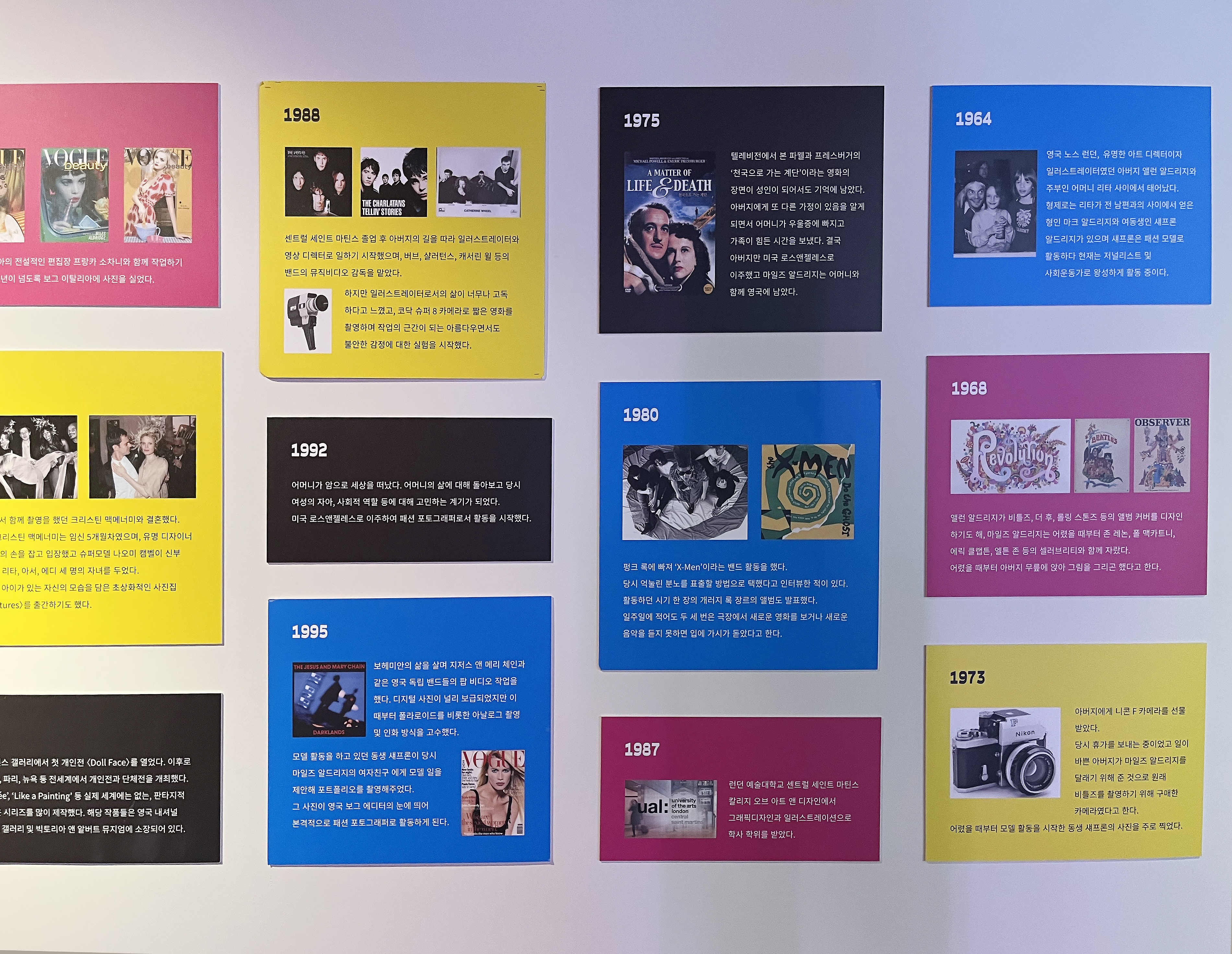 마일즈 알드리지의 작품들이 본격적으로 소개되기에 앞서 1964년부터 마일즈 알드리지의 삶에서 차지하는 중요한 포인트들이 연대기식으로 정리되어 있어요. 예술가는 태어날 때부터 차별적인 관점을 갖고 태어나는 걸까 혹은 후천적인 걸까 궁금했던 분이라면 아마 이 연대기적 설명에서도 오랜 시간 글을 읽는 데 집중하실 것 같습니다. 1964년 런던 출생의 그는 그래픽 디자이너이자 무대 예술감독인 알란 알드리지의 아들로 어릴 때부터 수시로 집에 찾아온 존 레논, 엘튼 존과 같은 유명 인사들과도 스스럼없이 지냈습니다. 그래서 엘리자베스2세 여왕의 동생인 마가렛 공주와 결혼한 스노든 백작을 촬영하기도 했어요. 전설적 뮤지션들과 셀럽의 아우라를 남들보다 쉽고 다양하게 접하며 키운 예술적 감수성 역시 그의 작업물들에 지대한 영향을 미쳤겠죠?
