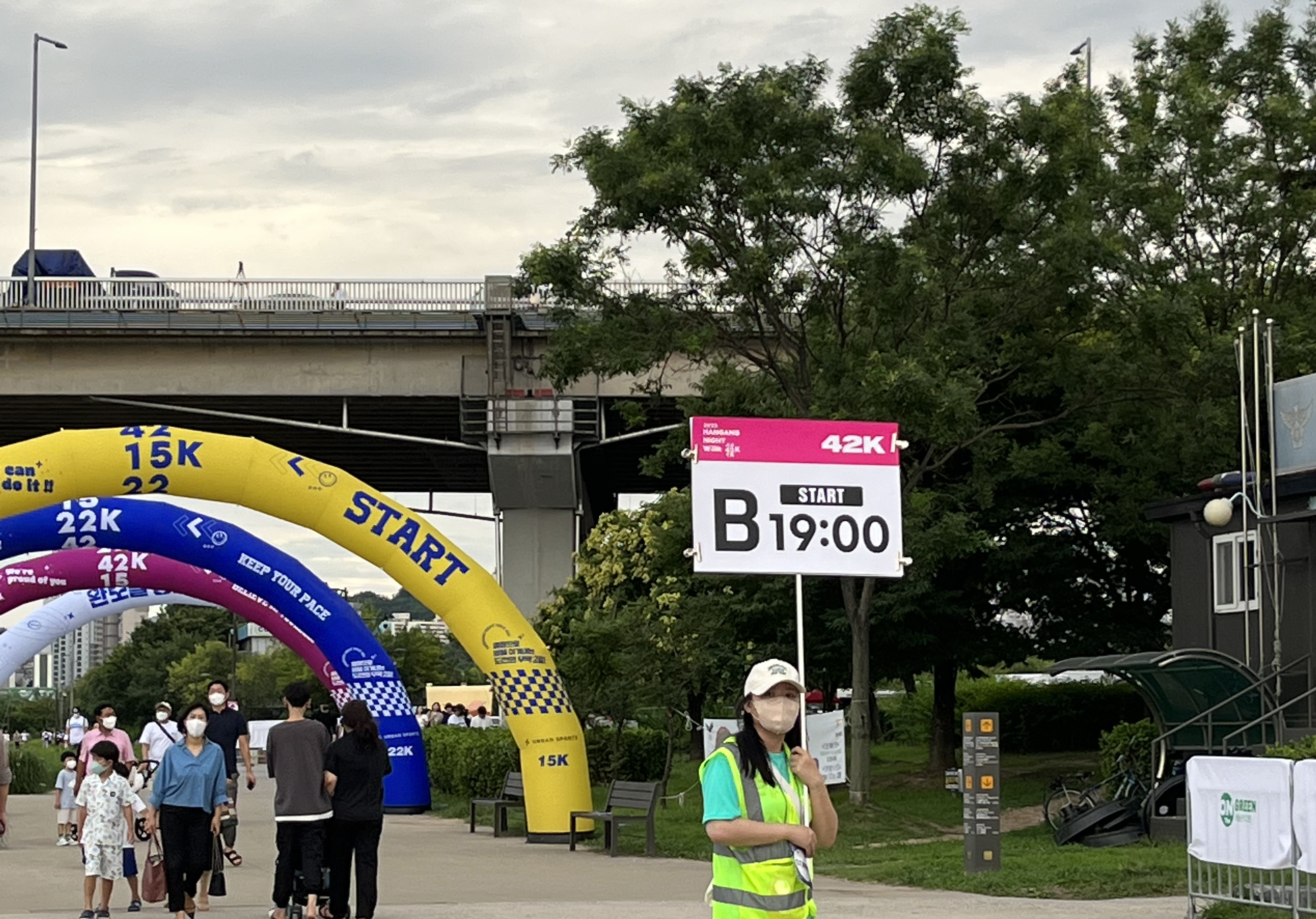 한강을 따라 걷는 한강나이트워크42K는 여의도 한강에서 시작해 광진교를 기점으로 반환하여 다시 여의도로 돌아오는 루트로 42K 코스가 짜여 있습니다. 15K와 22K를 참여하시는 분들은 출발과 시작점은 같지만 반환점이 광진교가 아닌 반포대교를 기점으로 돌아오기 시작해요. 많은 인원이 참여한 만큼 인파를 분산시키기 위해 각 그룹별로 저녁 6시~12시까지 1시간 단위로 출발 했습니다. 자신이 속한 그룹의 출발 시간 30-40분 전에 도착해 준비한 이벤트들에도 참여하고 미리 준비운동도 하며 시간을 보내면 더욱 알차게 보낼 수 있어요. 준비운동을 하는 동안 전광판에는 앞서 출발한 6시 그룹의 경과 시간이 실시간으로 카운팅 됩니다. 한강나이트워크 42K는 달리기 대회가 아니기 때문에 순위 경쟁 같은 것이 없습니다. 뛰지 않고 안전하게 완보하는 것이 목표라는 점! 명심하세요.