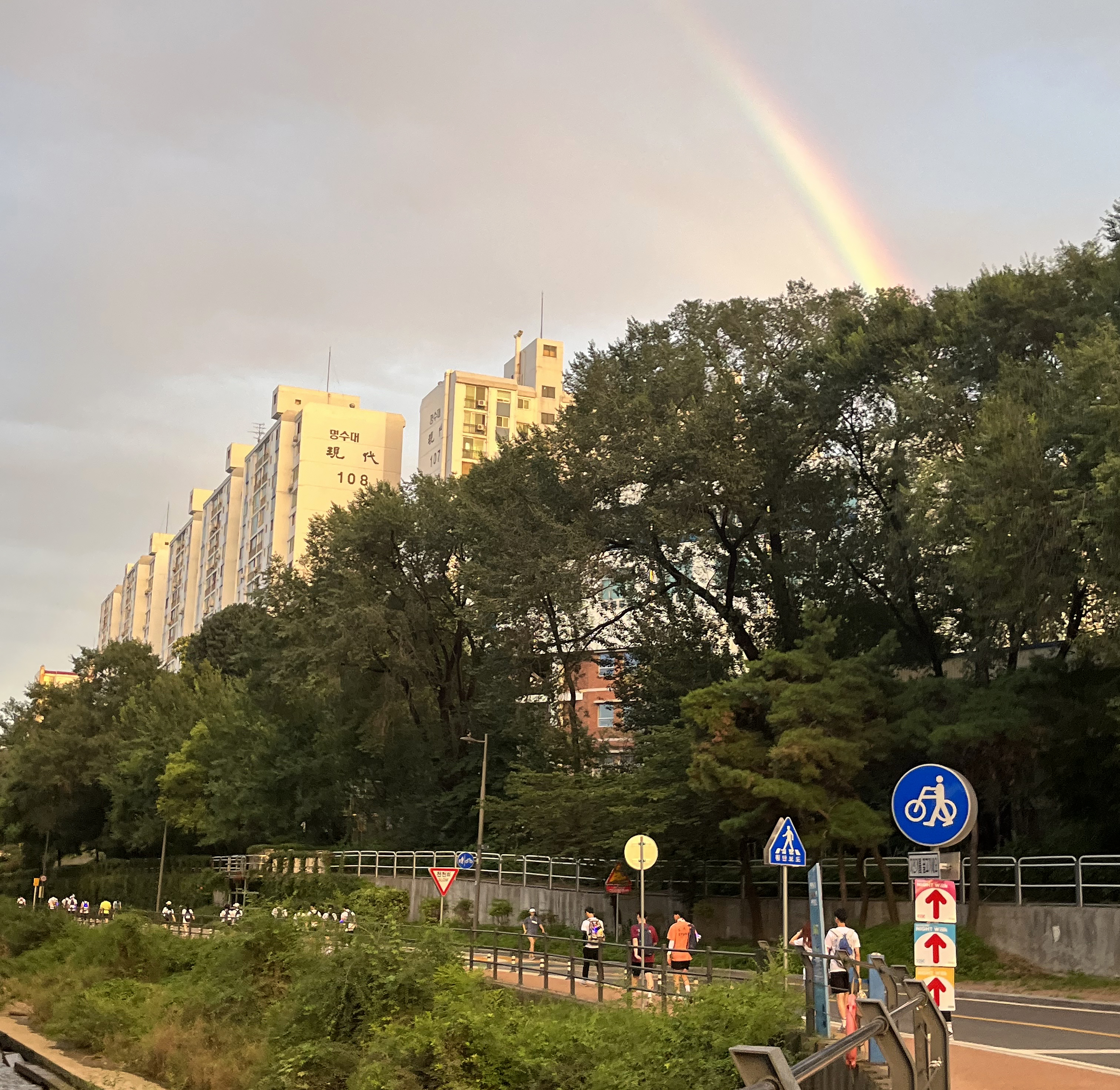 사실 42K를 도전하는 것은 저도 처음이라, 22K가 목표였으니 목표만 도달하면 중간에 집에 가야겠다 하는 생각으로 시작했었습니다. 하지만 막상 시작하고 나니 욕심이 생겼습니다. 대회가 있던 30일 토요일은 약간의 습기와 무더위가 심한 날이라 저녁 7시가 되어도 아직 더운 기운이 가시지 않았습니다. 다행히 비가 내리지는 않아 걷기에는 적합한 날이었어요. 운이 좋게도 시작한 지 얼마 되지 않아 무지개도 발견했었습니다. 올해 들어서 무지개는 처음 보는 거 같아, 열심히 걷다 말고 처음으로 가방에서 휴대폰을 꺼내 들기도 했어요.