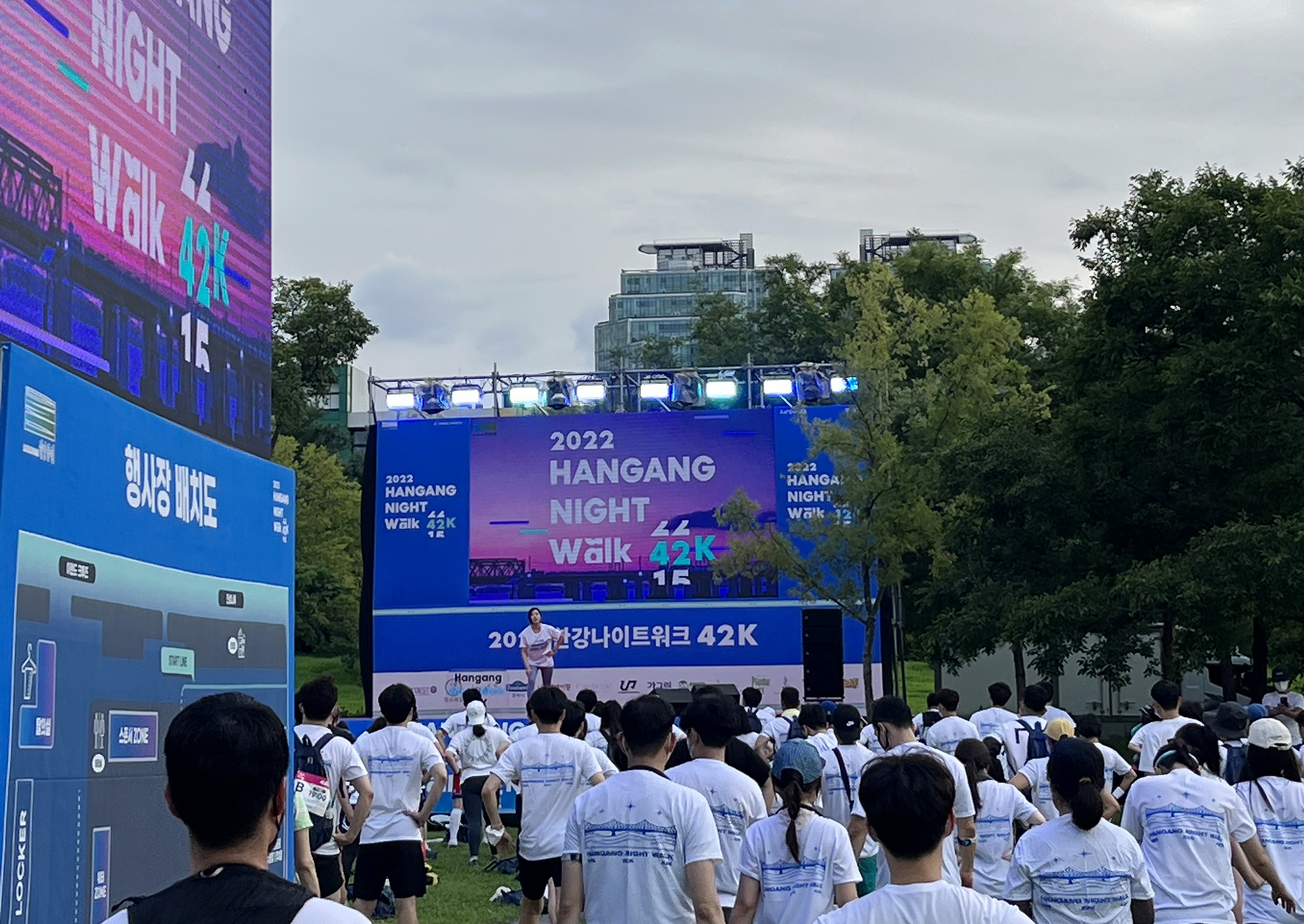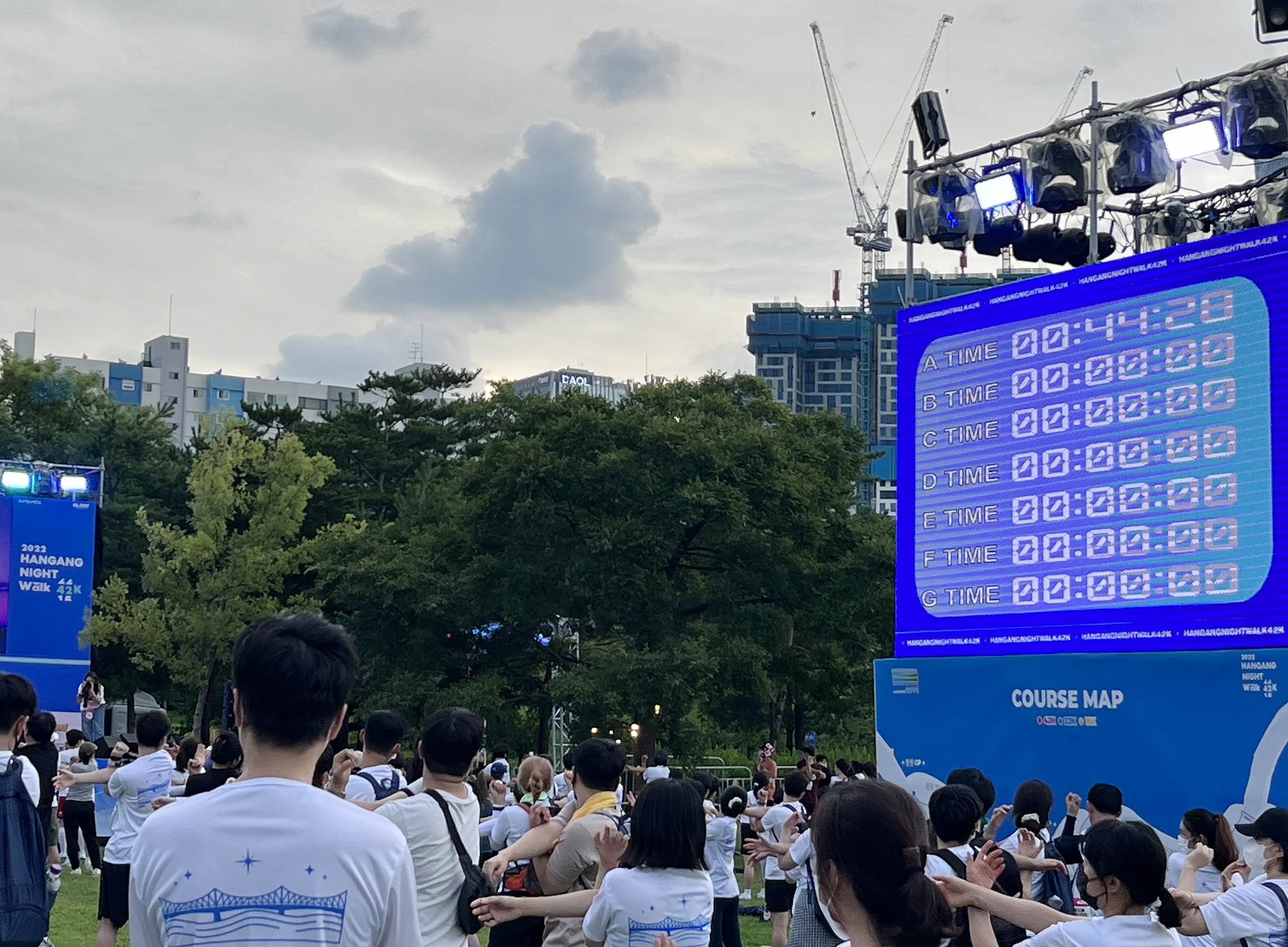 한강을 따라 걷는 한강나이트워크42K는 여의도 한강에서 시작해 광진교를 기점으로 반환하여 다시 여의도로 돌아오는 루트로 42K 코스가 짜여 있습니다. 15K와 22K를 참여하시는 분들은 출발과 시작점은 같지만 반환점이 광진교가 아닌 반포대교를 기점으로 돌아오기 시작해요. 많은 인원이 참여한 만큼 인파를 분산시키기 위해 각 그룹별로 저녁 6시~12시까지 1시간 단위로 출발 했습니다. 자신이 속한 그룹의 출발 시간 30-40분 전에 도착해 준비한 이벤트들에도 참여하고 미리 준비운동도 하며 시간을 보내면 더욱 알차게 보낼 수 있어요. 준비운동을 하는 동안 전광판에는 앞서 출발한 6시 그룹의 경과 시간이 실시간으로 카운팅 됩니다. 한강나이트워크 42K는 달리기 대회가 아니기 때문에 순위 경쟁 같은 것이 없습니다. 뛰지 않고 안전하게 완보하는 것이 목표라는 점! 명심하세요.