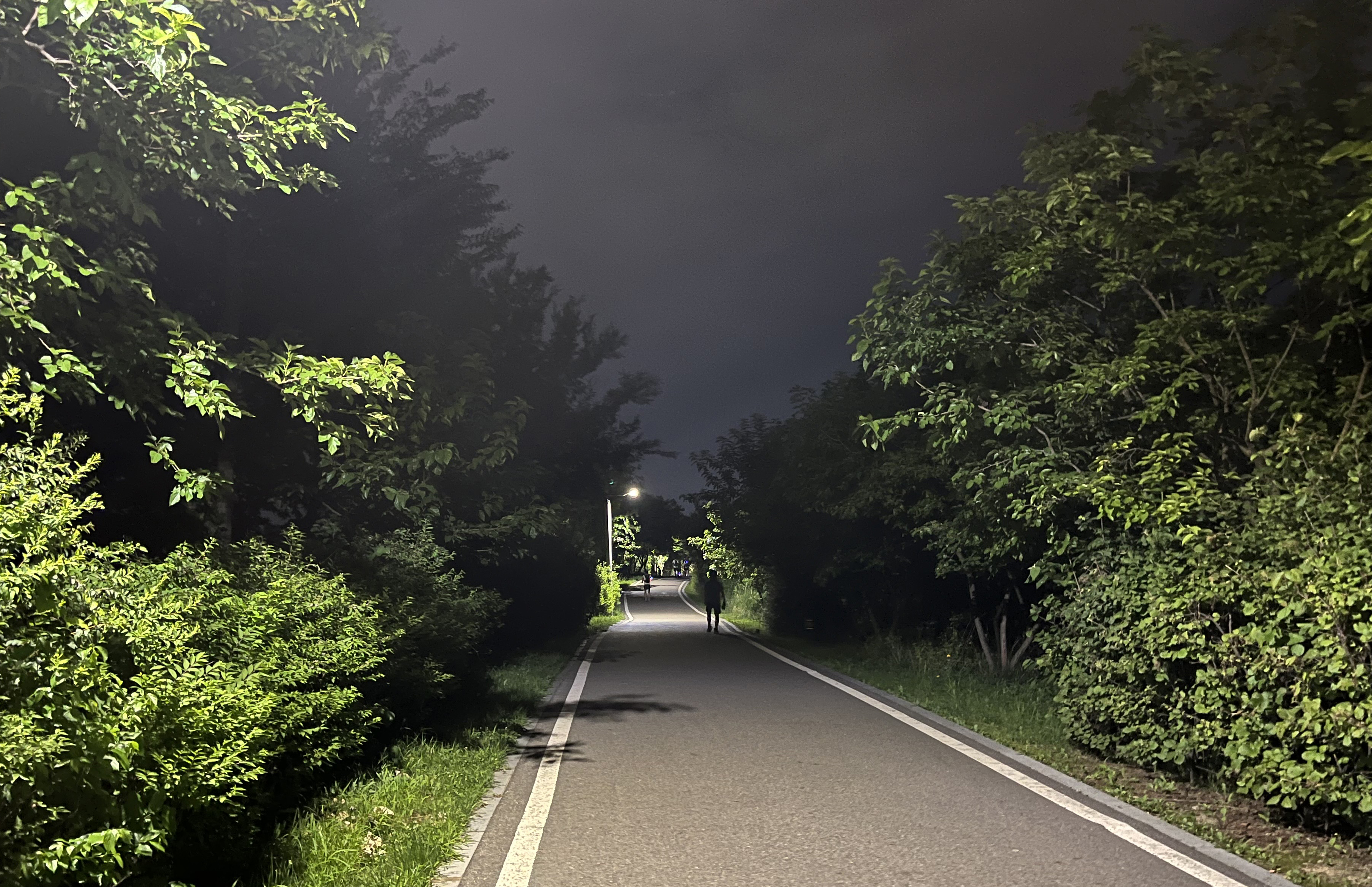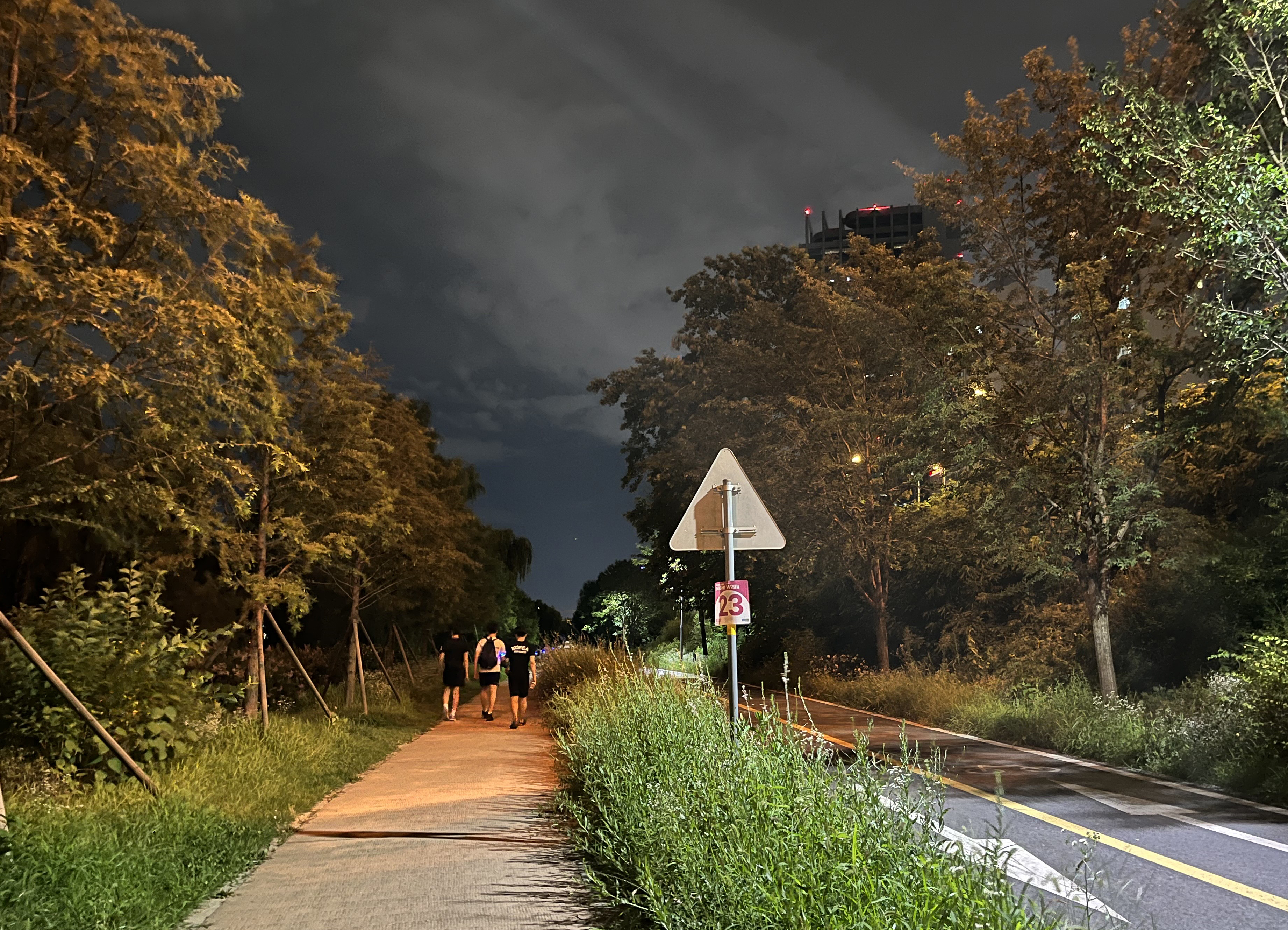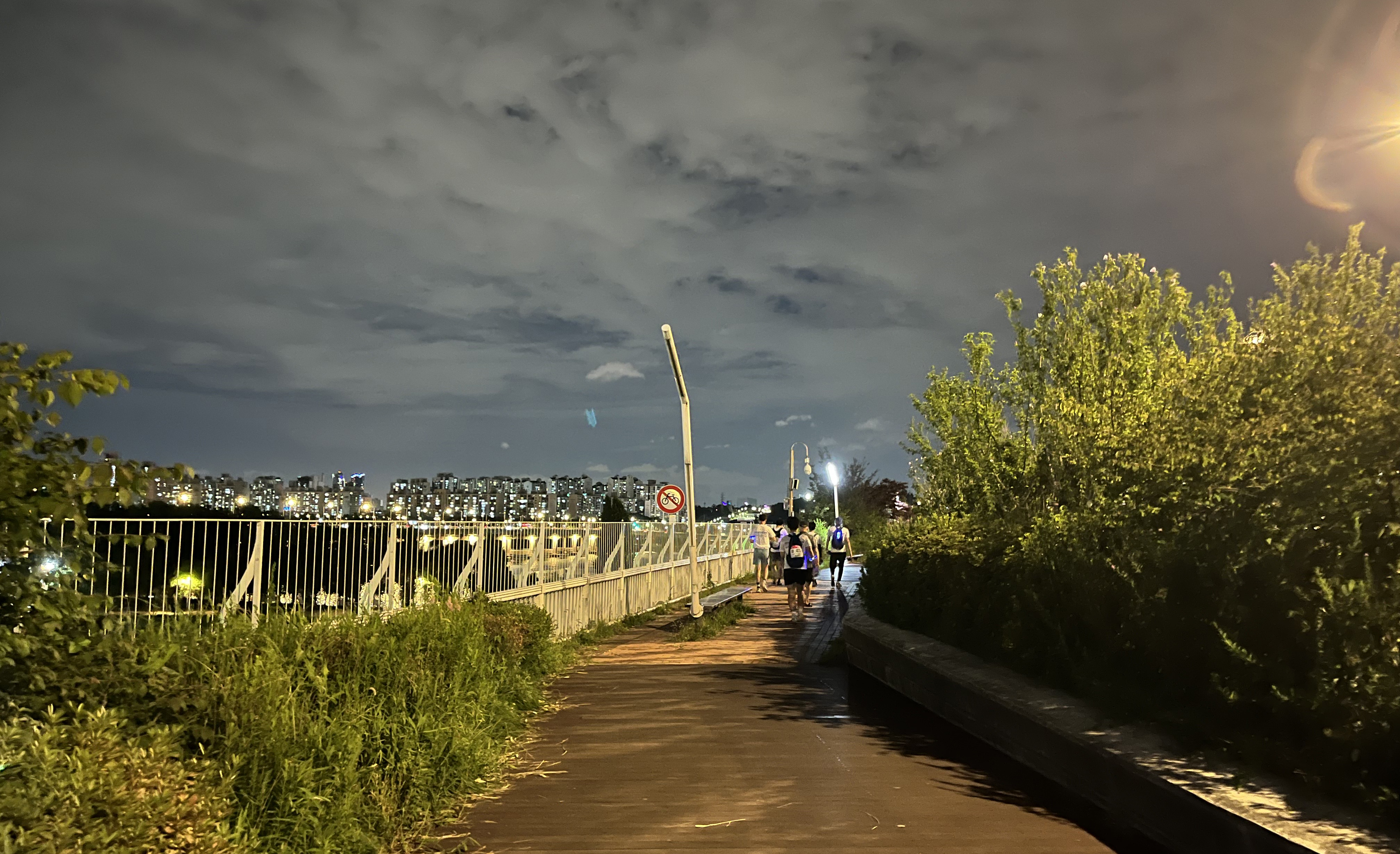 여름 날씨인 요즘은 겨울보다 날이 늦게 저물기 때문에 저녁 7시 30분~8시 사이면 점점 어둑해지기 시작해요. 7시에 시작해서 약 1시간 정도 걷다 보니 슬슬 땅거미가 내려앉았습니다. 걷다 보면 2-3km마다 지금 몇키로 걸었다 이런 표지판이 눈에 띄게 붙어 있어서 내가 어느 정도 왔구나, 어느 정도 남았구나 페이스를 조절할 수 있어요. 저녁 6시에 시작해 새벽 내내 걷는 무박 2일 한강 나이트 워크! 더위를 피해 저녁에 한강을 걸으면서도, 함께 걷는 사람들이 많아 무섭지 않았습니다. 이 밤에 선선하게 한강을 따라 안전하게 걸을 수 있다는 것. 이게 좋아서 매년 사람들은 신청하는 게 아닐까요?