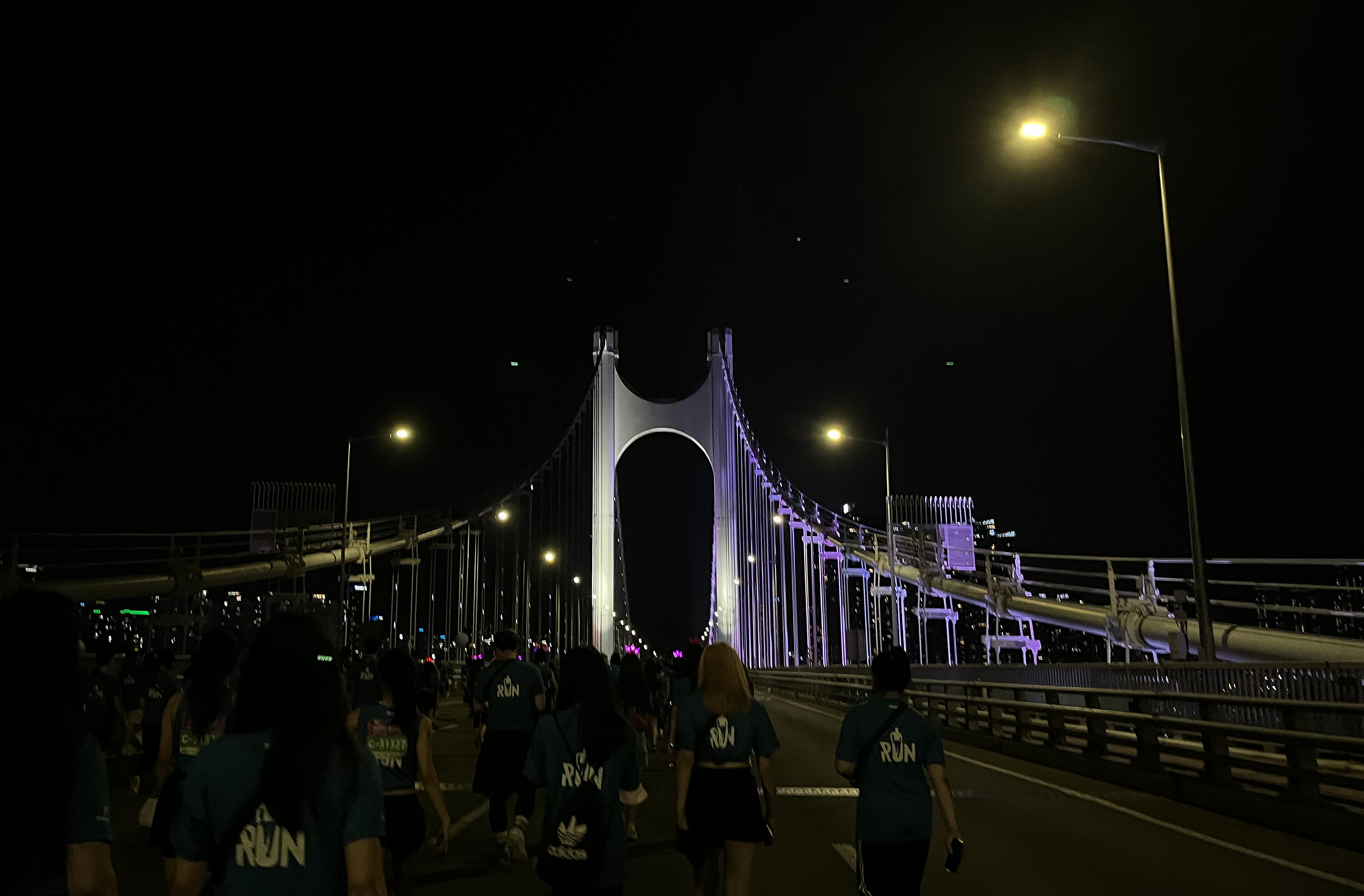 드디어 시작된 나이트레이스! 광안리 야외 무대에서 광안대교까지 천천히 이동한 다음 다리 초입에 가까워지면서 모두 하나 둘 달리기 시작합니다. 광안대교 초입에 다다르면 지나온 경로들이 한눈에 보이면서, 옆에서 보는 광안대교의 모습 역시도 상당히 멋있었습니다. 총 인원 1만 명을 그룹별로 나누어 출발시켰기 때문에 지나치게 붐비지는 않았지만, 그룹 간의 스타트 간격이 20분 미만으로 정체 구간들이 종종 발생했다는 점 참고해 주시면 좋을 것 같아요. 참고로 7km는 무척 긴 레이스가 아니기 때문에 코스의 중간 많은 워터 존이 존재하진 않았어요. 워터 존의 물이 시원한 편은 아니니 차가운 물을 드시고 싶다면 미리 시원한 물을 한 병 챙겨오시는 걸 추천합니다.