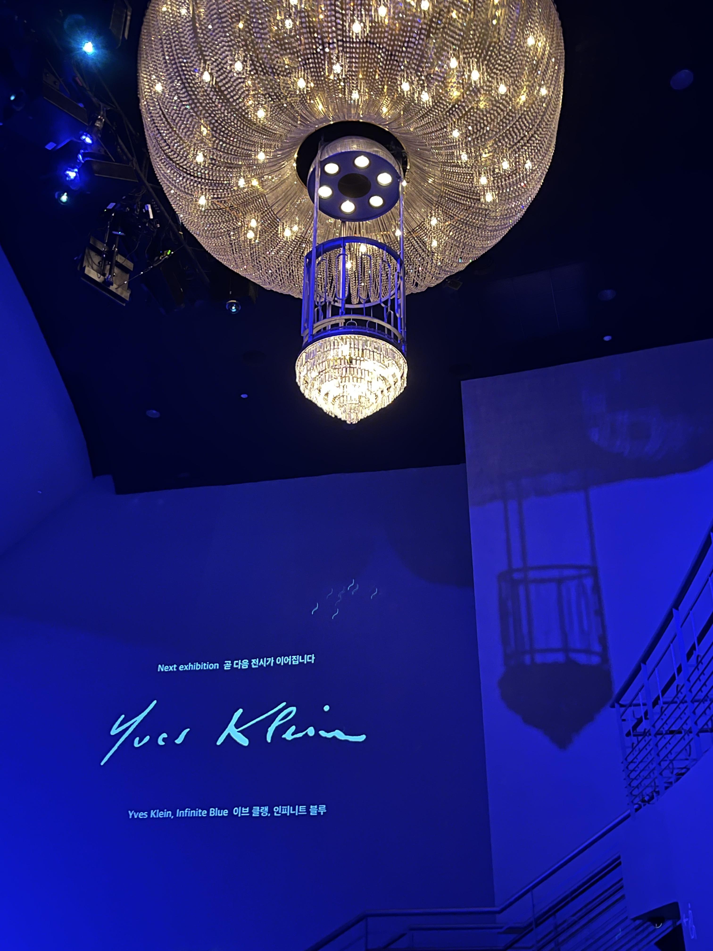 클림트 골드 인 모션 티켓을 끊으면 10분 정도로 펼쳐지는 미니 전시, 이브클랭의 인피니티 블루가 이어지는데요. 이브 클랭은 지중해의 하늘을 동경하며 영감의 원천으로 삼았다고 합니다. 온통 푸른 빛이 가득했던 이브클랭의 인피니티블루는 사실 그만의 색이라고 하는데요. 파란색이 하늘의 색이자 그에게는 정신적인 색이며 온전한 자유를 주는 색으로 다가왔다고 합니다. 1960년 클랭은 아예 자신만의 물감을 개발해 IKB(International Kelin blue)라는 이름으로 특허까지 받은 최초의 화가인데요. 이후 그의 작품에서도 이 파란색이 자주 등장하는 걸 볼 수 있습니다.