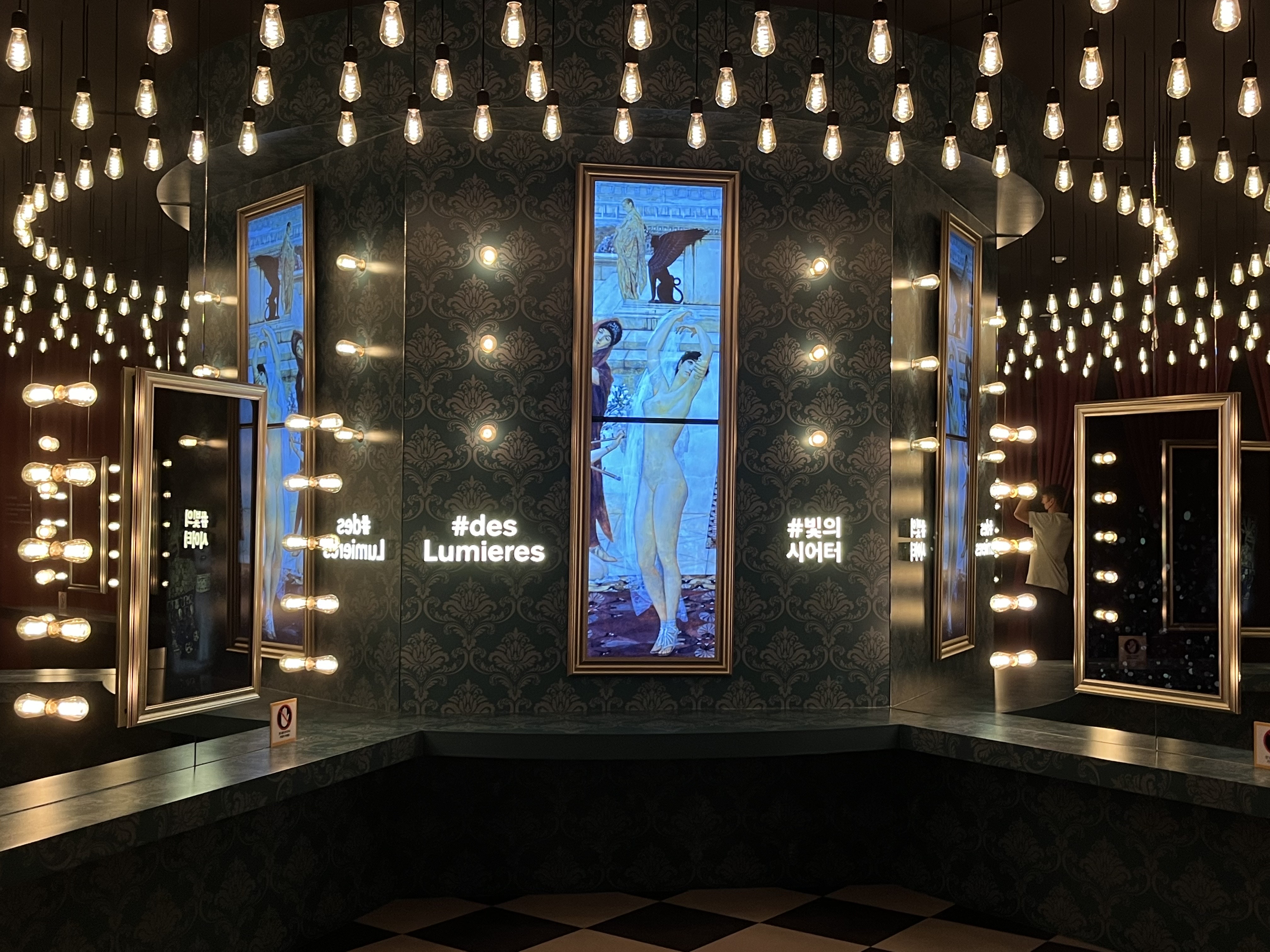 1963년 개관한 ‘워커힐 시어터’는 오랜 기간 국내외 방문객에게 다양한 공연을 선보이던 공연 문화계의 상징적인 공간이었는데요. 이 공간을 현대식으로 재해석하고, 기존의 공간의 의미를 살리는 방향으로 하여 지금과 같이 ‘빛’을 매개로 음악과 작품이 하나가 되는 전시 공간으로 재탄생 하였답니다. ‘빛의 시어터’ 라고 이름 붙은 이 전시 공간에서는 압도적인 스케일과 확실한 선명도로 관람할 수 있는 명화의 아름다움 등을 통해 조금 더 몰입감 있는 전시를 관람할 수 있었어요. 특히 옛날 워커힐 시어터의 특징을 살리기 위해 전시장 입구 양 끝 천장에 매달린 샹들리에와 리프트의 자리를 그대로 두어 과거의 흔적을 보존한 것 또한 인상적이었습니다.