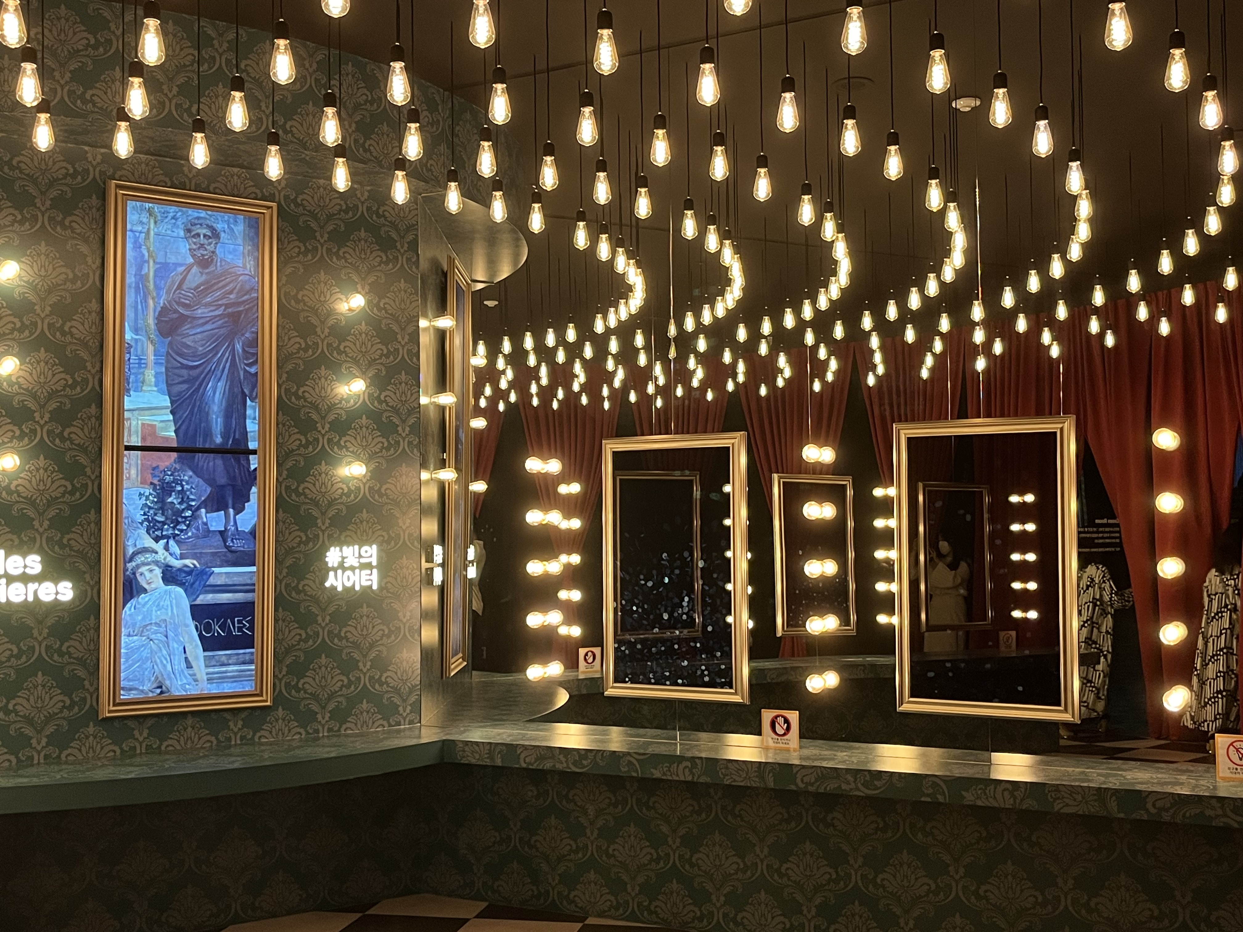 미러룸 외에도 빛의 시어터에는 매력적인 공간들이 많아 전시 내용 외에도 시각적인 즐거움이 가득했습니다. 지하 2층 무대 공간의 양쪽 벽면에는 각각 숨겨진 방이 있는데요, 그중 과거 분장실로 쓰이던 그린룸을 발견할 수 있었습니다. 이 그린룸은 과거 배우들의 대기실이자 분장실이었다고 해요. 이 장소는 배우들의 심신의 안정을 위해 벽을 초록색으로 칠해 그린룸이라고 이름 붙였다고 합니다. 상당히 웅장한 느낌의 공간이고, 거울도 놓여 있어서, 거울에 비친 모습을 찍어도 멋있는 사진이 나왔어요.