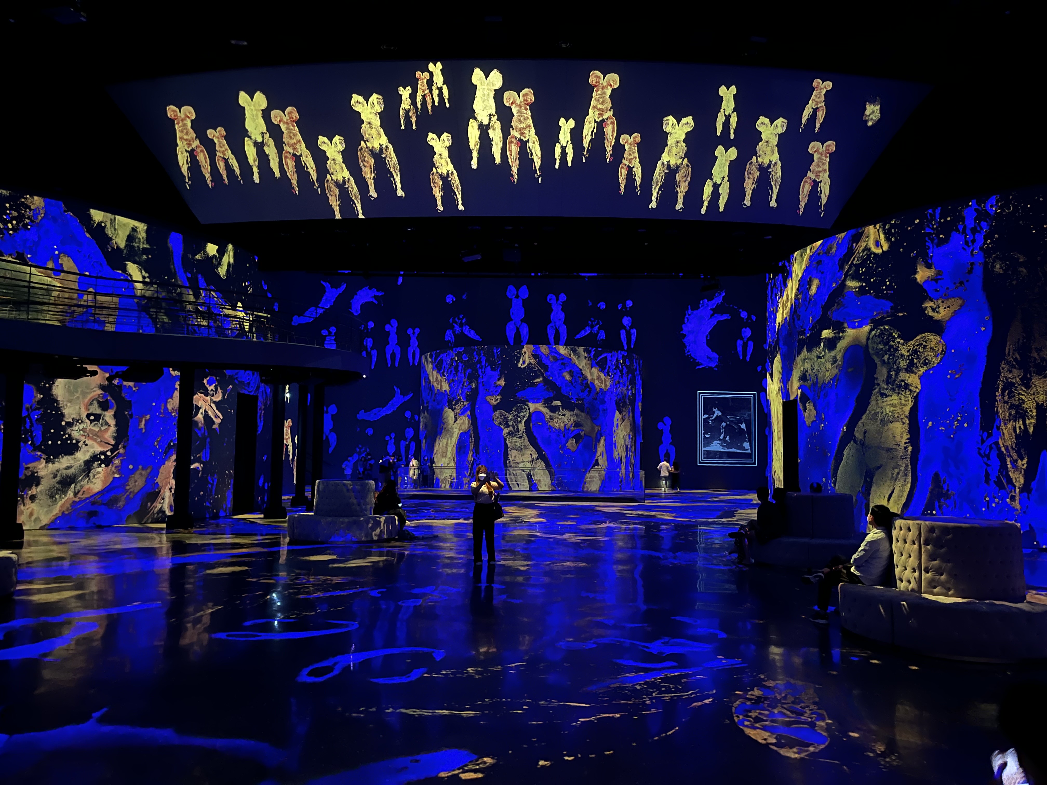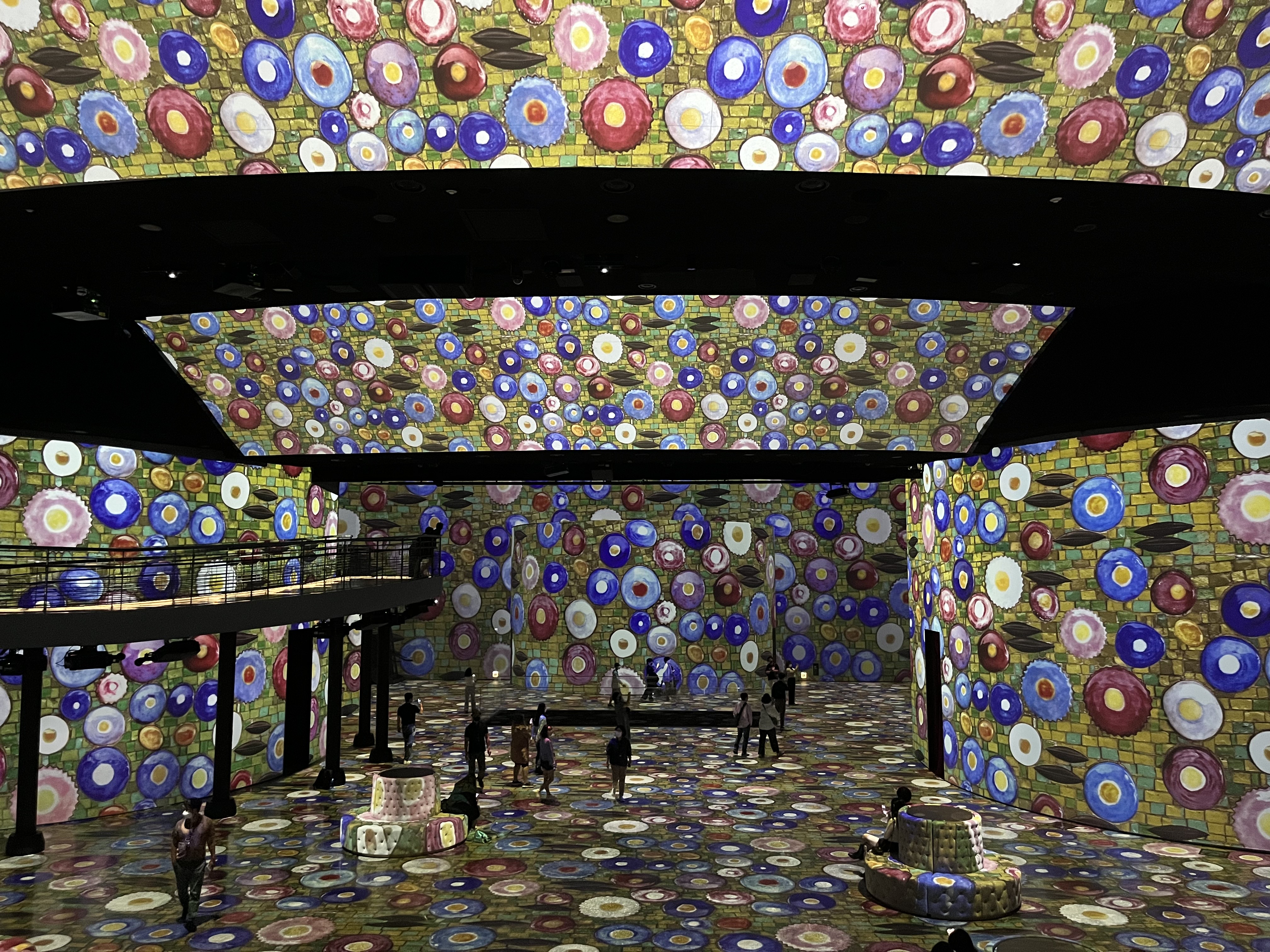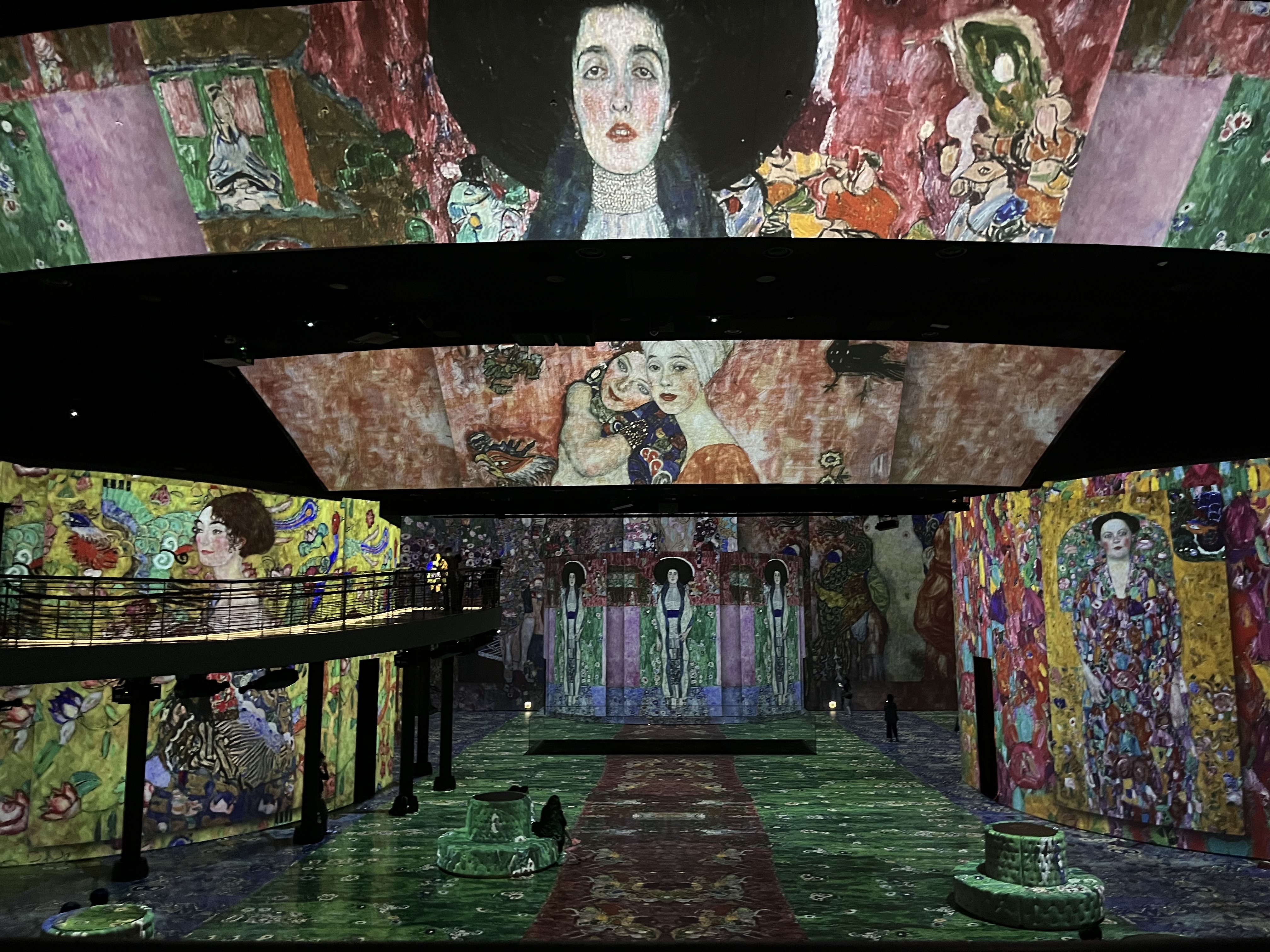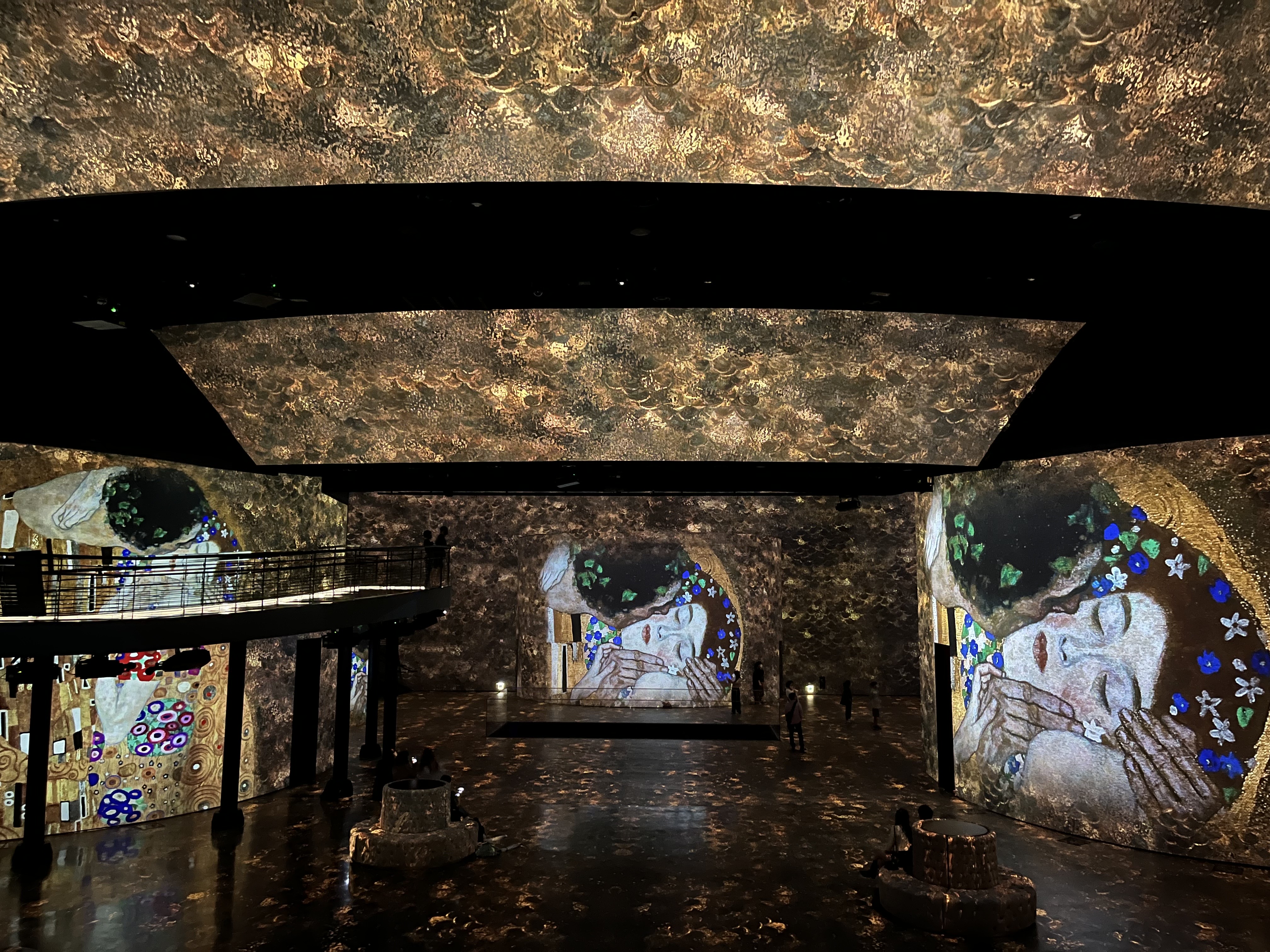 이번 시리즈는 20세기 황금빛 색채의 화가라고 불리는 오스트리아 회화의 거장 클림트의 명작이 이번 전시의 테마였는데요. 그의 대표작 ‘키스’를 비롯한 여러 작품들이 전시장의 벽과 기둥, 바닥 360도의 공간에 투영되는 화려한 광경과 웅장하게 울리는 음악소리를 통해 몰입도 있게 전시를 즐길 수 있었습니다. 특히 이번 전시에서는 구스타프 클림트의 골드 인 모션 전시가 약 30분간 이루어지고, 이후 10분간 펼쳐지는 이브클랭 인피니티 블루 전시가 이어집니다. 또 전시가 진행되는 동안 시어터의 숨겨진 공간들에서는 컨템포러리 쇼인 벌스/메모리즈 두 개의 영상도 각각 13분, 4분 동안 재생된다고 해요.