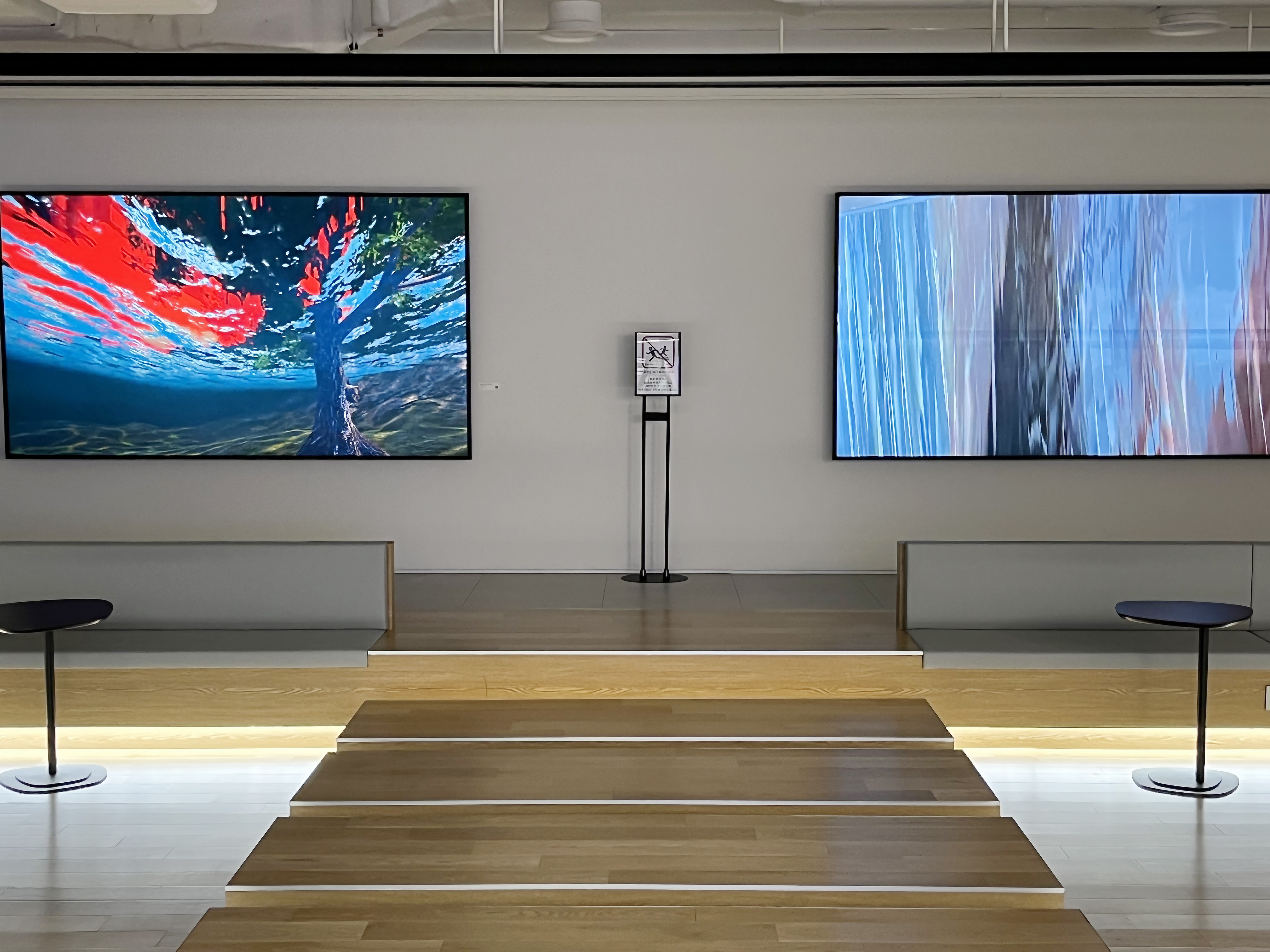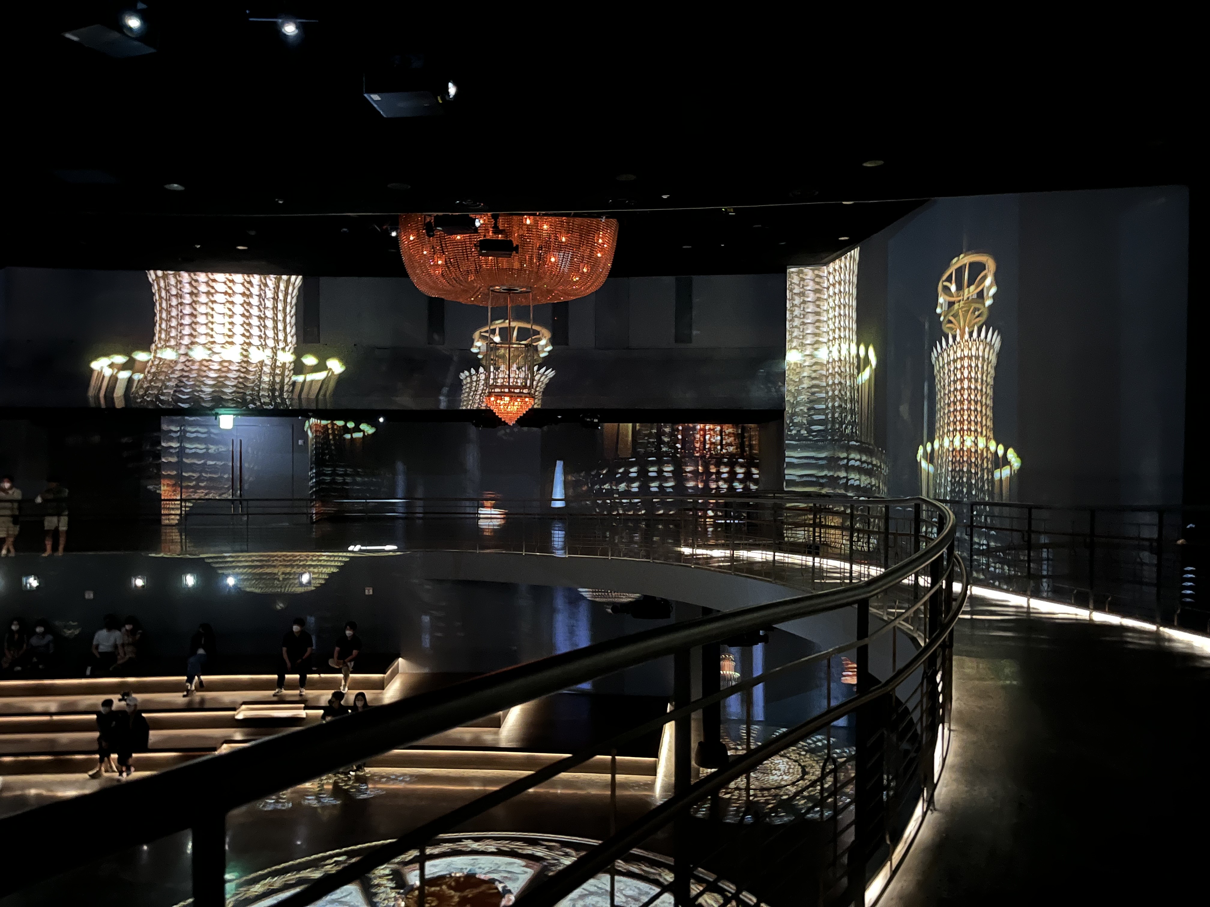 메자닌에서 계단을 타고 아래로 내려오면, 과거 스테이지로 쓰였던 무대들이 연결되는데요. 무대 밖 정면에서 봤을 때 가장 중앙 스크린 역할을 하던 돔 형태의 벽 안쪽은 미러룸으로 꾸며져 있어 직접 들어갈 수 있었습니다. 똑같이 밖에 재생되는 영상들이 벽면에 투영되고, 이 작품들이 거울에 그대로 비춰 작품 속에 내가 퐁당 빠진 것 같은 몰입감을 주는 공간입니다.