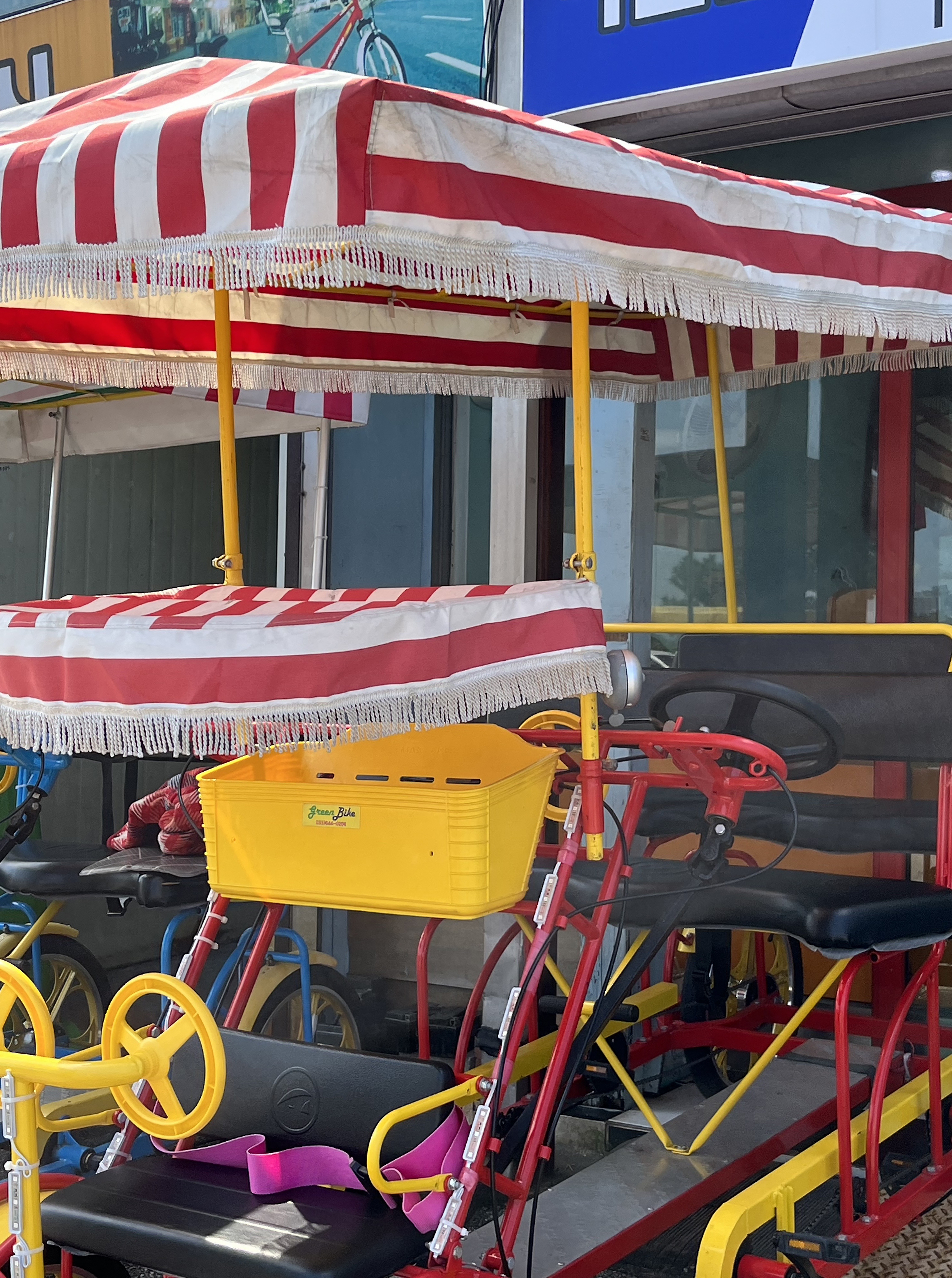 최근 들어 경포호 주변에 상당히 많이 생겼습니다. 경포호 한 바퀴를 자전거 타고 돌며 즐길 수 있도록 1시간 동안 대여가 가능하다고 해요. 비용은 다인승 자전거를 대여할 때 1시간에 2만원에서 2만 5천원 정도가 필요합니다. 2인승 자전거는 이런 여행지에서 종종 본 적이 있었지만 5명 6명의 많은 인원이 함께 탈 수 있는 자전거는 처음 봐서 색다른 매력이 있었어요. 꼭 놀이동산에서 팝콘을 파는 차 같기도 하고, 이게 정말 운전할 수 있는 건가? 싶기도 한 커다란 탈것이 바로 6인까지도 탑승이 가능한 4인승 자전거였어요. 페달은 총 4개 자리에서 밟을 수 있고, 덩치 작은 어린이들은 두 운전자 사이에 깍두기로 앉아 있을 수 있을 것 같습니다.