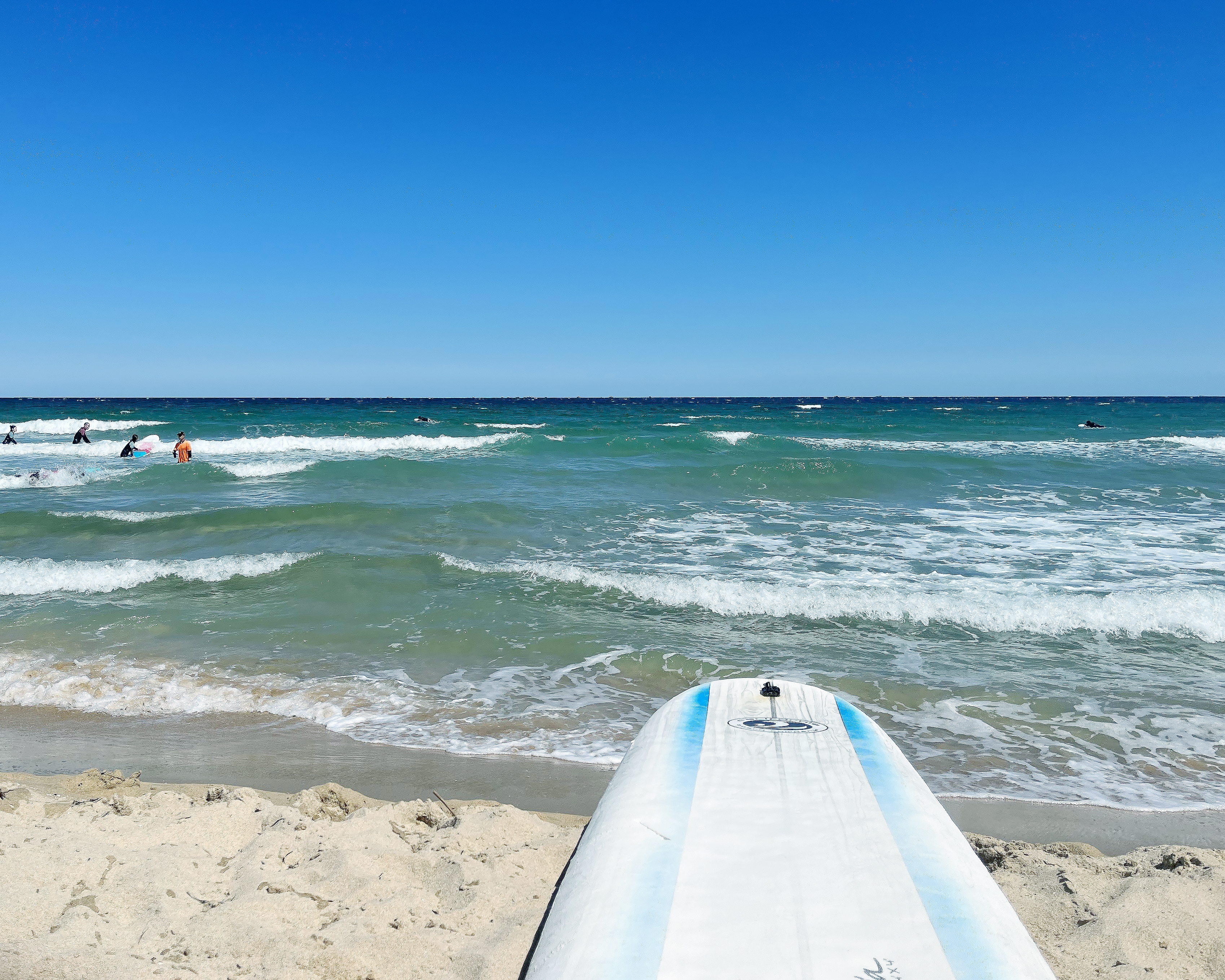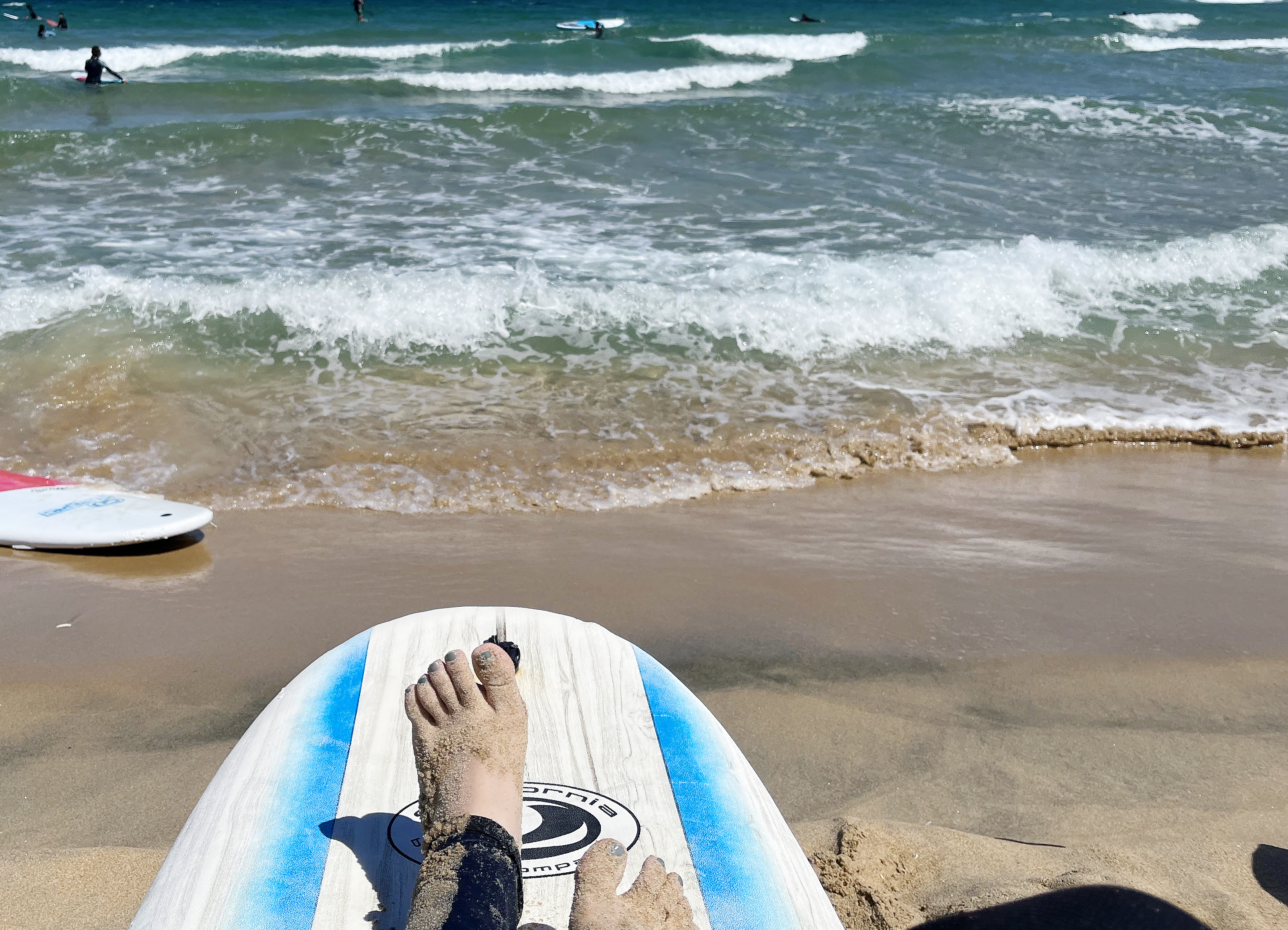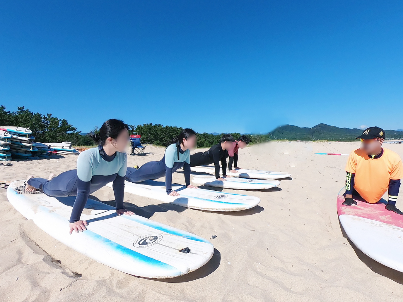 처음에는 실내에서 이론 교육을 먼저 하고 난 후에 차를 타고 인근 해안으로 이동해 실습을 시작하는데요. 각 보드의 위치, 위험시 대처사항 등에 대해 먼저 배우고, 먼저 익숙해지기 위해 모래 위에서 직접 보드 위에 올라타 일어서기까지의 연습을 하는 시간을 가졌습니다. 그냥 모래 위에서 일어나는 건 쉽지만, 서핑이 처음이신 분들은 바다 위에서 보드 한 장에 의지해 몸을 일으키는 게 절대 쉽지 않기 때문에 물에 들어가기 전에 꼭 한 번이라도 더 연습을 해보시는 게 좋아요.