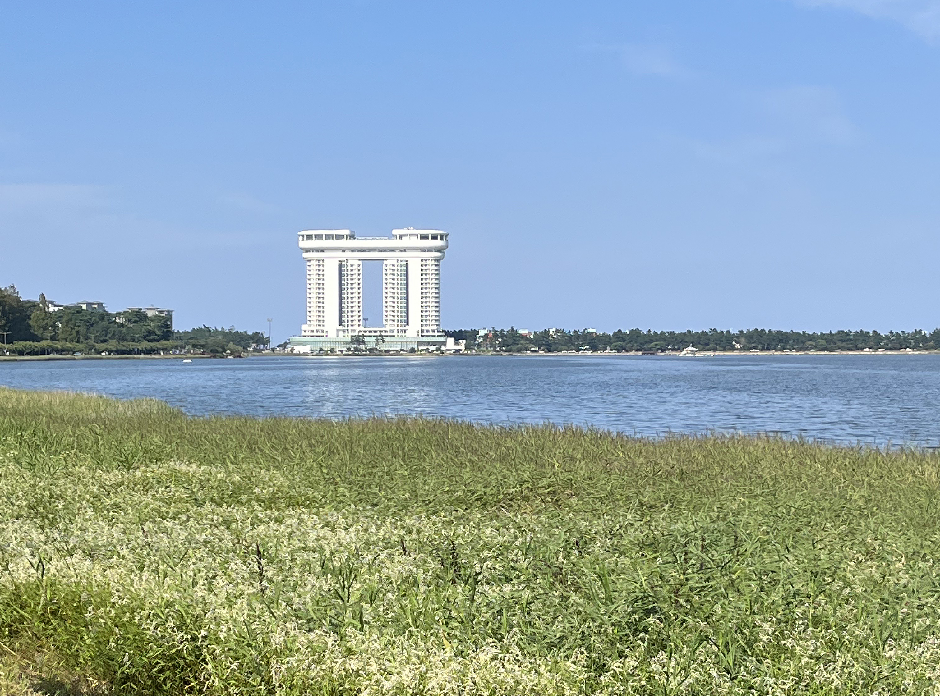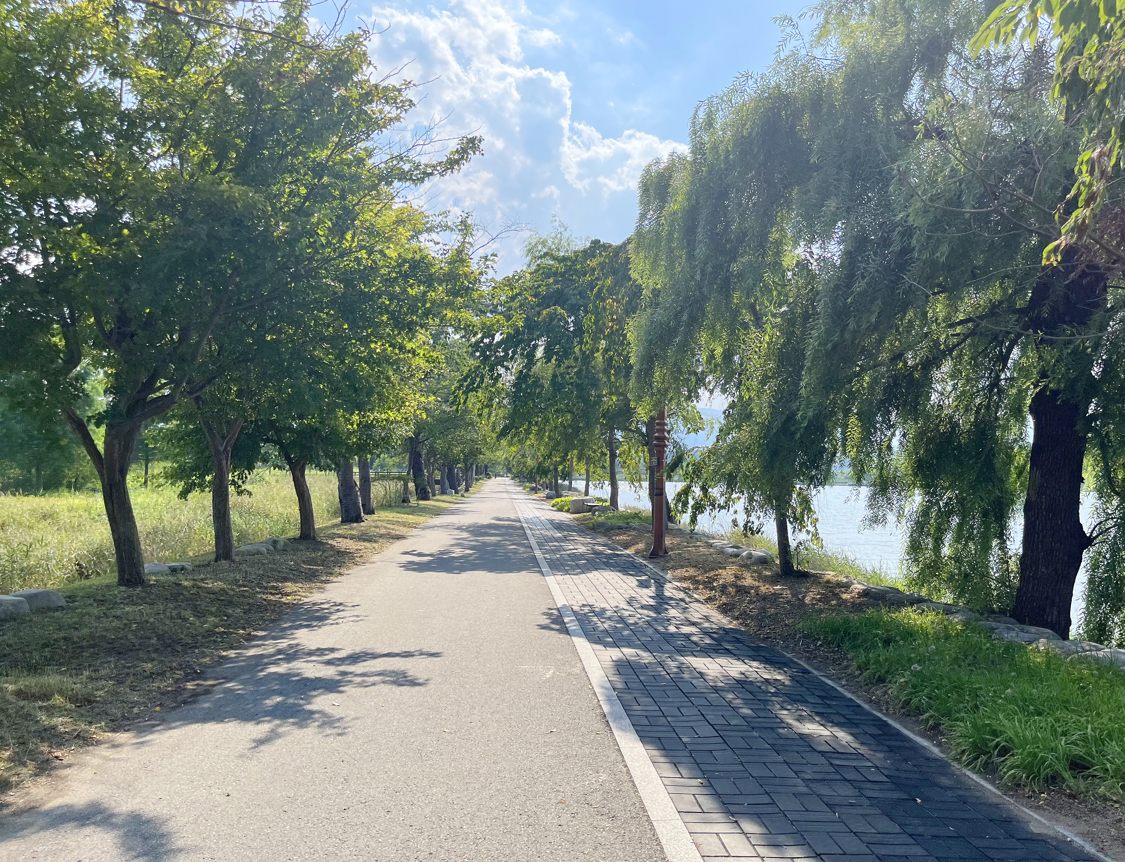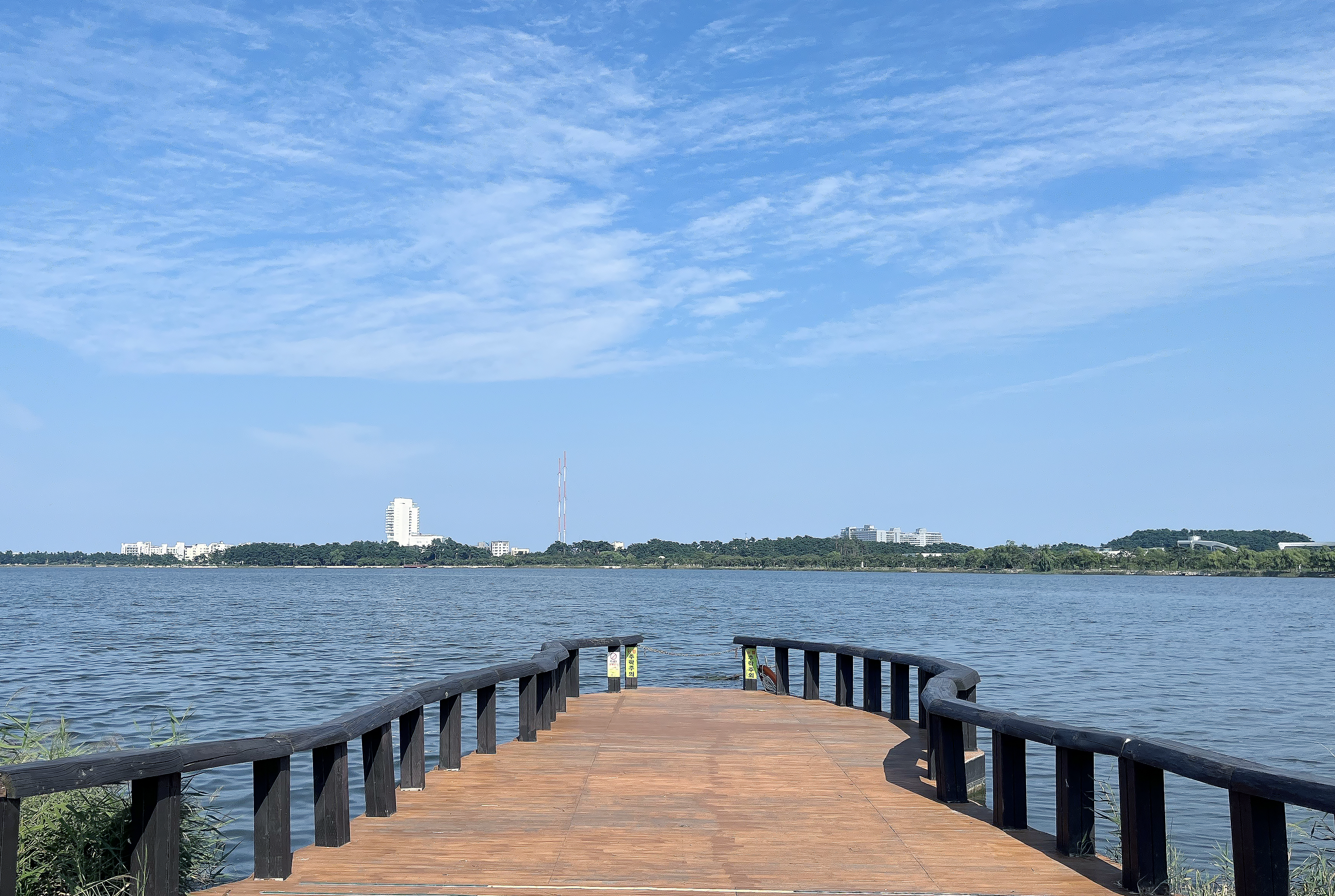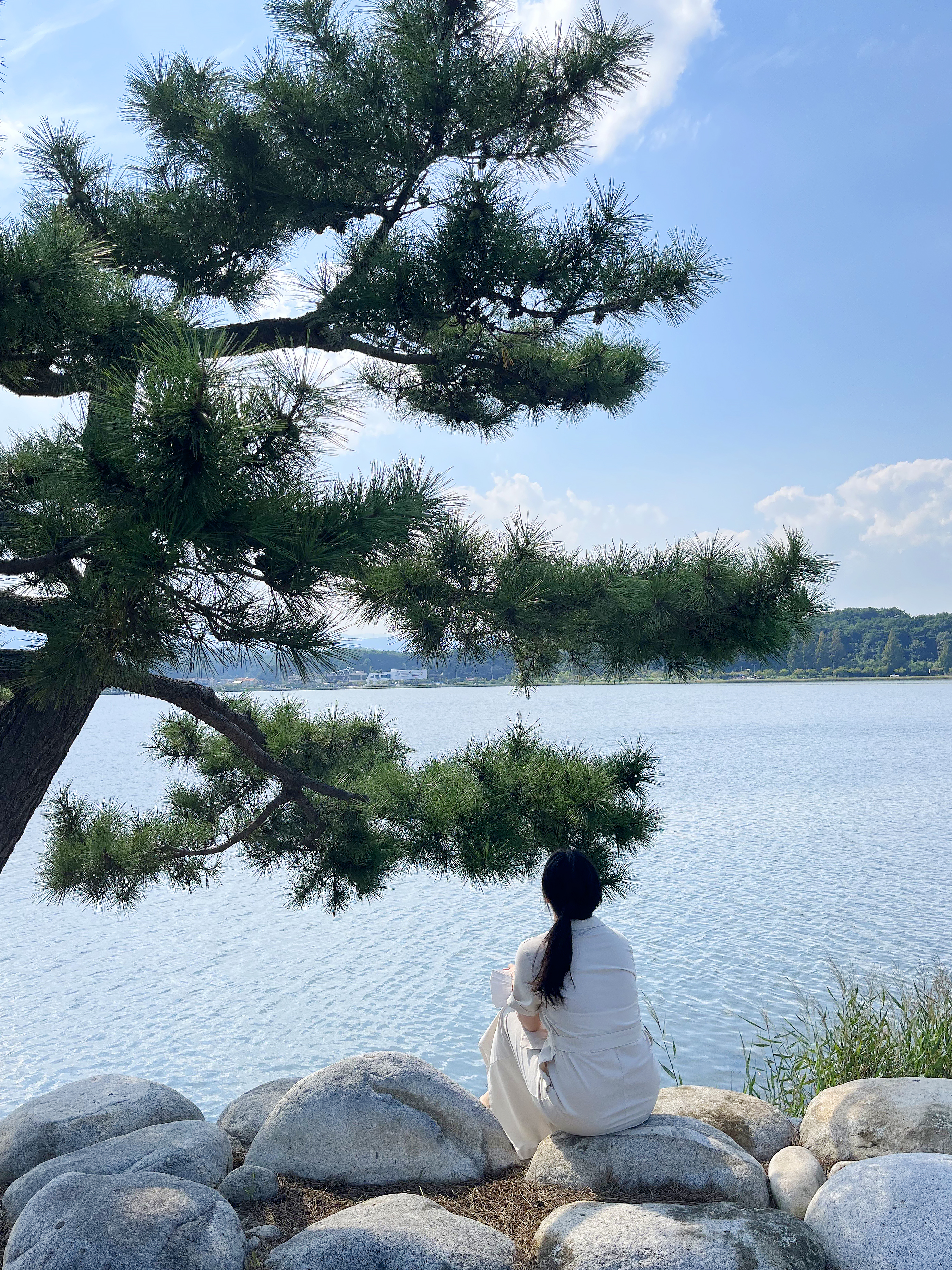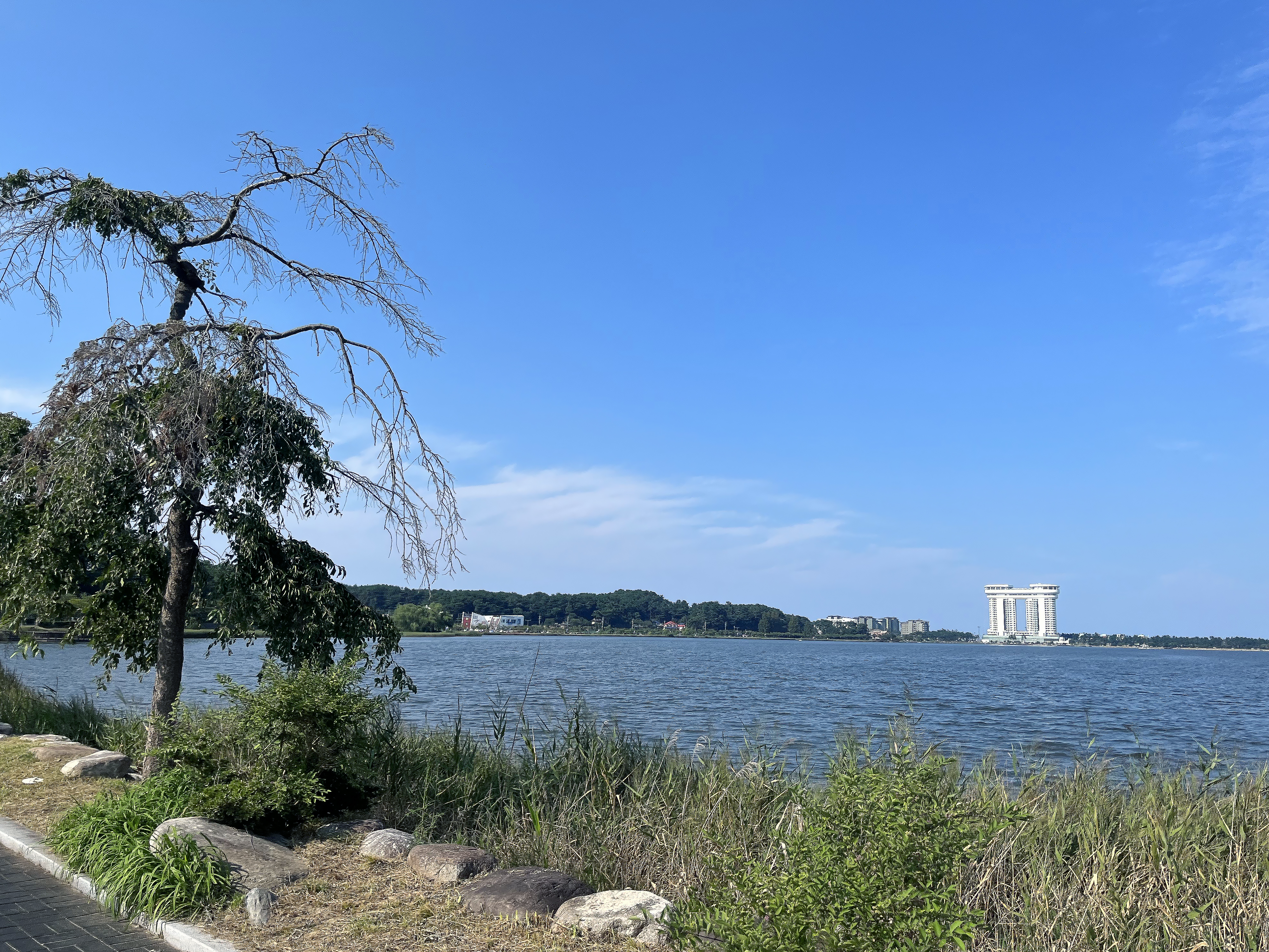 길이 이렇게 널찍하고 양 사이드에 소나무와 벚나무가 가득해 자전거로 달리기에 너무 좋았는데요. 일상에서 느낄 수 없던 편안하고 한적한 기분이 좋아 잠시 내려 걸어도 좋을 것 같았습니다. 실제로 이 일대의 주민이라면 아침 조깅이나 주말 운동을 바로 이 경포호를 한 바퀴 도는 것으로 해도 정말 좋겠다 싶어요. 작은 하천들이 흘러들어 만들어낸 큰 규모의 경포호는 한때 지름 주위 12km에 달하는 큰 호수였는데 지금은 둘레가 약 4km 정도로 축소되고 그 수심도 1-2미터 수준으로 얕아졌다고 합니다. 아무래도 유속에 의해 흘러온 흙에 의해 그 주위가 점차 매워졌기 때문이겠죠?