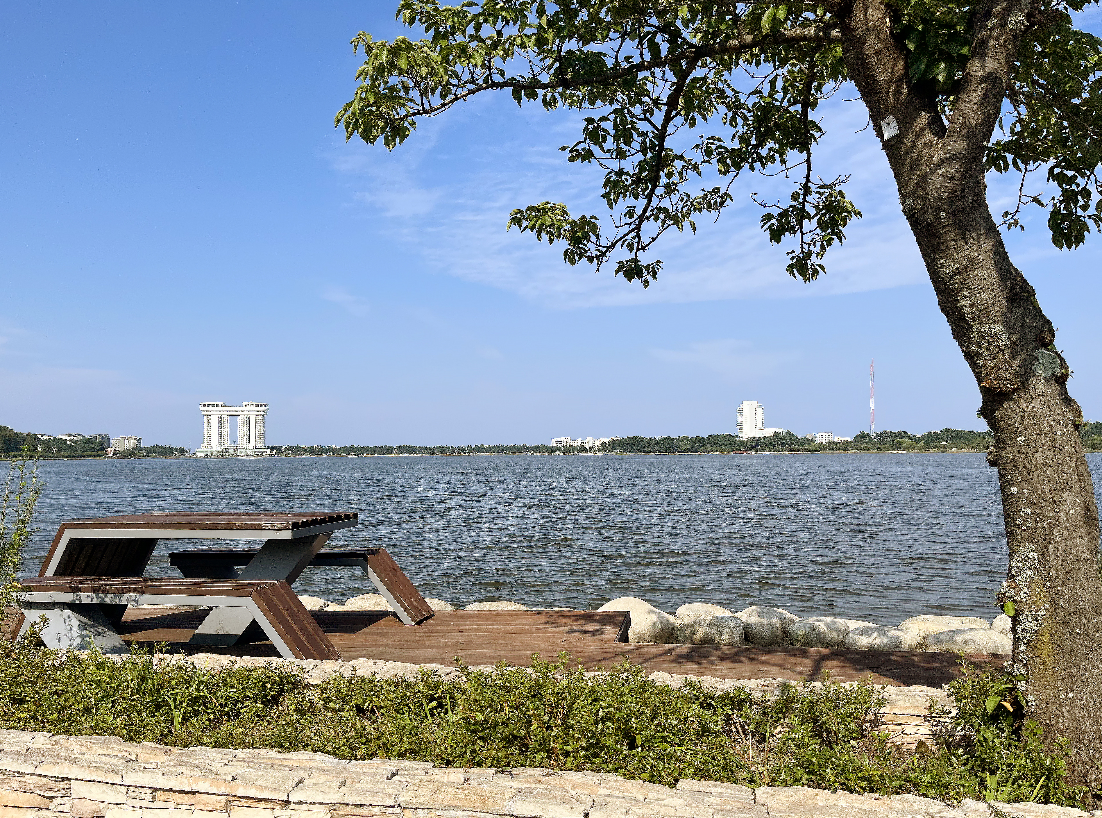 약 4km 정도의 둘레를 자전거를 타고 돌아오는 시간은 자전거만 열심히 타면 1시간도 안 걸릴 것 같습니다. 중간중간 자전거에서 내려 사진도 찍고, 놀이 기구도 타보고, 연꽃밭도 들르면서 천천히 돌아도 1시간이 걸렸어요. 연꽃이 가득했던 가시연습지를 지나면 잠시 앉아 쉬거나 도시락을 까먹어도 좋을 나무 테이블도 몇 준비되어 있었습니다.