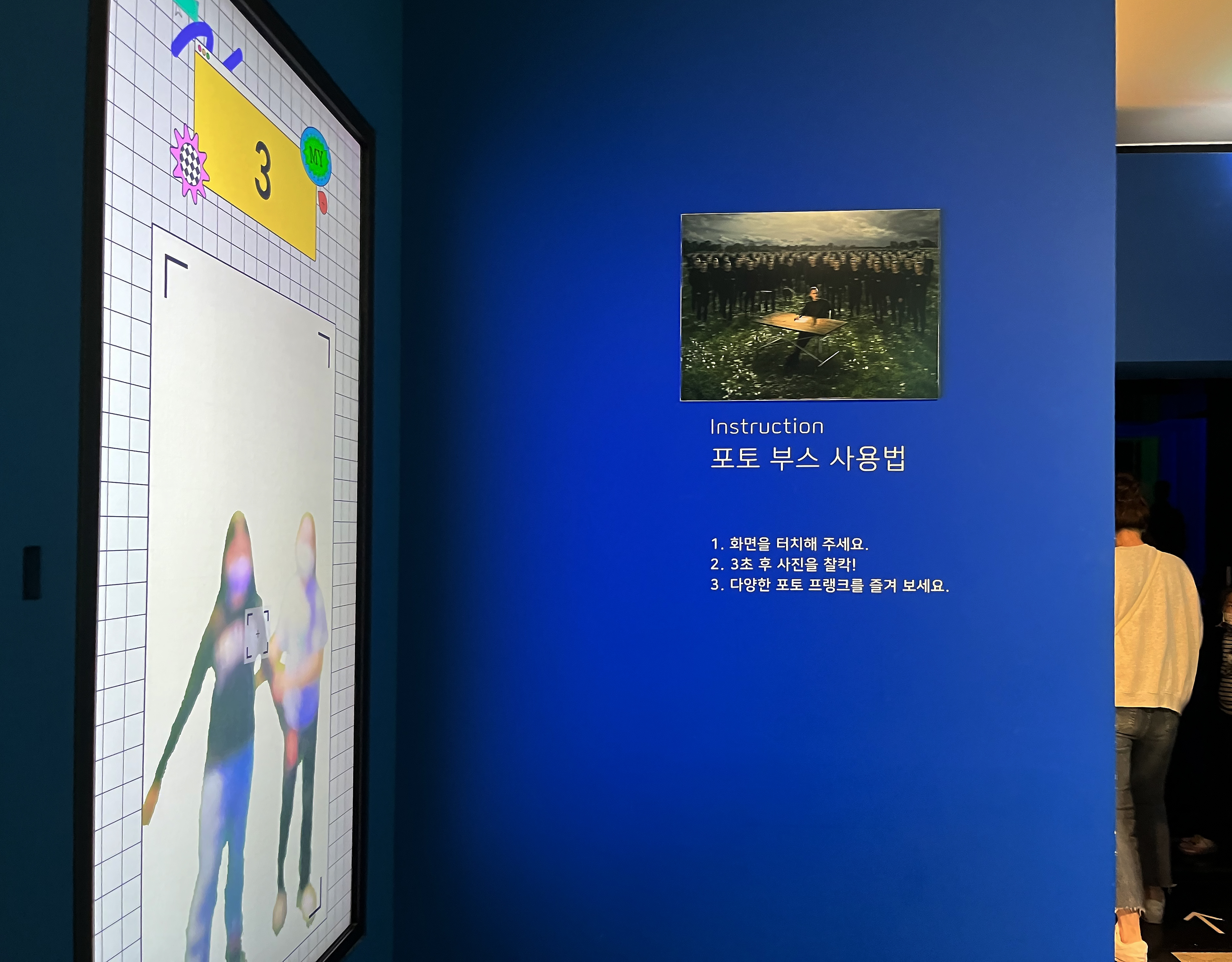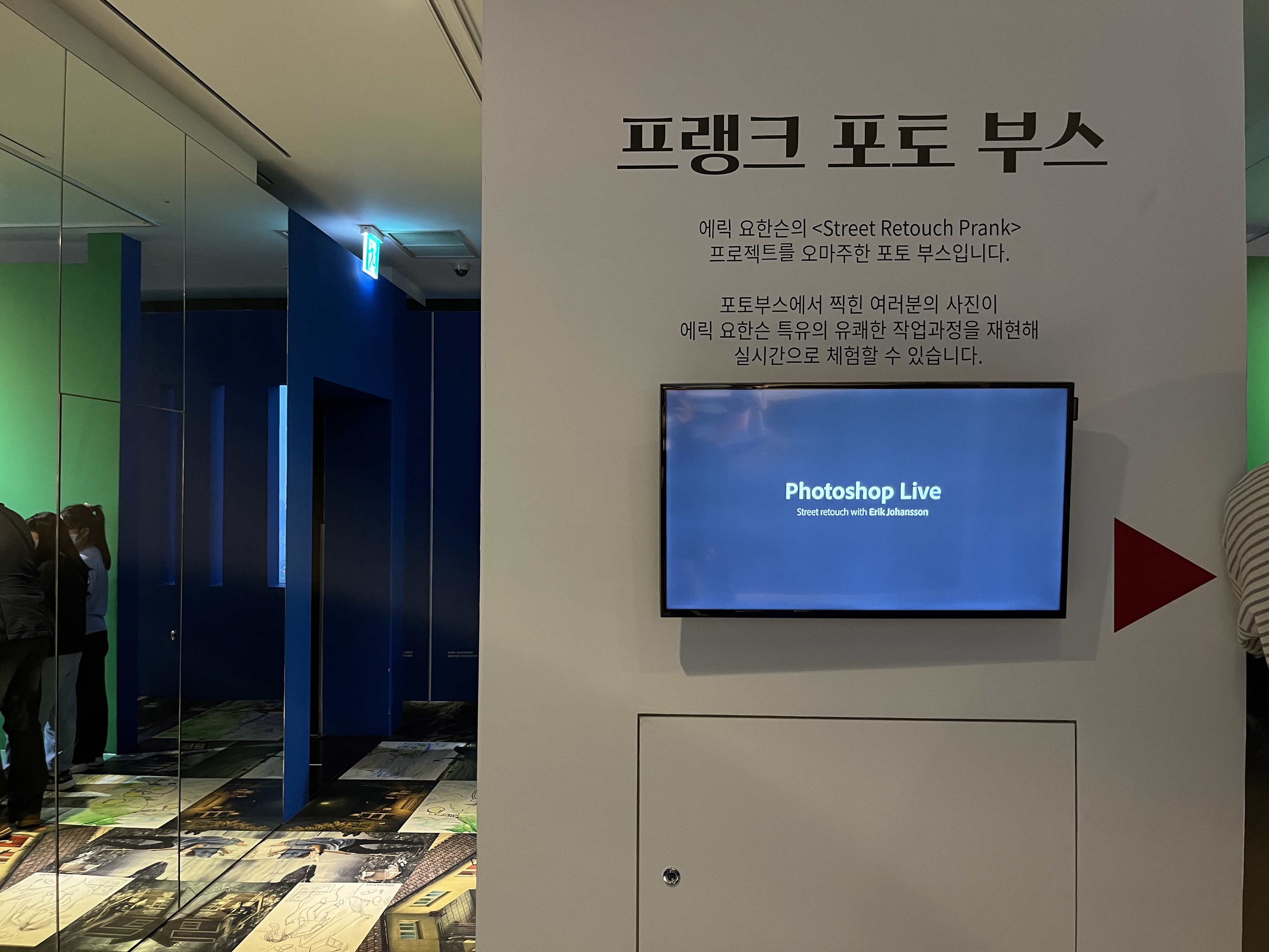 가장 인상 깊었던 공간으로 꼽고 싶은 곳은 바로 ‘프랭크 포토 부스’ 였어요. 누끼 이미지로 만들어지기 쉽게 녹색의 포토월 앞에 서서 촬영을 하면, 기기가 사진 속 내 모습을 오려내어 에릭 요한슨의 포토샵 작품 속에 등장시킵니다. 꽃밭에 사람이 무한복제되는 결과로 나오기도 하고 옆으로 자라난 나무의 기둥에 서서 360도 회전하고 있는 모습이 영상으로 완성되기도 합니다,