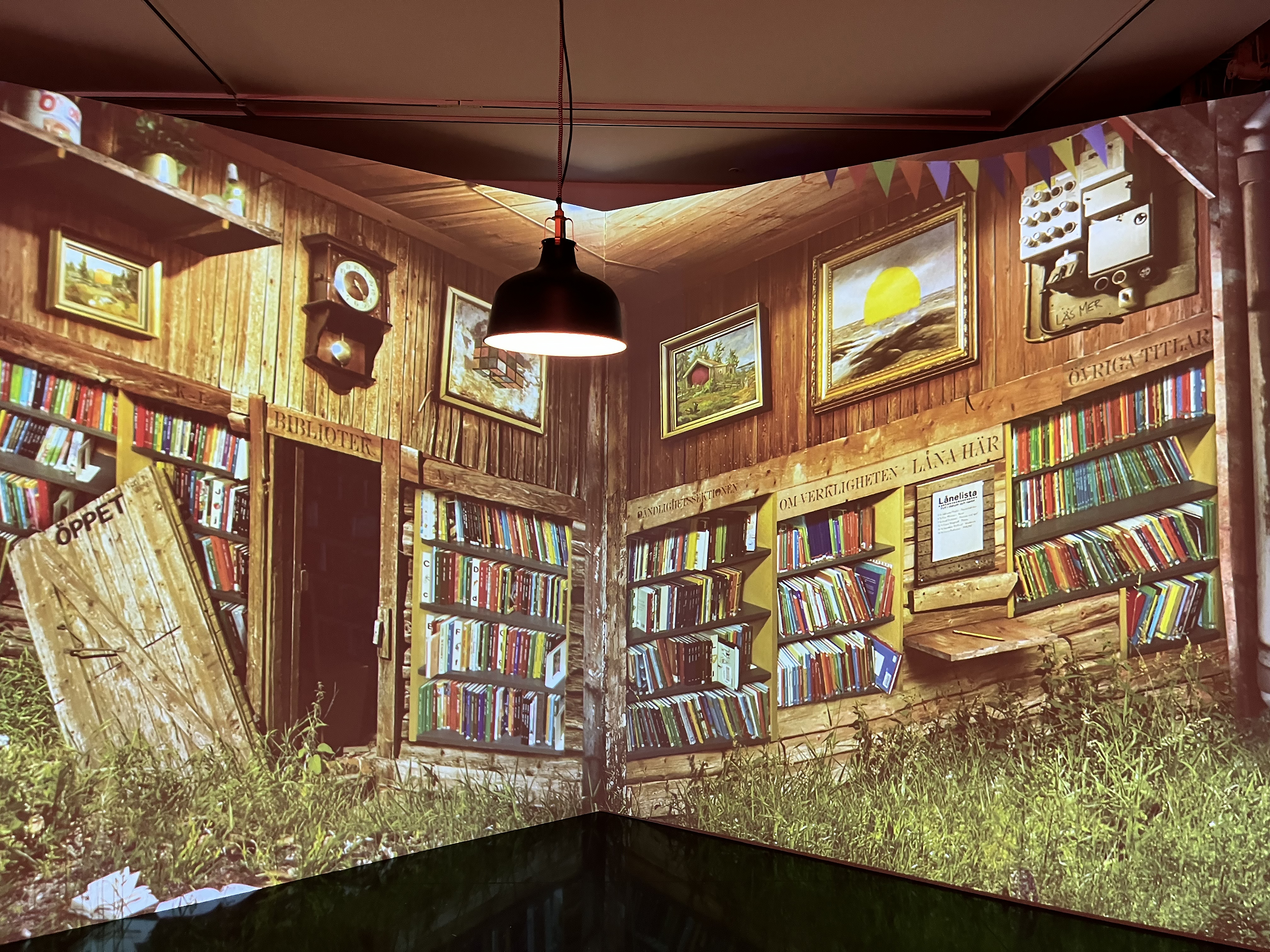 그리고 바로 옆 칸으로 넘어가면 프로젝터가 투사되고 있는 빈 공간이 나타납니다. 이 벽의 앞에는 전등이 하나 켜져 있어요. ‘스위치 포토 월’이라는 이름의 이 공간은 전등 밑에 손을 가져다 대면 이 대형 미디어 월이 다음 작품으로 넘어가게 기획됐다고 하는데요. 커다란 미디어 월 앞에 선 채로 서 있으면 마치 에릭 요한슨의 작품 속 주인공이 된 것 같은 느낌이 들기도 한답니다.